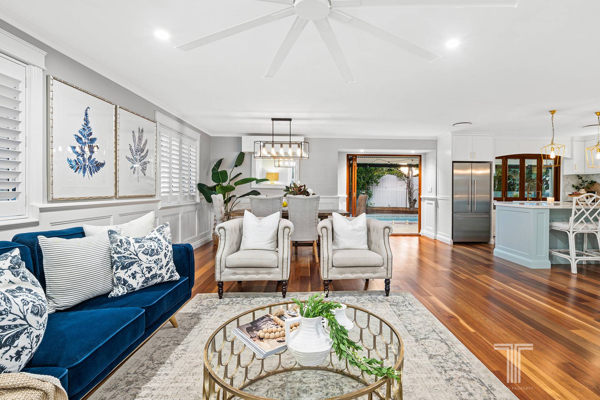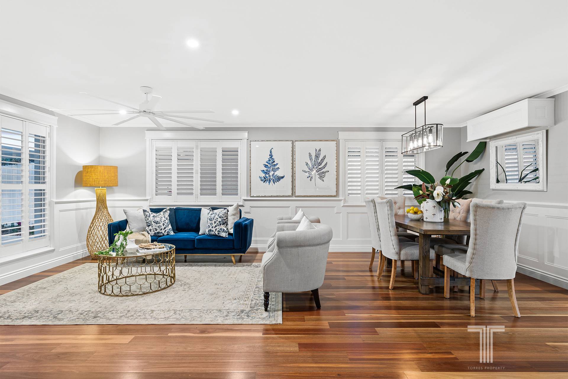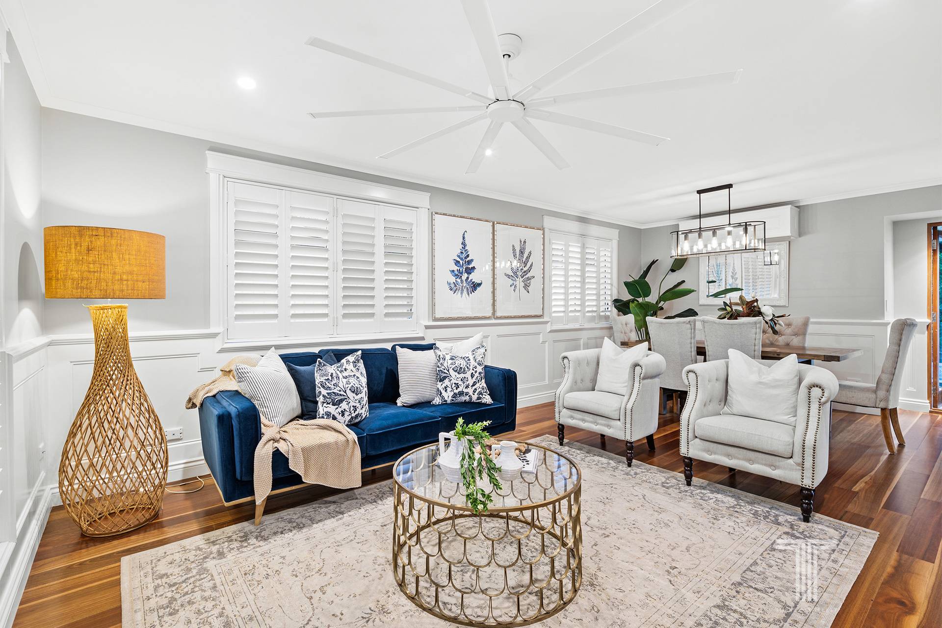 The living and dining area unveils an open design featuring wainscoting and a large ceiling fan. The adjoining kitchen exudes exceptional style and culinary excellence with a farmhouse sink, DeLonghi oven and a gas cooktop. Infused with colour and elegance, the marble tile splashback blends flawlessly with the pendant lights, gold handleware and bi-fold servery window.