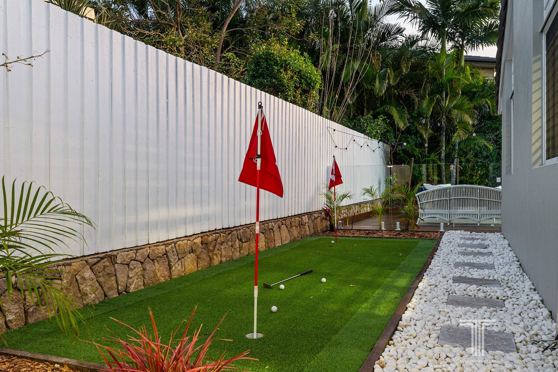 Outside presents a private oasis with a sunlit timber deck and an undercover patio featuring fans, lights and screens. Perfect for entertaining, lounging and resort-style fun, this alfresco retreat plays host to a glass-framed swimming pool, putting green, a spacious yard and tropical greenery.