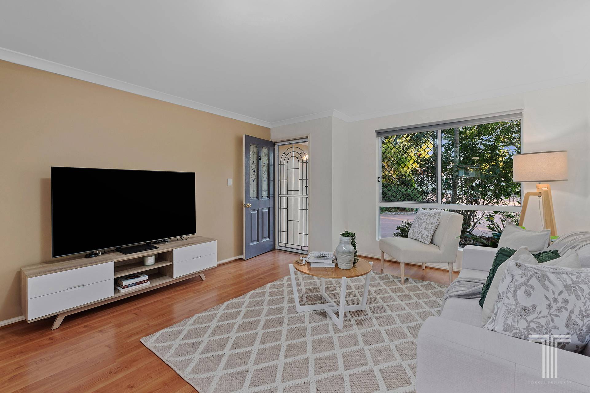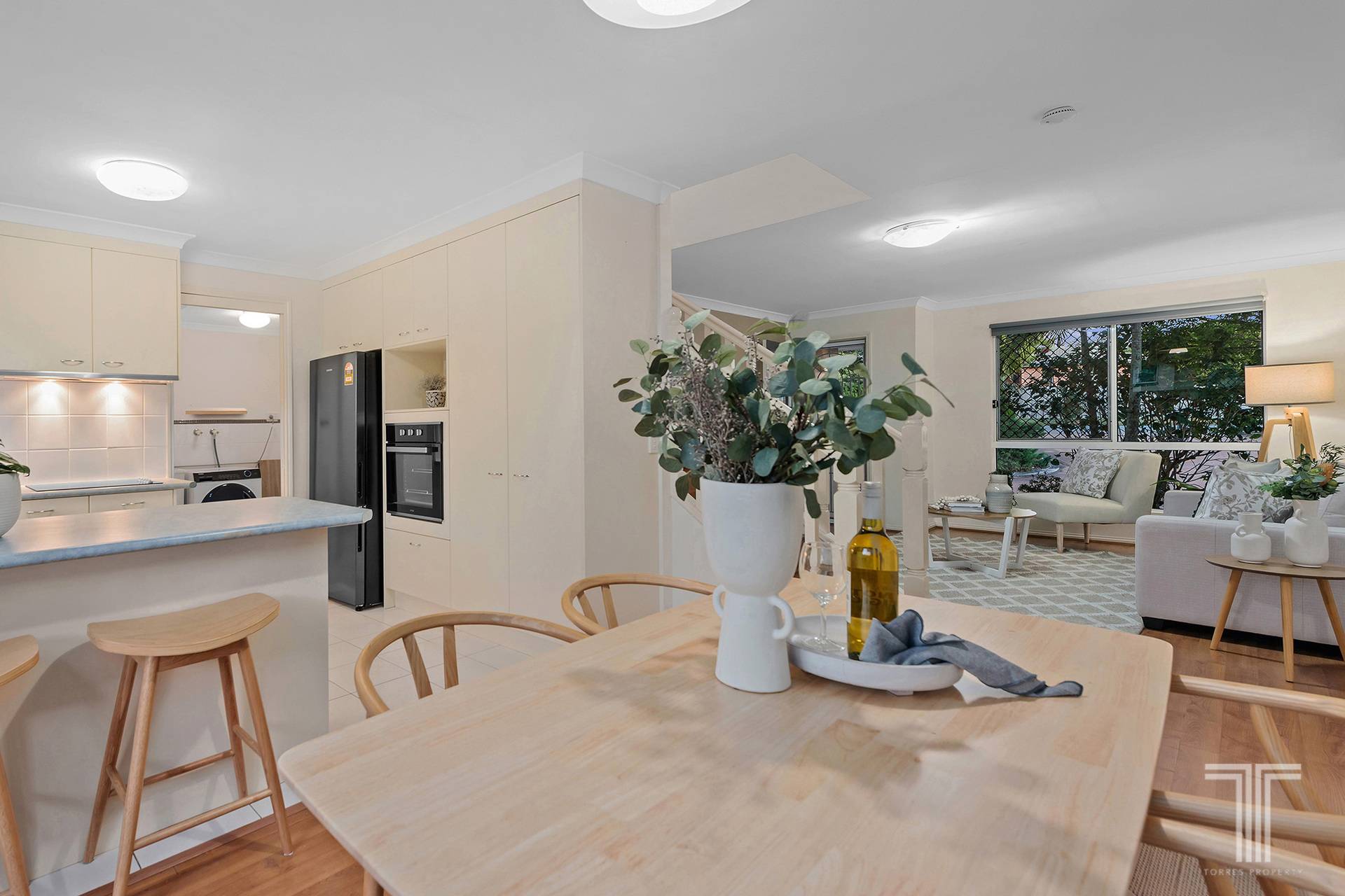 The two-storey floor plan has been thoughtfully designed with a north/south aspect drawing in plenty of natural light. The ground floor is home to a lounge and dining area offering comfort with split system air-conditioning and privacy with leafy gardens beyond the front window. The adjoining kitchen provides form and function with a breakfast bar, ample cabinetry and upgraded appliances.