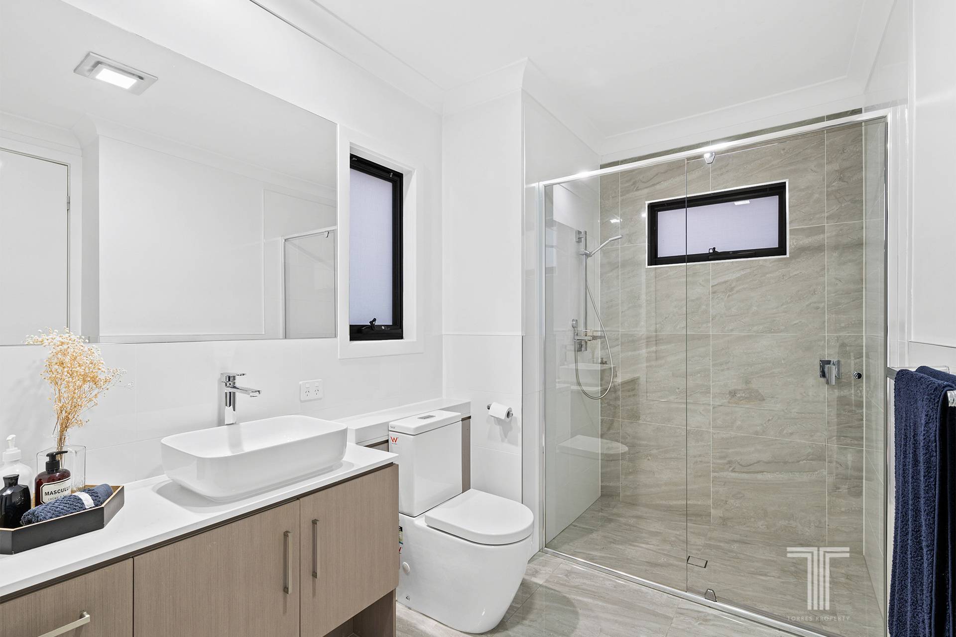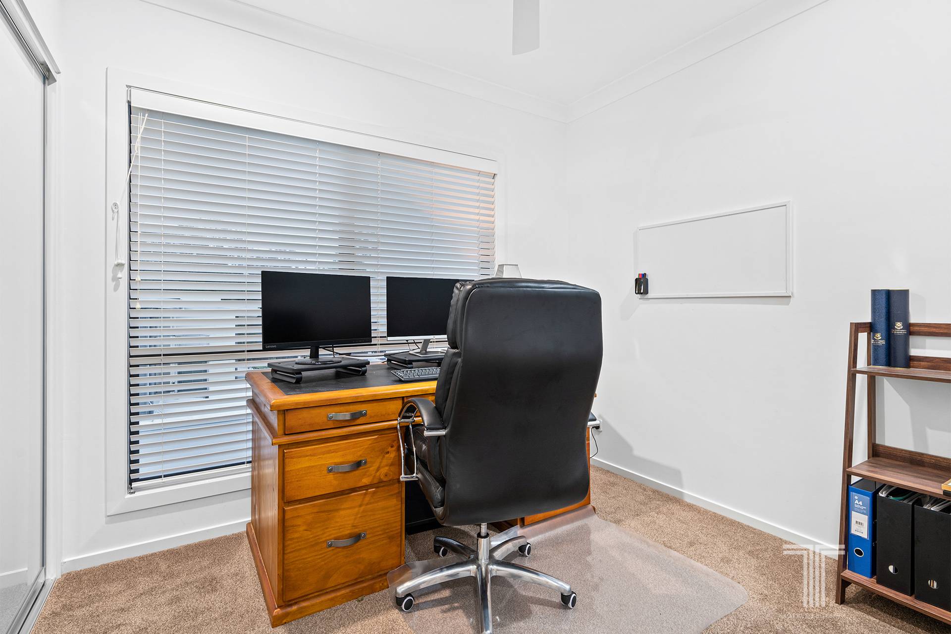 A study offers flexibility with potential to be used as a playroom, a retreat, or a gym while a powder room, a laundry, and a double garage, with a roller door and storage nook, complete this bright and spacious level.