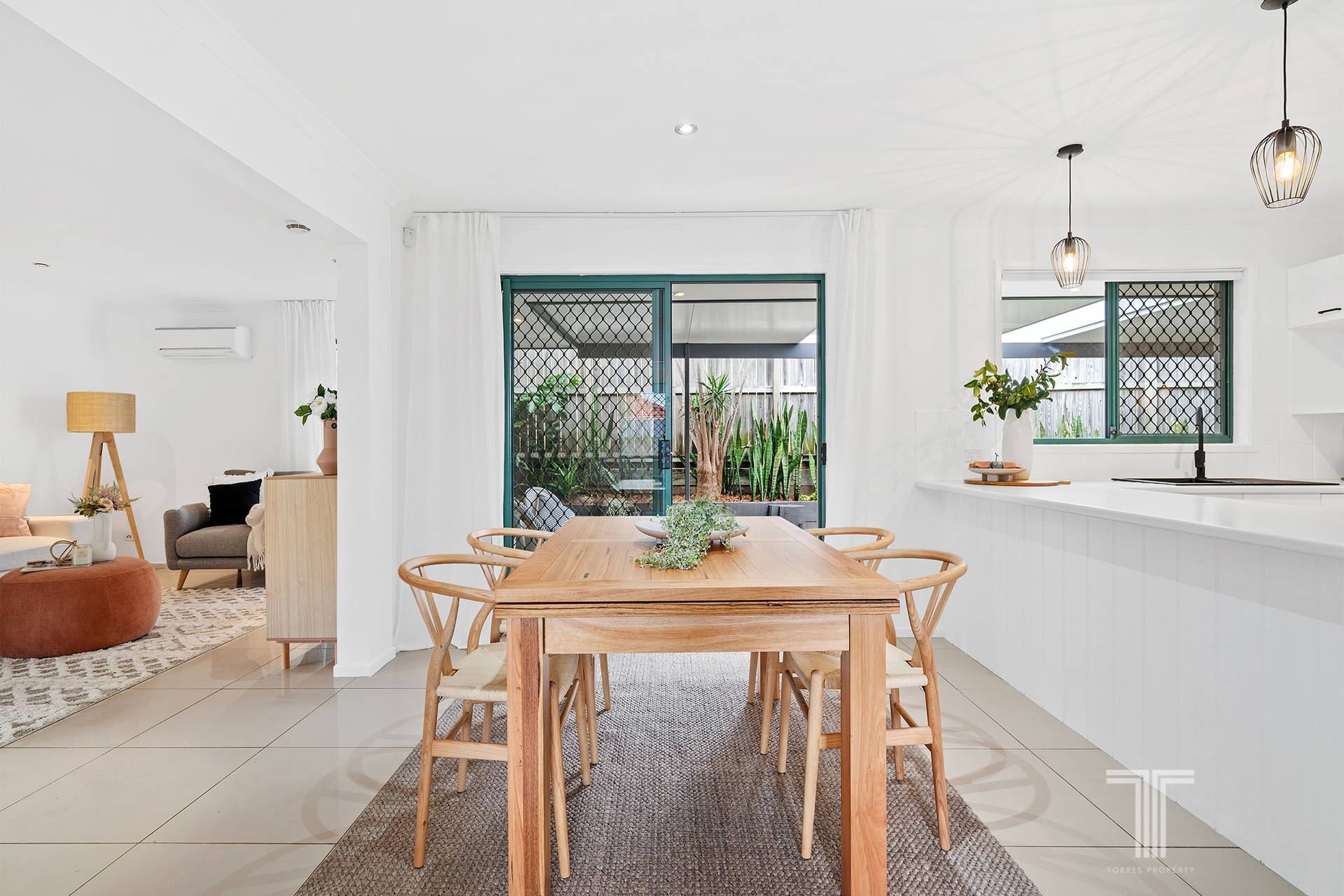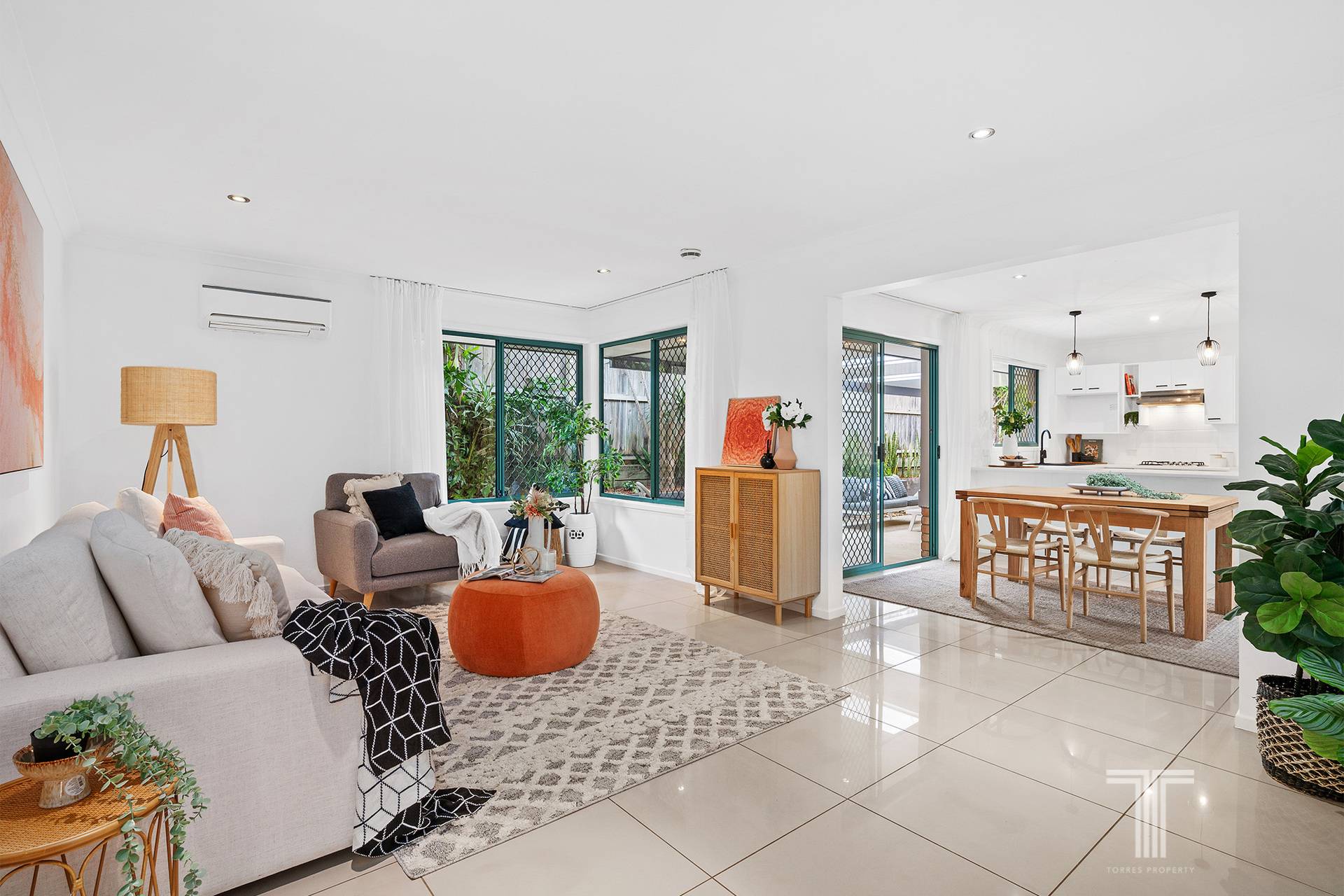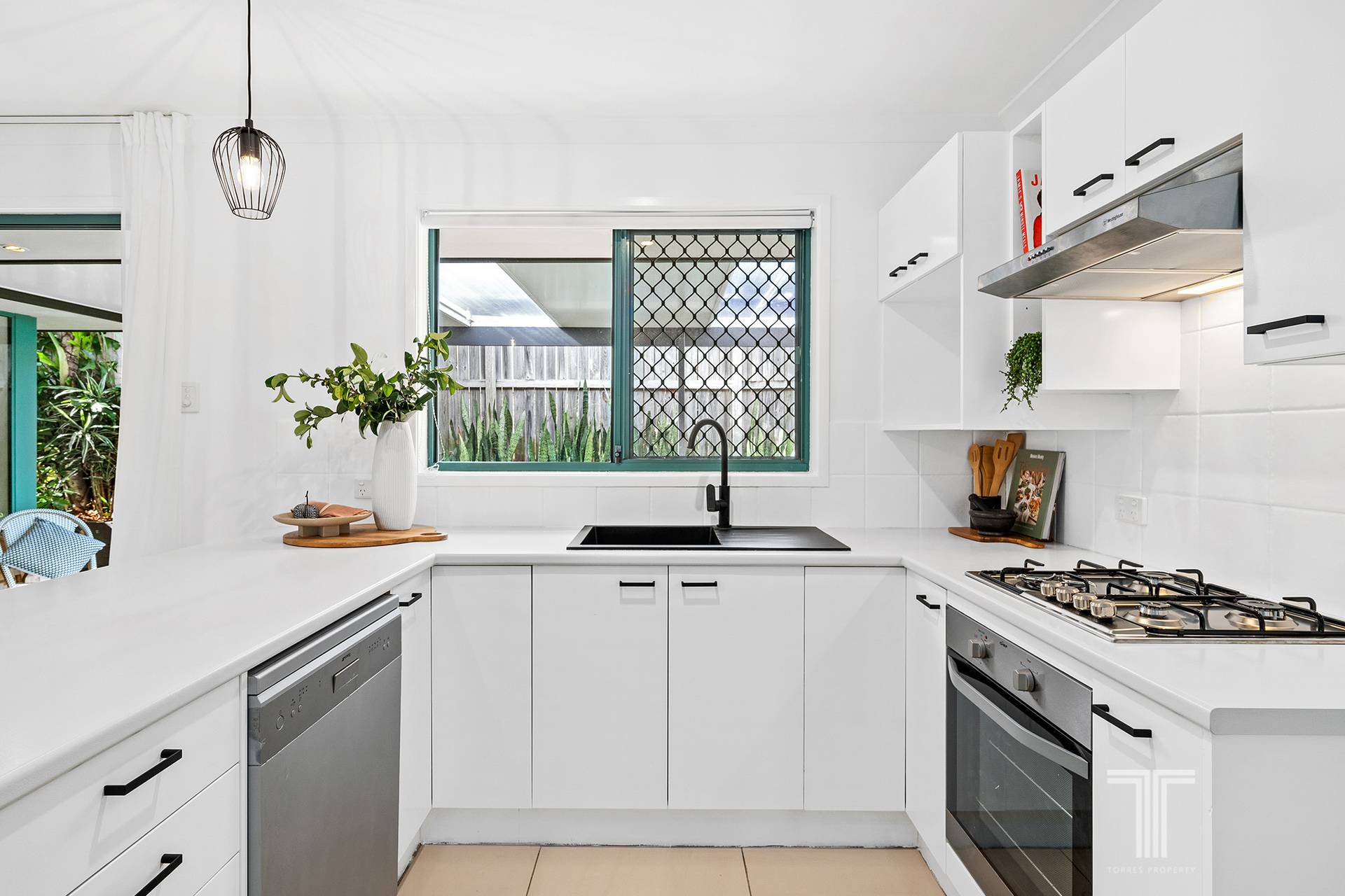 Featuring a flowing single-level design, the home is centred around the open plan lounge and dining area with low-maintenance tiles and air-conditioning to keep you cool all summer long. The stylish kitchen ensures easy meal preparation with stainless steel appliances and white cabinetry accented with feature pendants and matte black fittings.