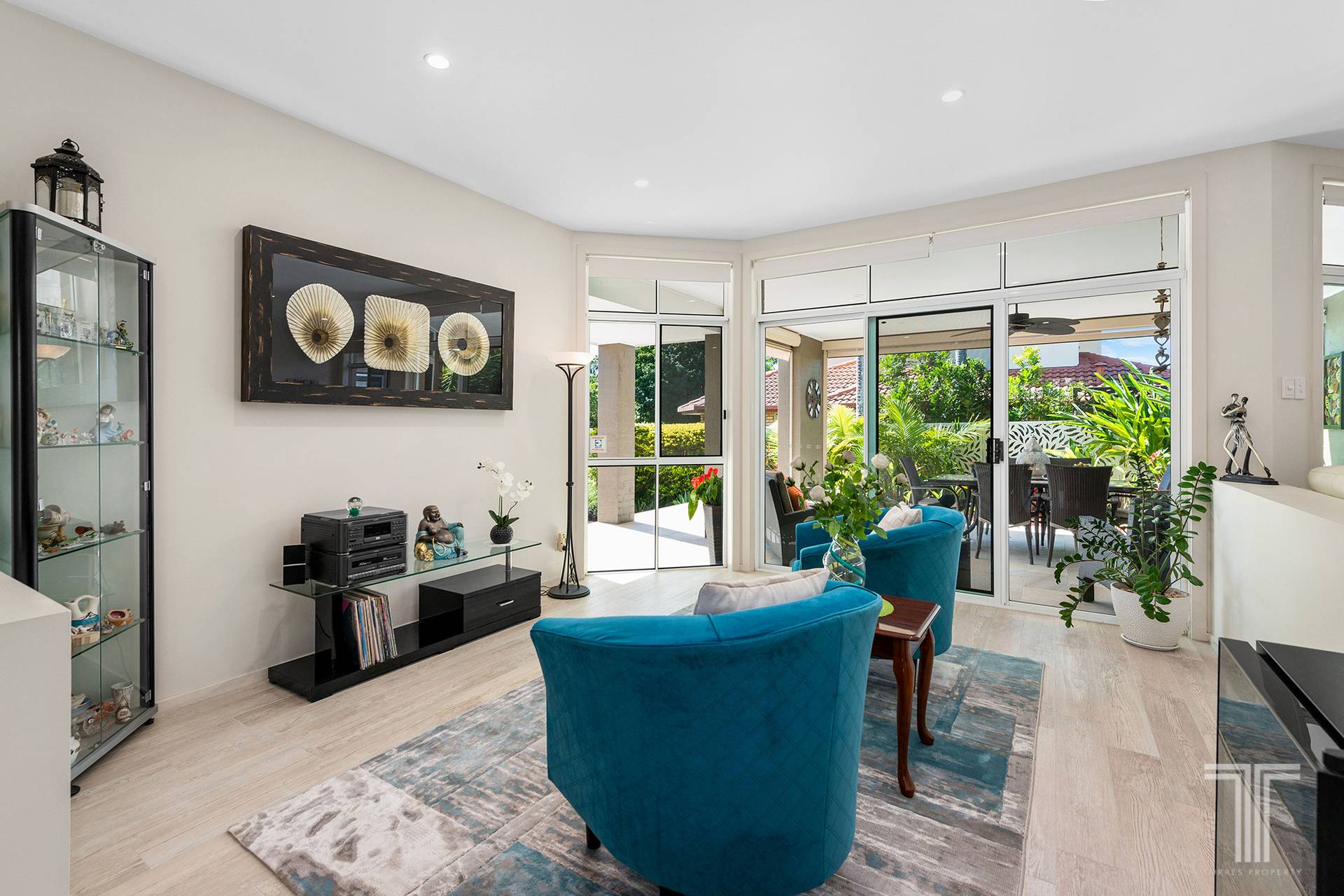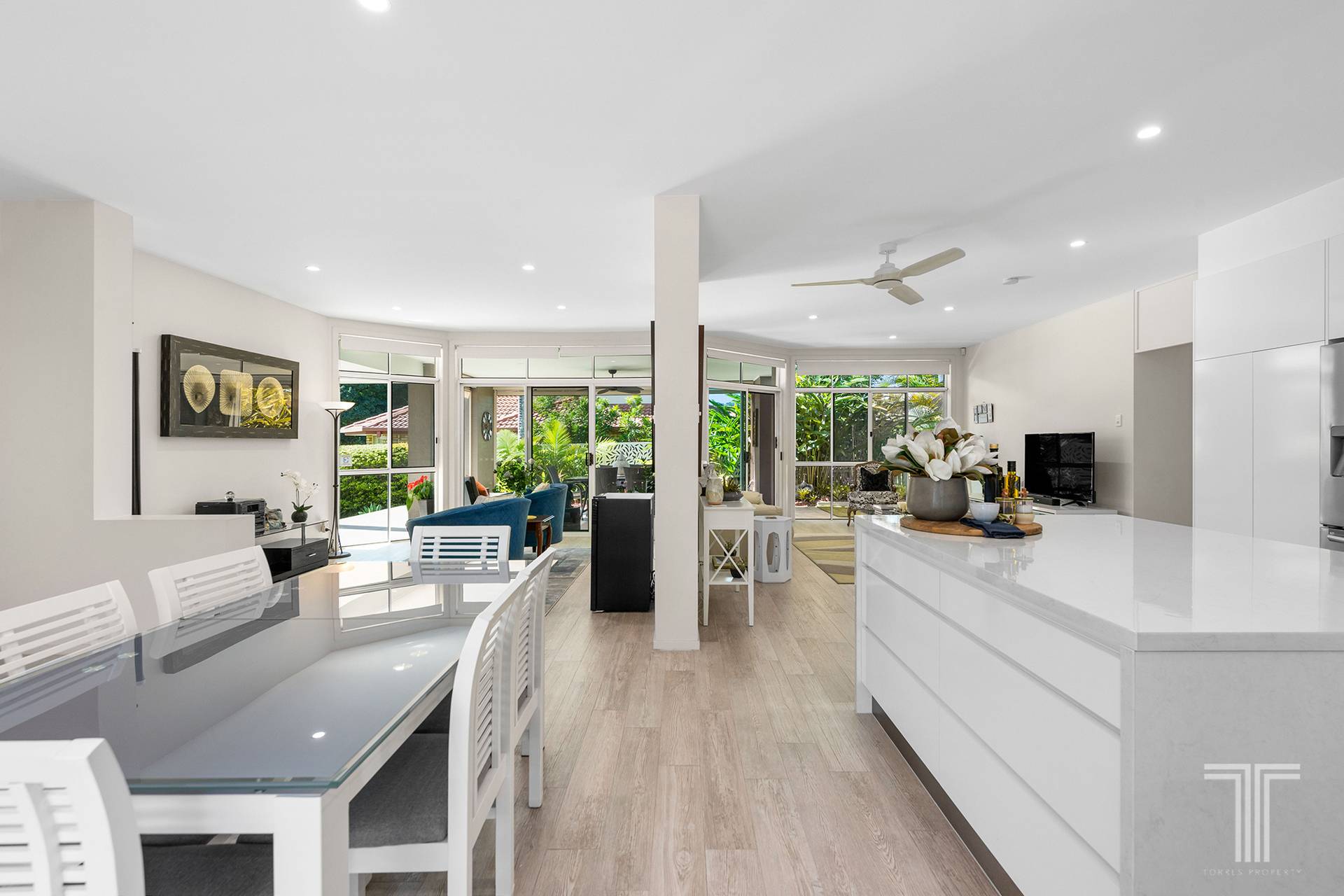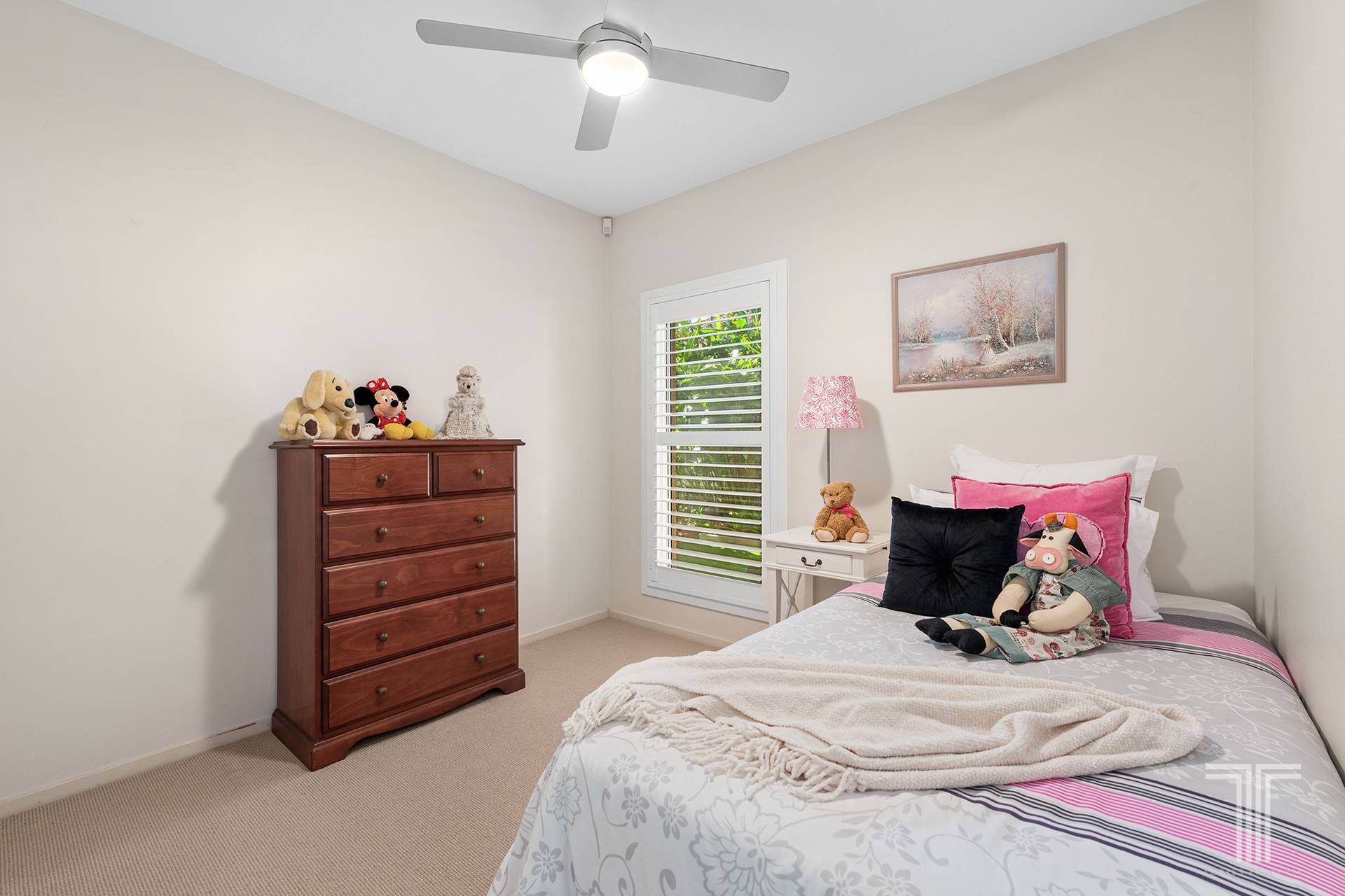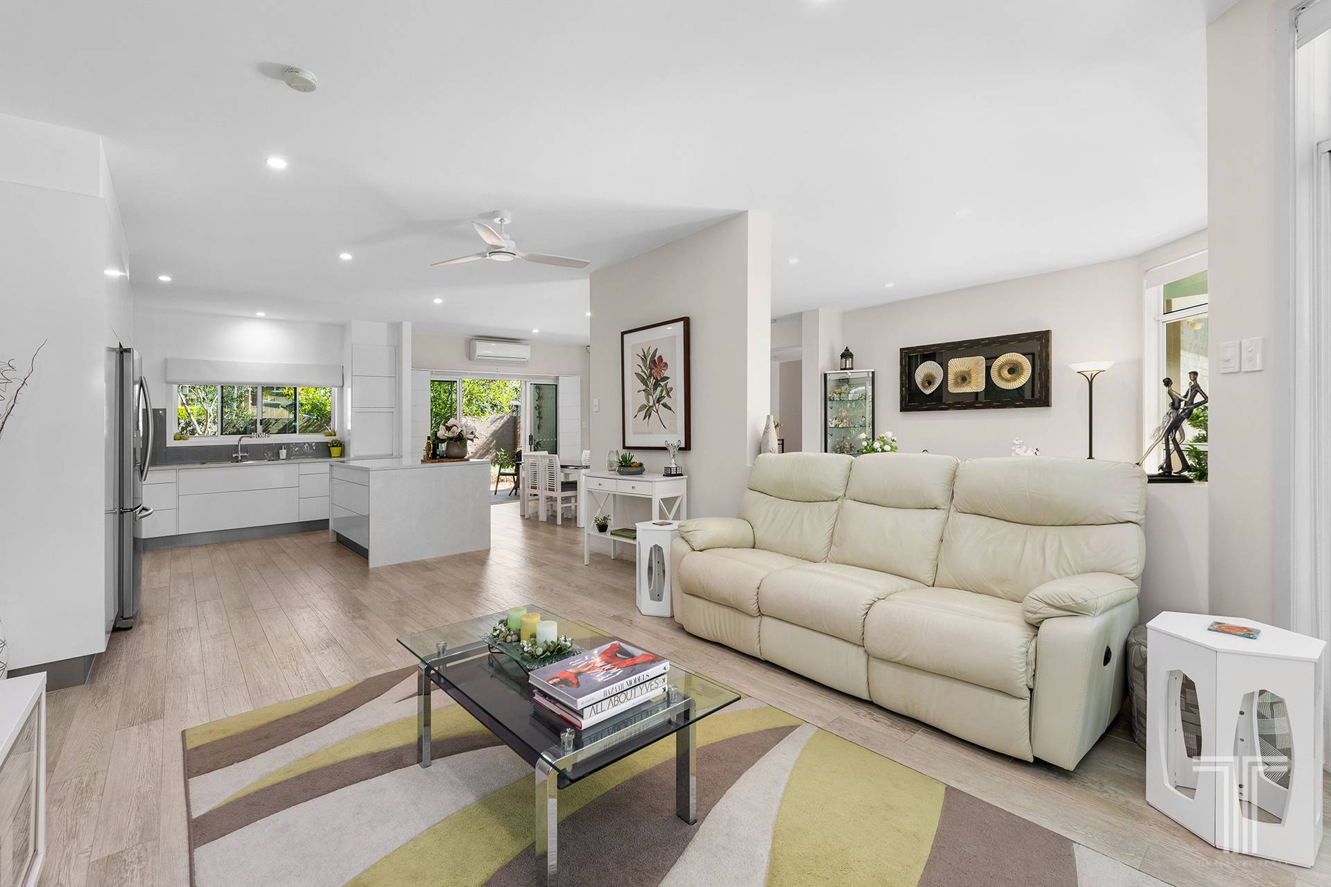 Featuring a spacious, low-set design, the residence offers great separation between the living and bedrooms. The contemporary interiors are complemented by plantation shutters and large glass sliders that invite sunshine and stunning outlooks across the manicured gardens.