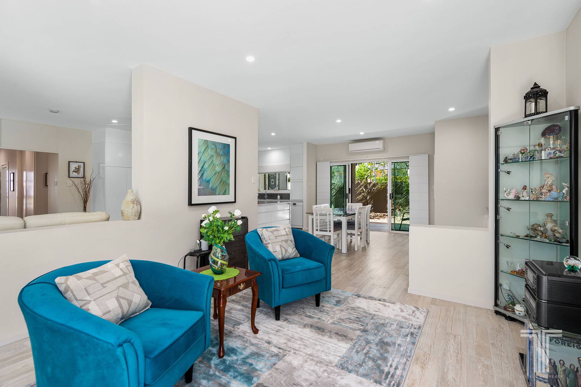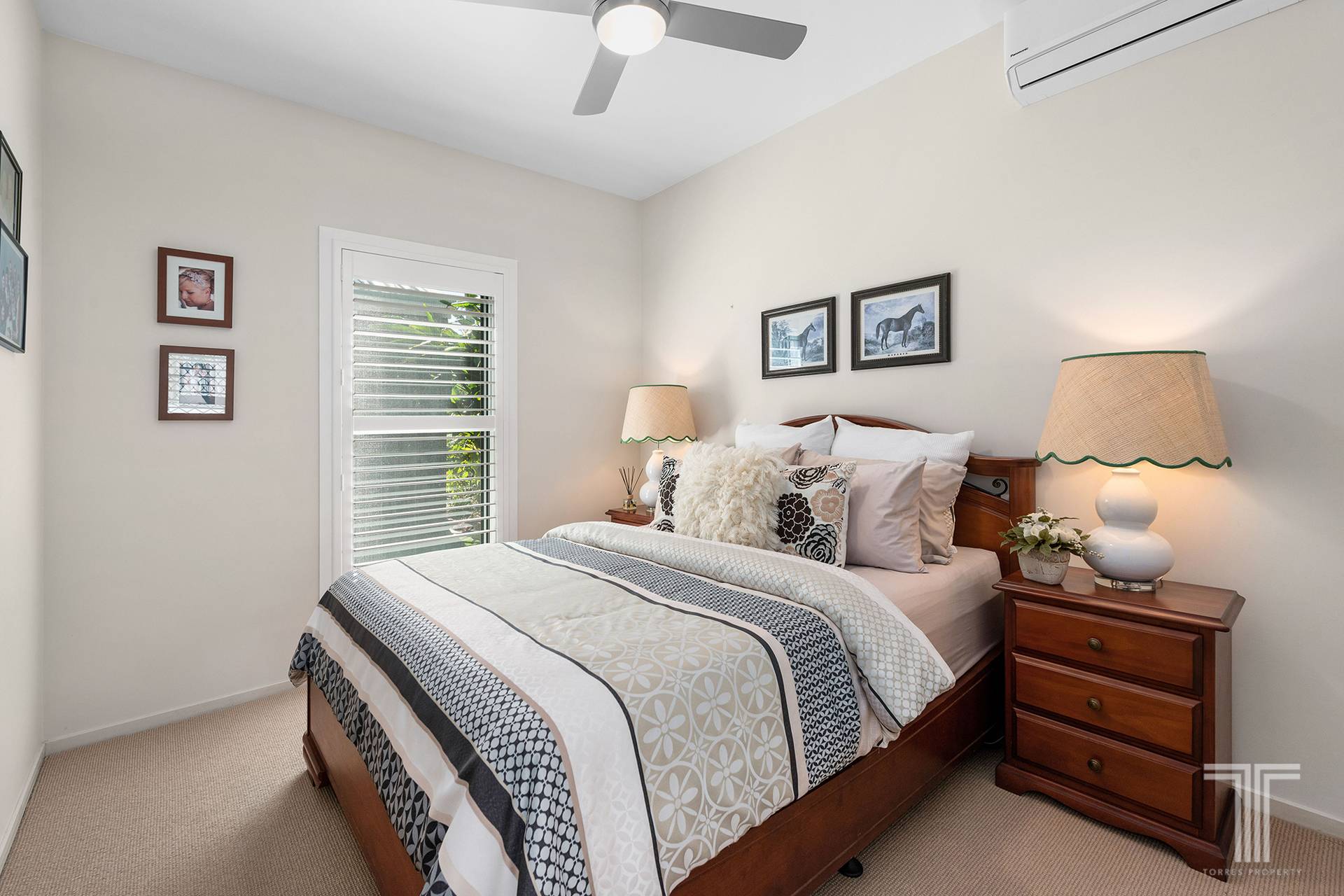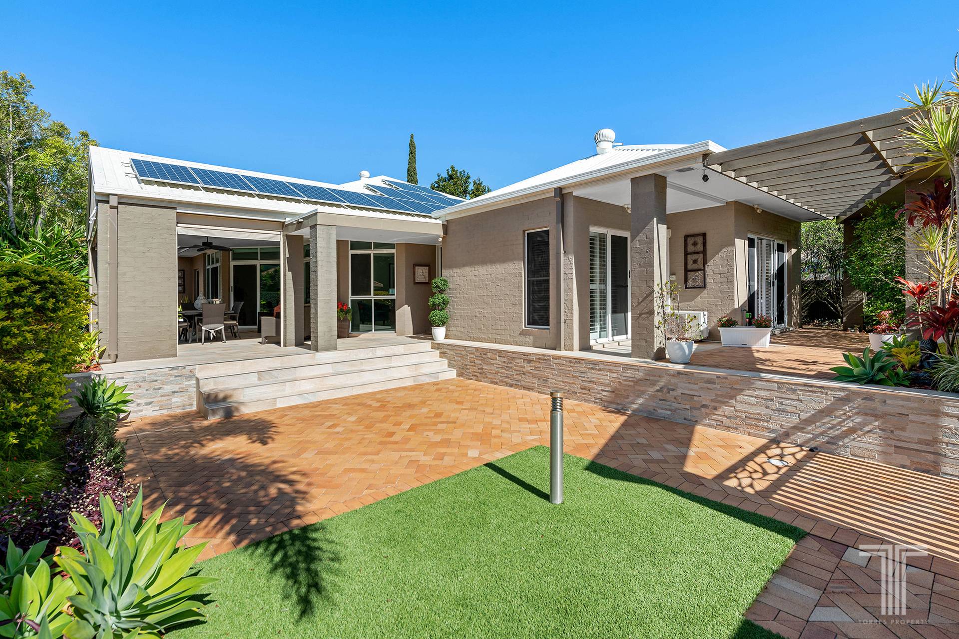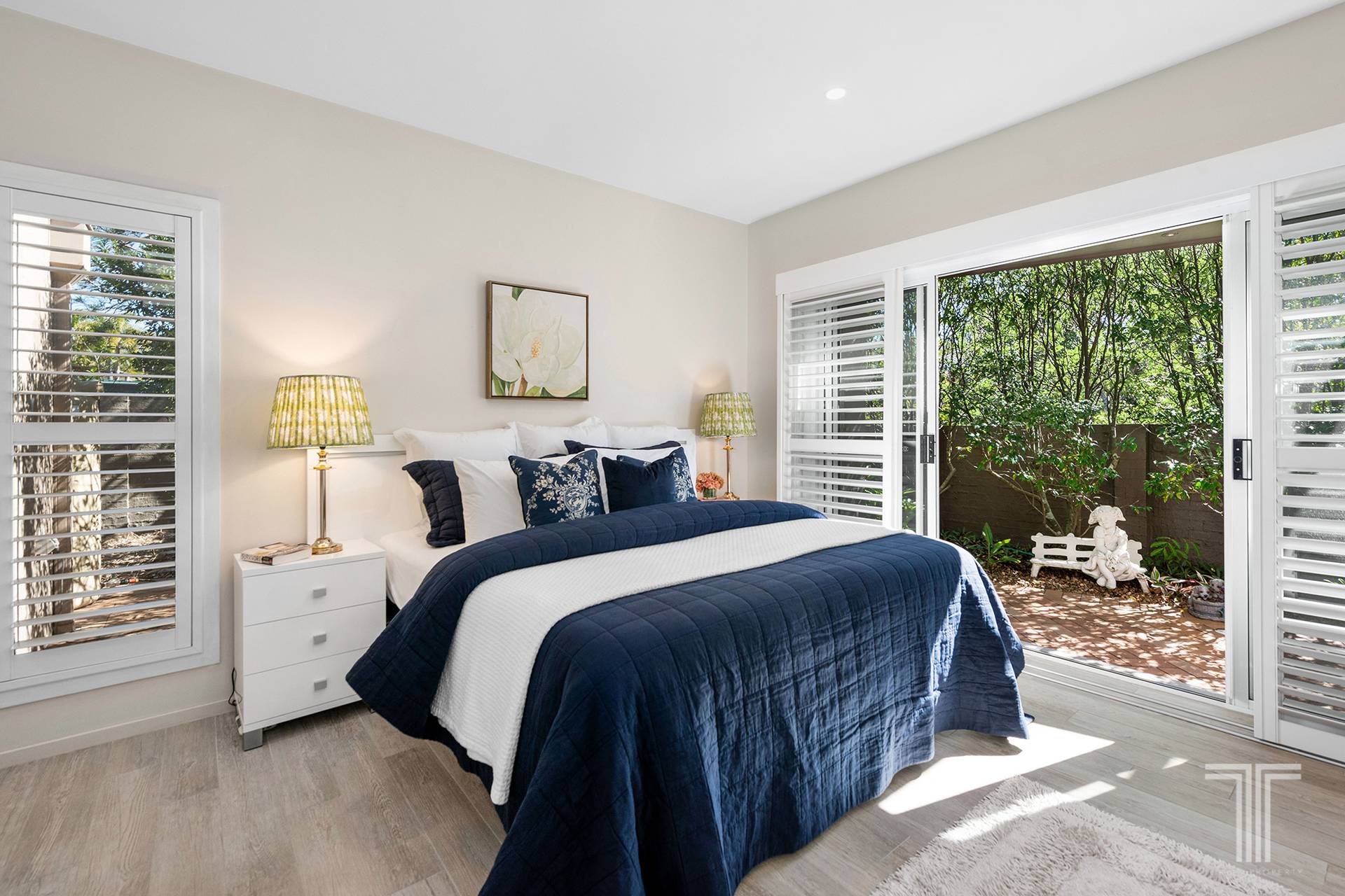 Featuring a spacious, low-set design, the residence offers great separation between the living and bedrooms. The contemporary interiors are complemented by plantation shutters and large glass sliders that invite sunshine and stunning outlooks across the manicured gardens.