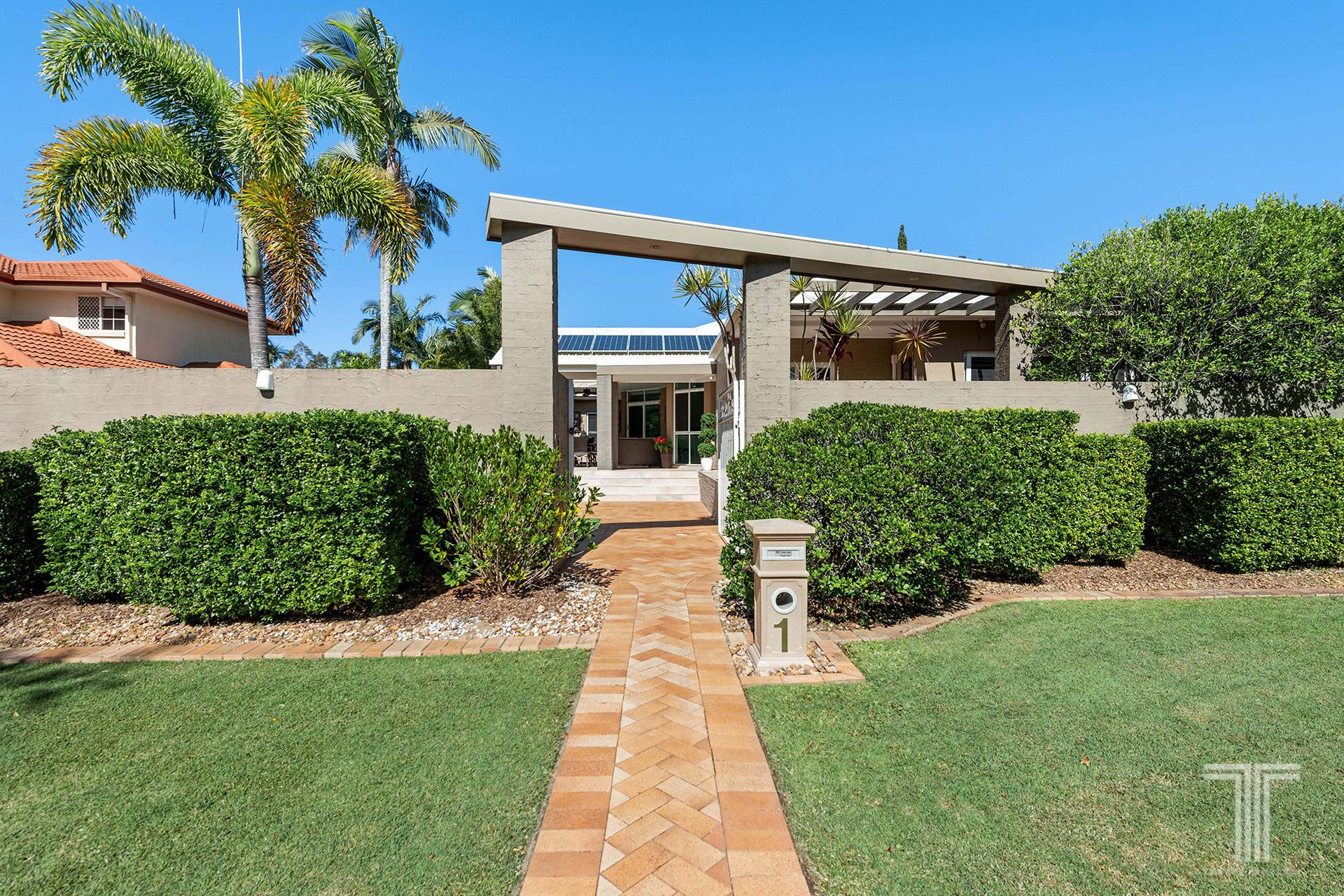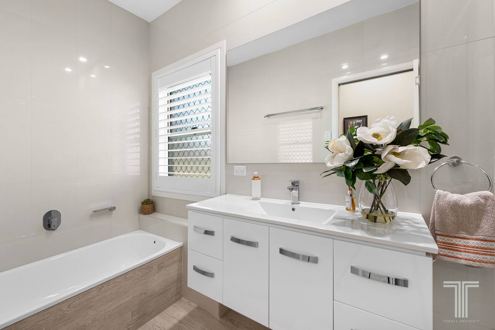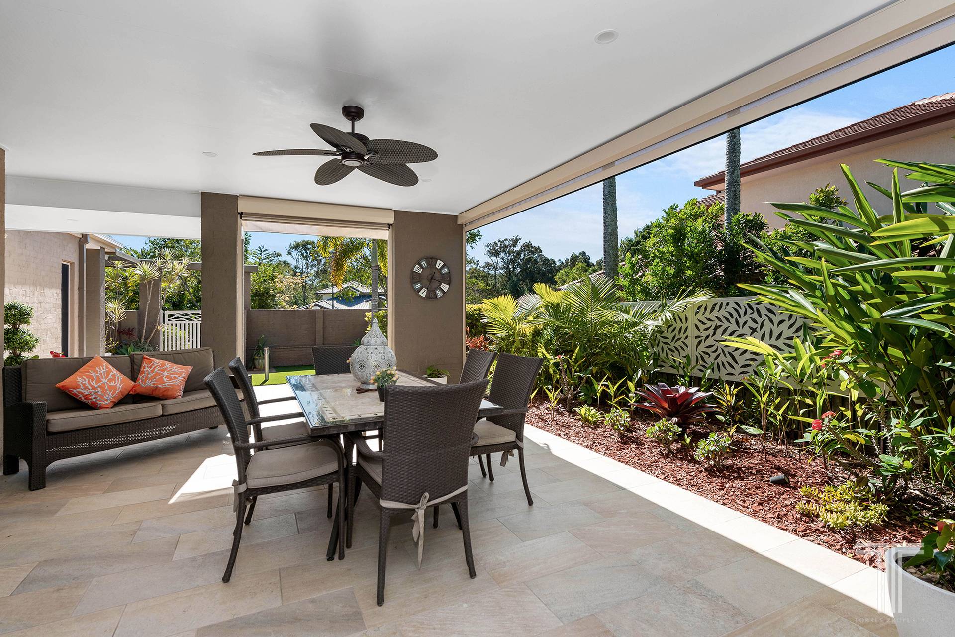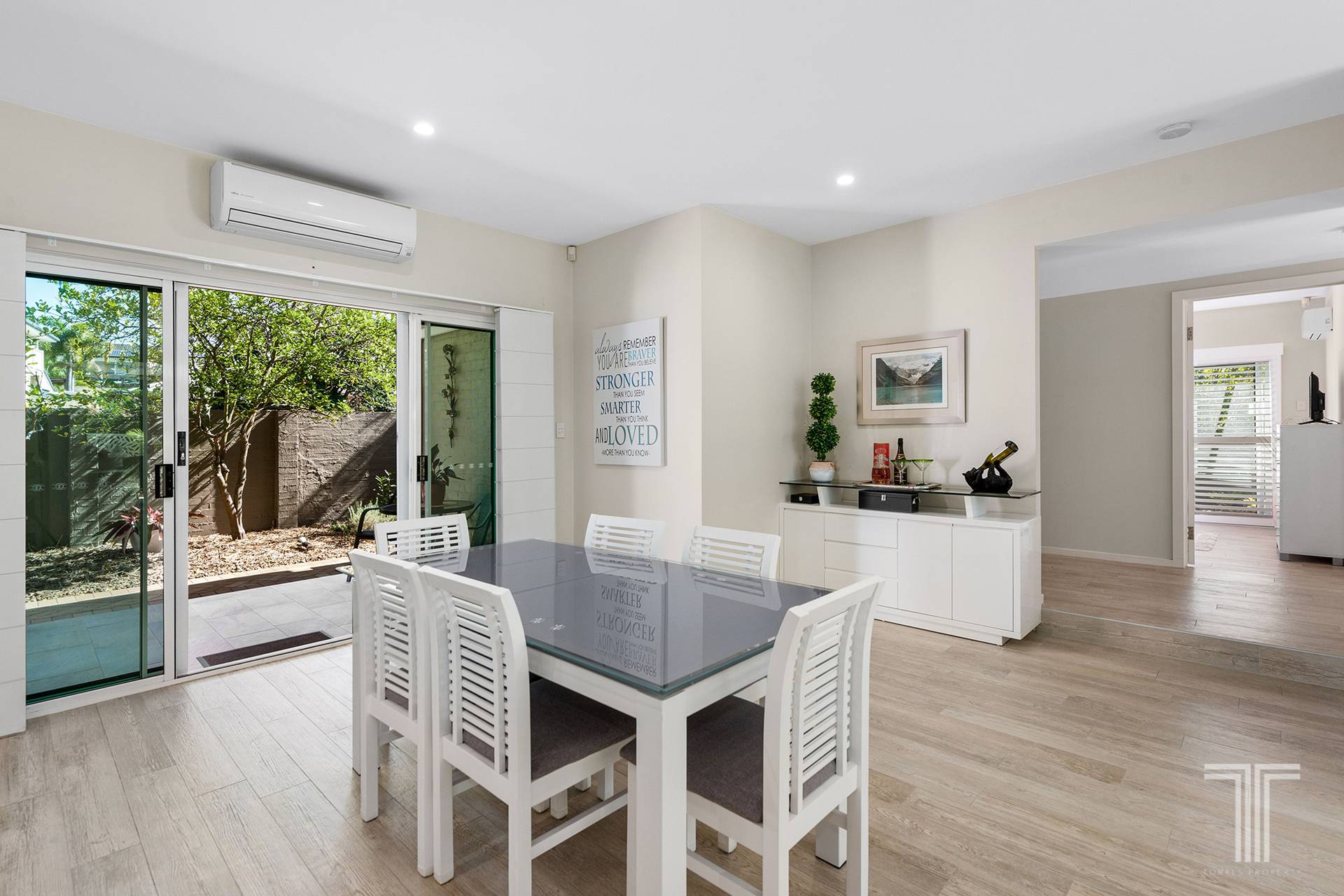 Featuring a spacious, low-set design, the residence offers great separation between the living and bedrooms. The contemporary interiors are complemented by plantation shutters and large glass sliders that invite sunshine and stunning outlooks across the manicured gardens.