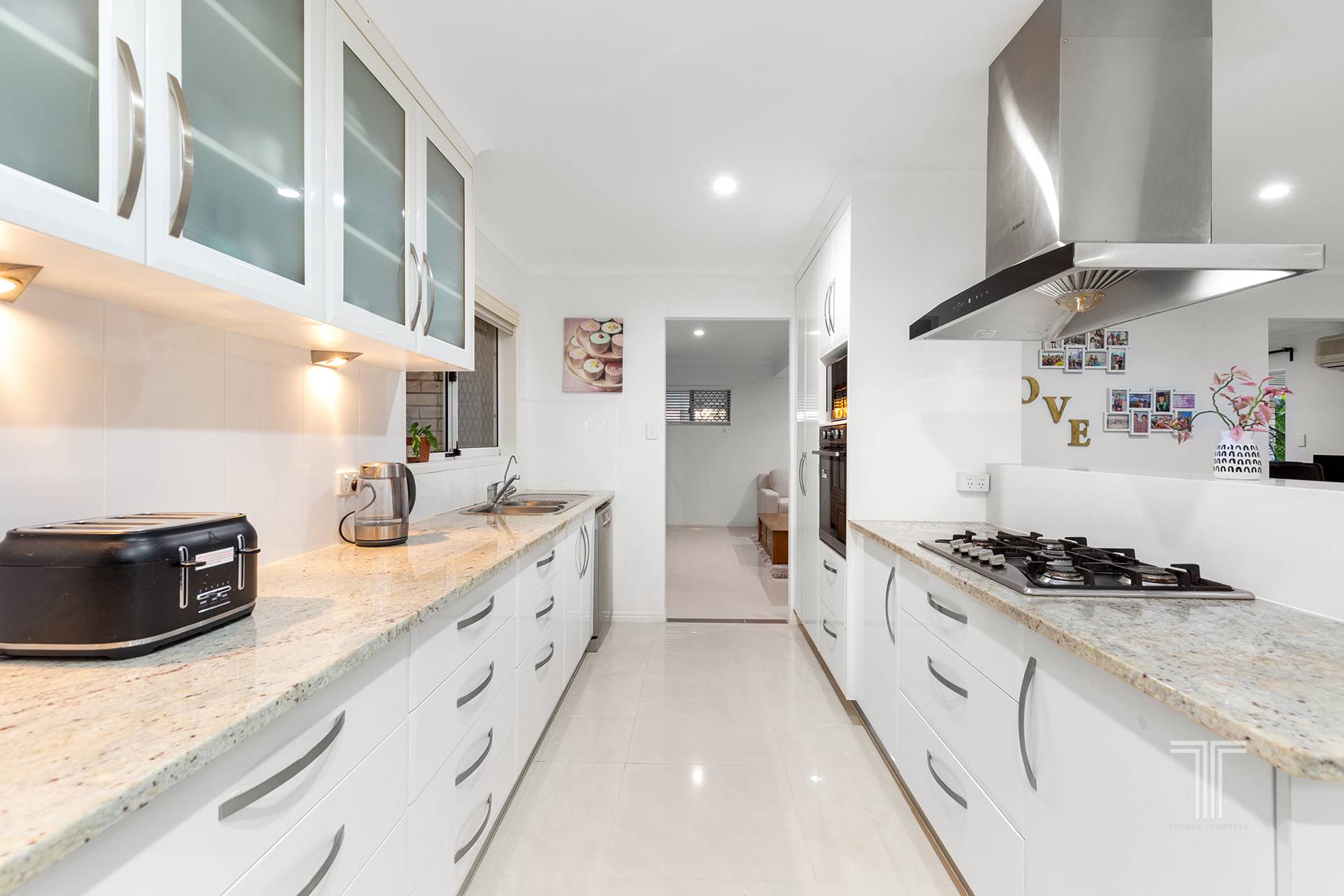 The generously sized kitchen has undergone a modern update with 30mm granite benchtops, rows of cabinetry, a gas cooktop and a suite of stainless steel appliances.