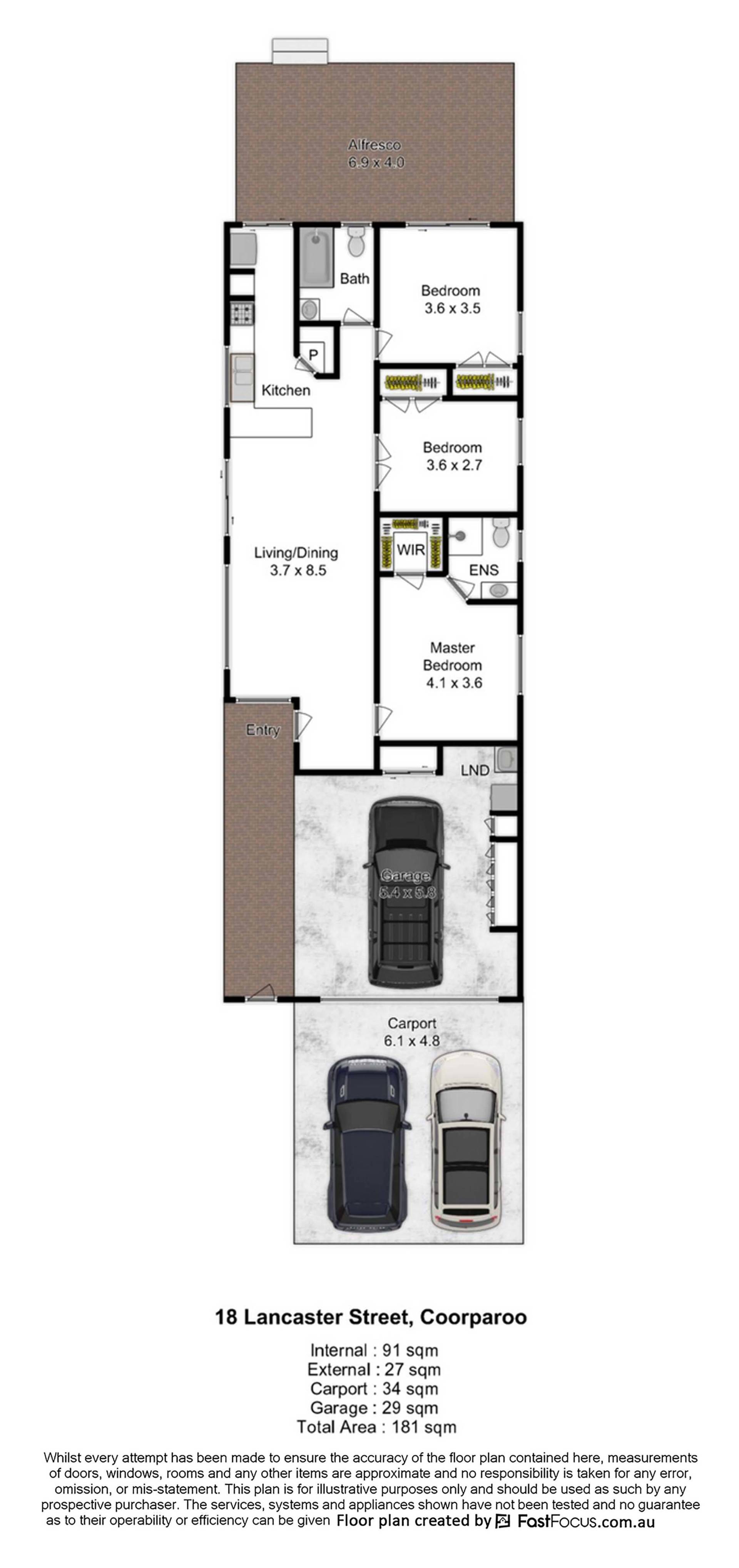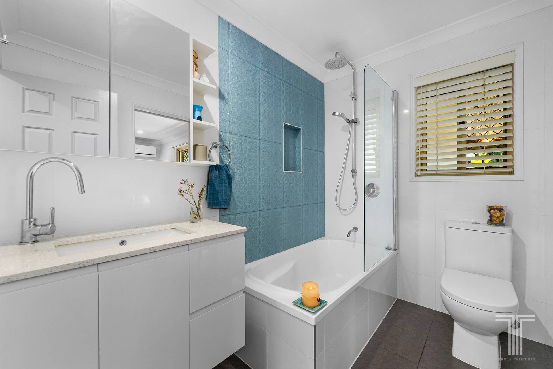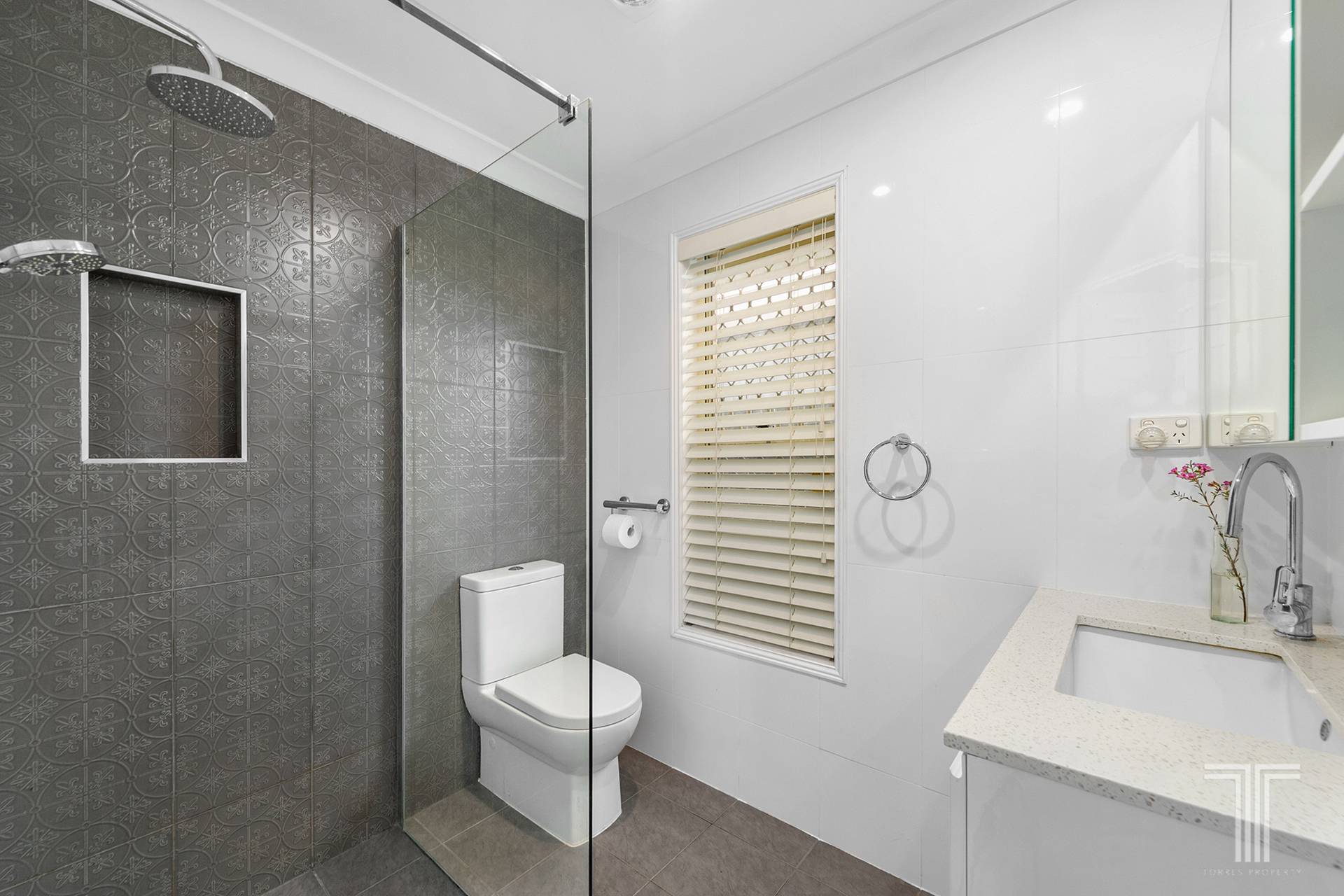 Two modern bathrooms accommodate three bedrooms with built-in robes. The master includes a walk-in robe and ensuite, while the third bedroom opens to the rear patio.