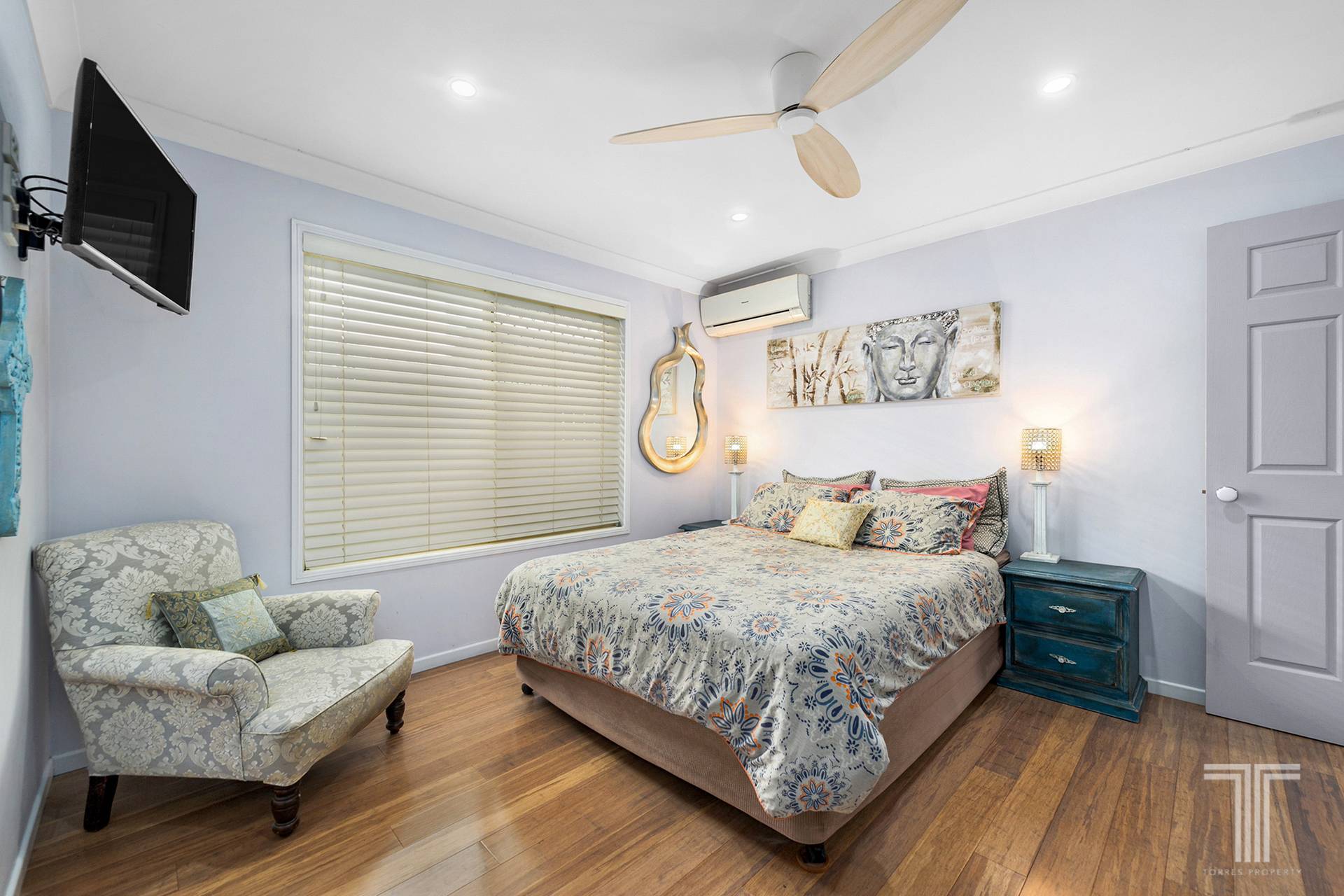 The stylish interiors reveal bamboo flooring, downlights and air-conditioning. The free-flowing living and dining area extends into the modern kitchen, which has been expertly appointed with stainless steel appliances, large Caesarstone benchtops and a breakfast bar.