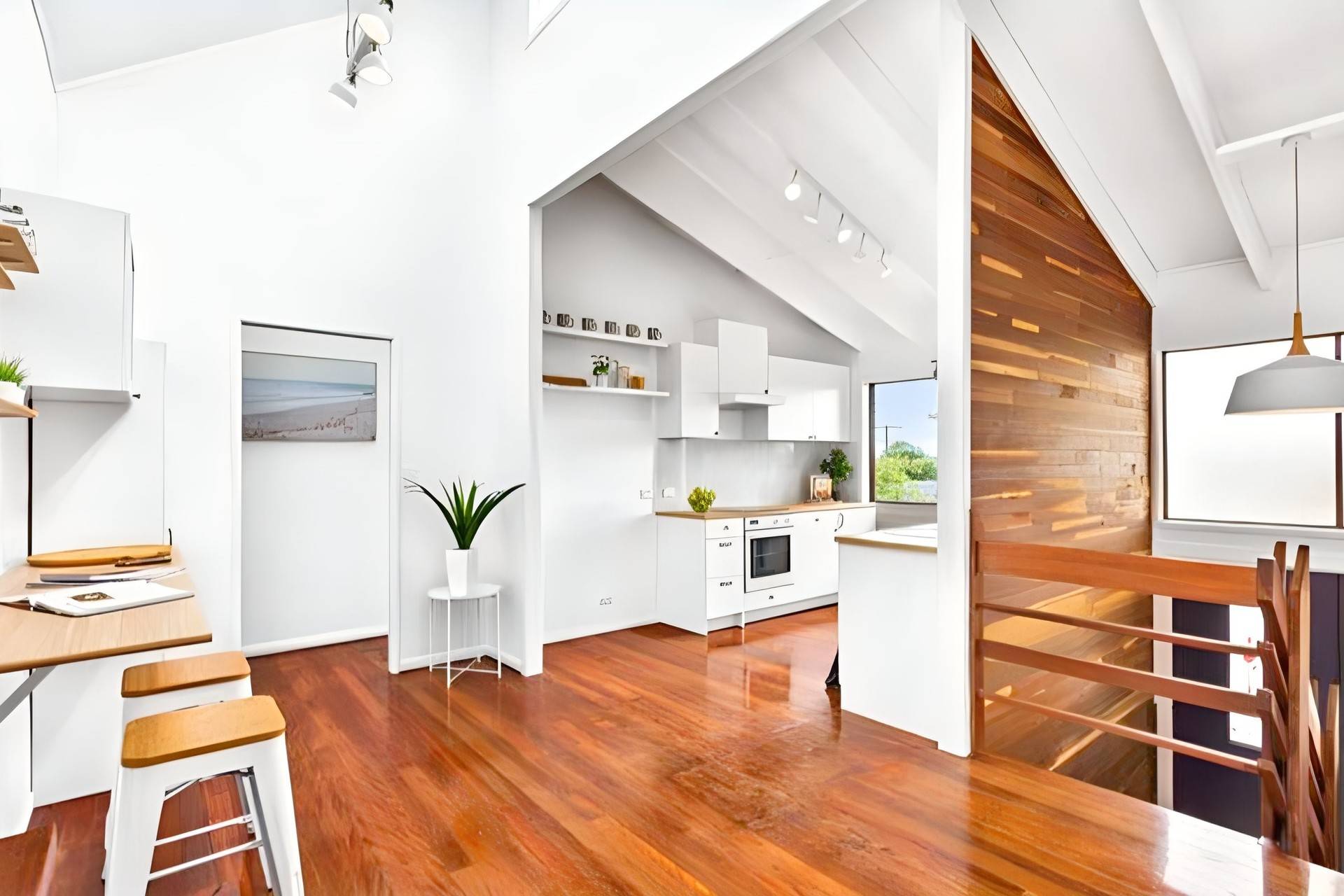 This tri-level home is one of a kind and sure to inspire. Bright, natural light illuminates the polished wooden floors and distinctive soaring raked ceilings, creating a glorious Hamptons feel on the upper levels.
