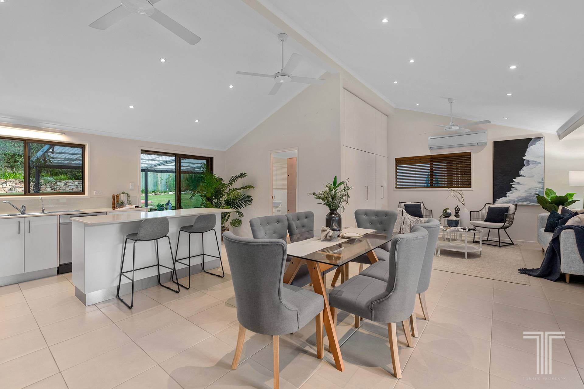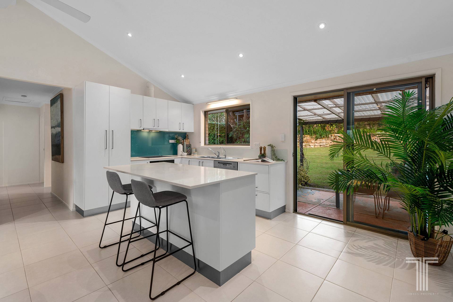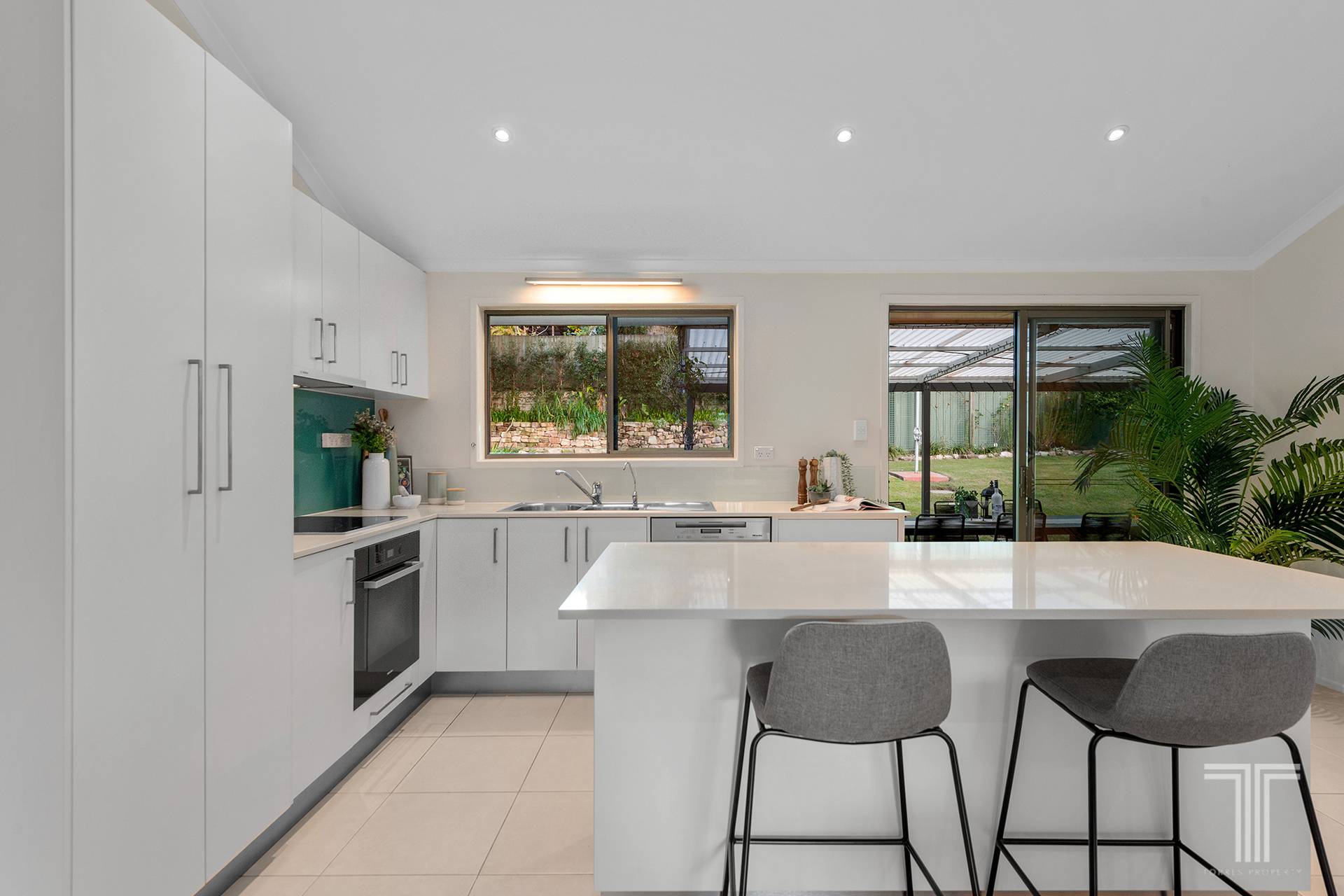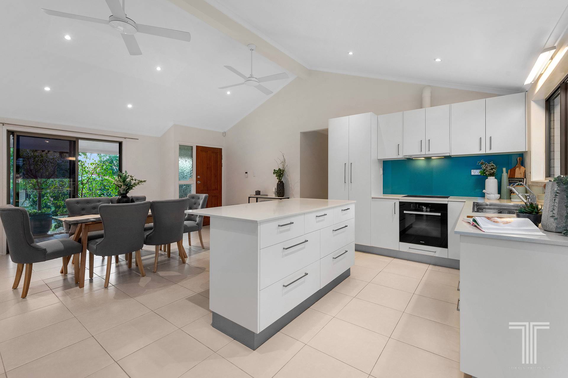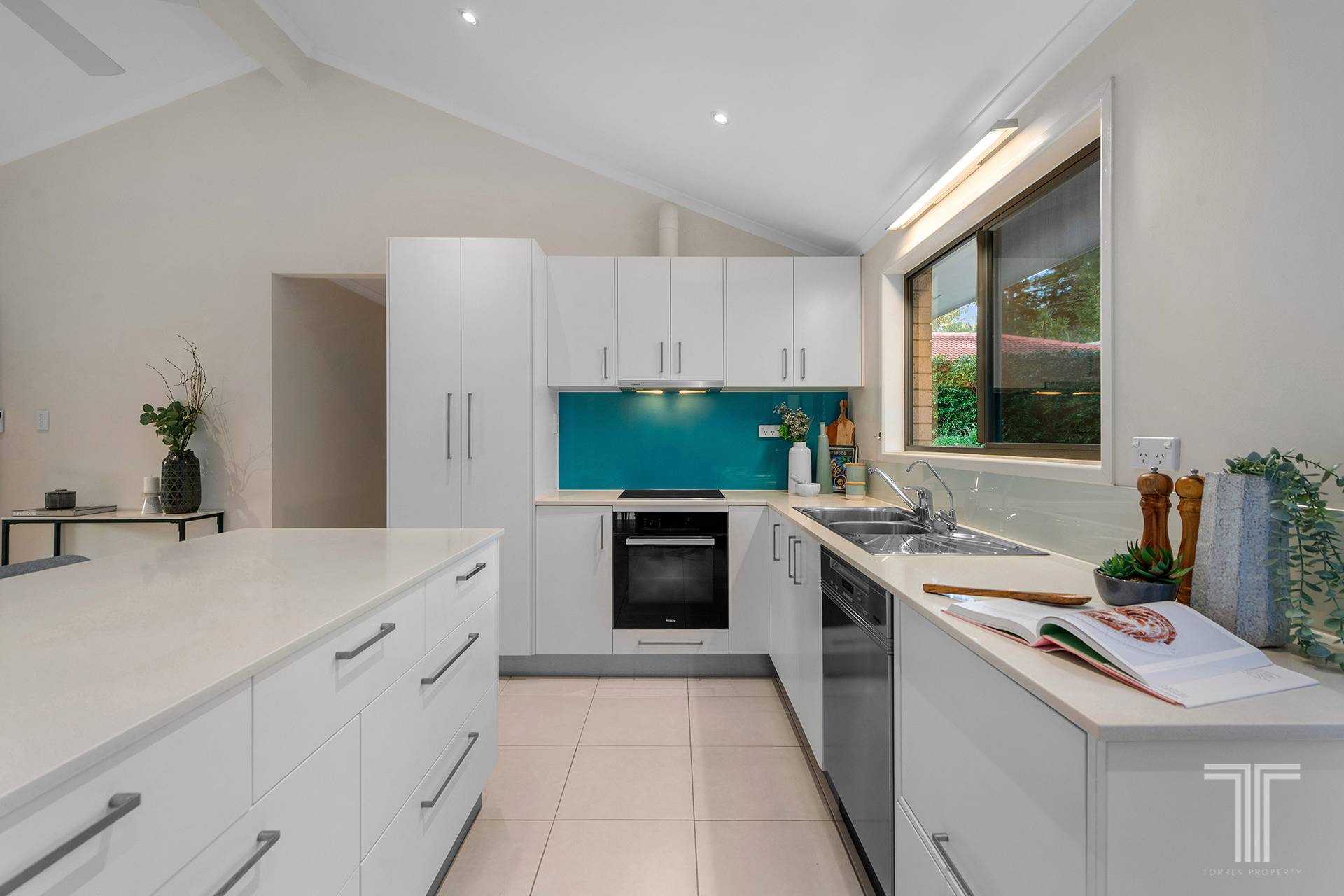 The wide front porch guides you inside the spacious lounge and dining area boasting beautiful cathedral ceilings, modern downlights, air-conditioning and extensive storage. Flowing into the open plan kitchen, the resident cook will love the sleek white design, island bench, ample cabinetry and quality appliances.