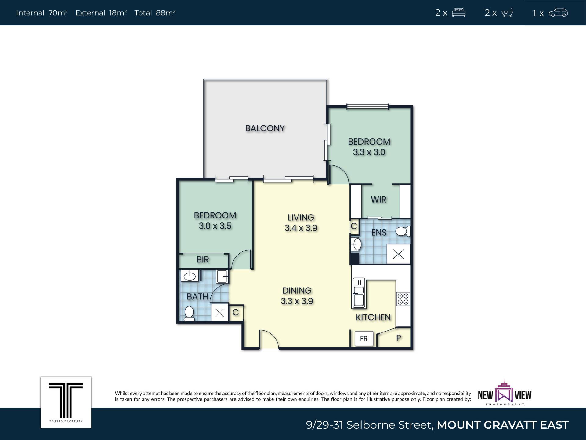 The layout features two bedrooms, two bathrooms and one secure car space. Both bedrooms open to the balcony via sliding glass doors. The master includes a walk-through robe and a private ensuite, while the second bedroom features a built-in robe and access to the main bathroom/laundry.