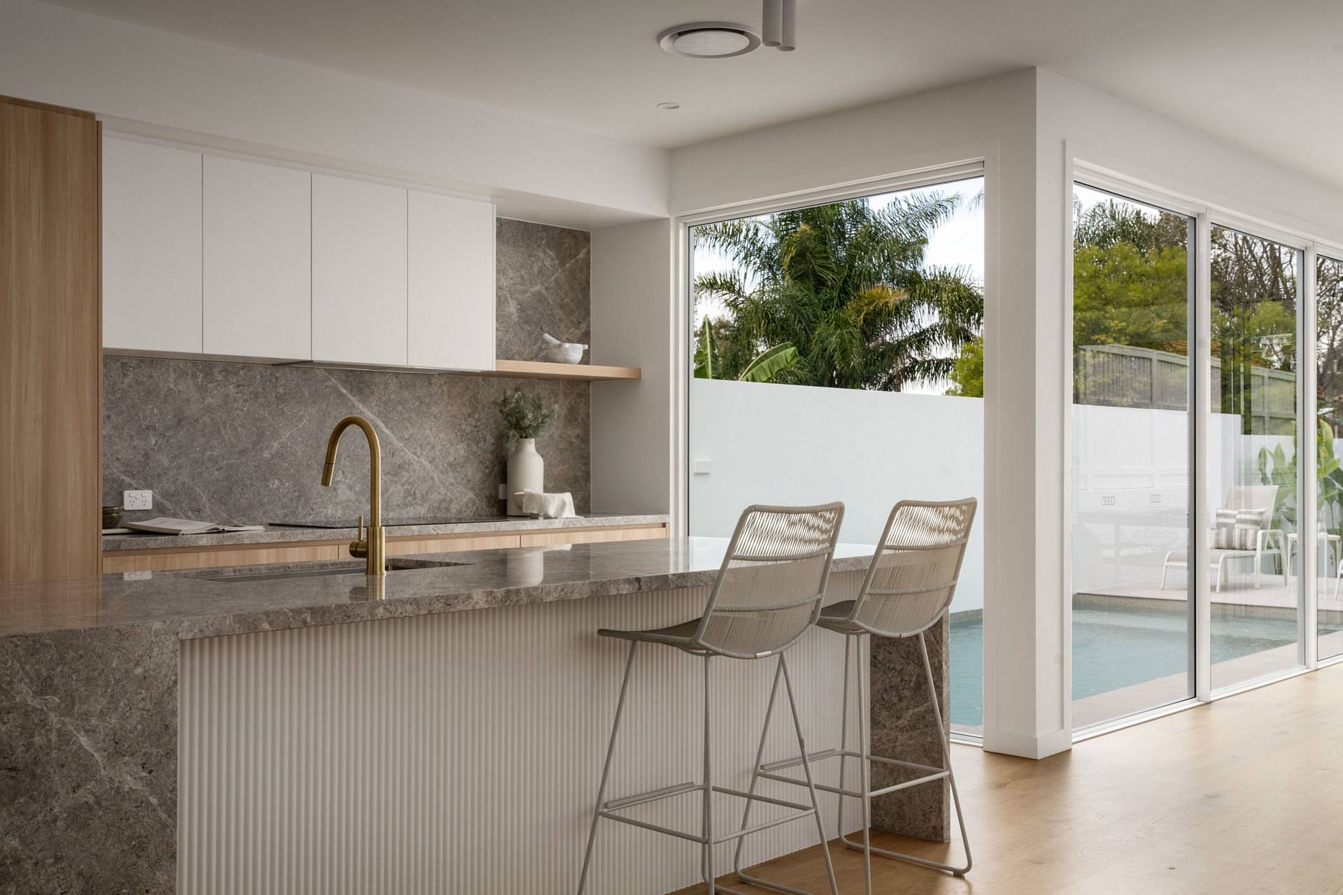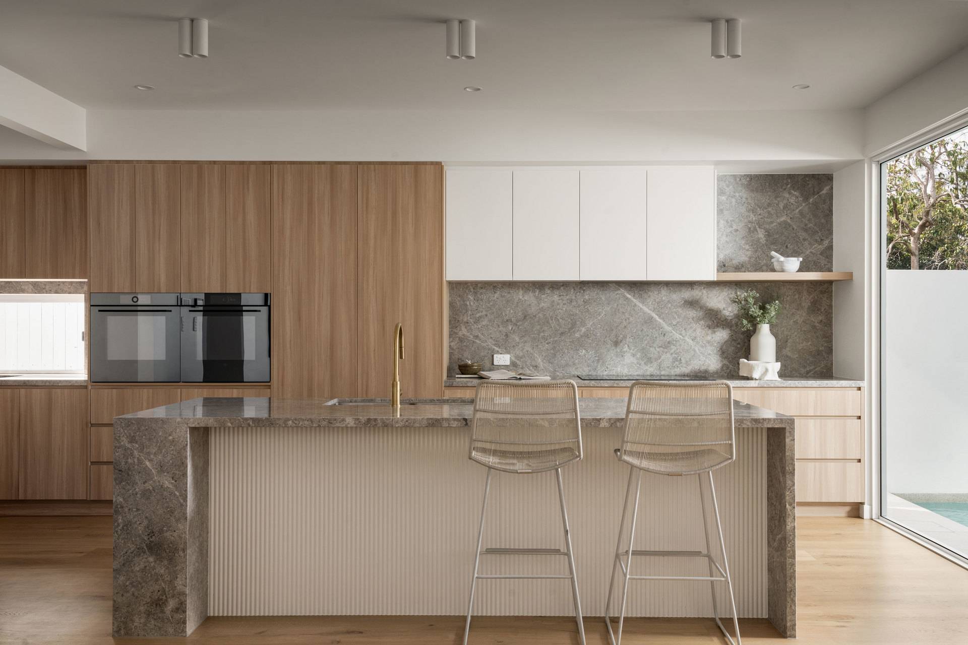 - Designer kitchen with natural stone benchtops; 2pac and timber grain cabinetry; butler's pantry