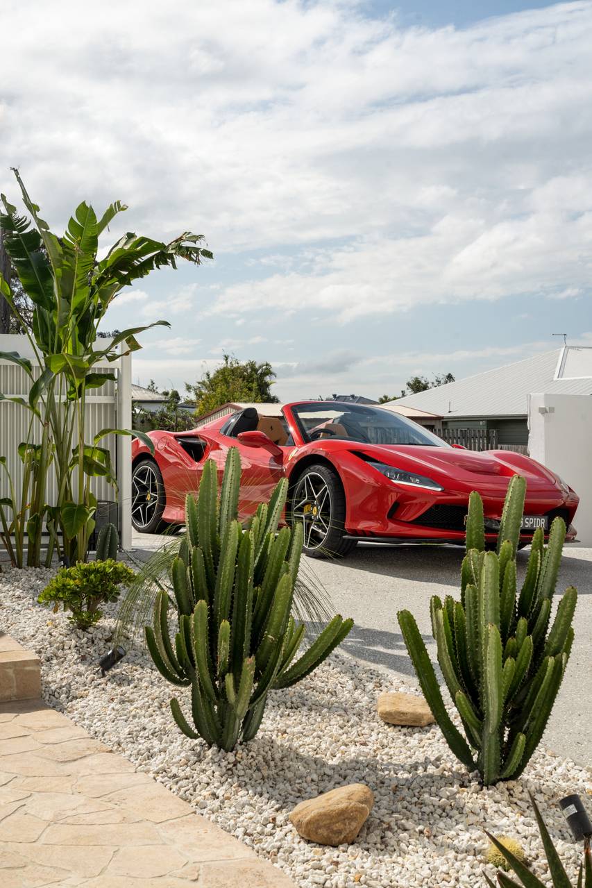 - Natural freeform stone cladding; Travertine crazy paved entrance; Xeriscape landscaping