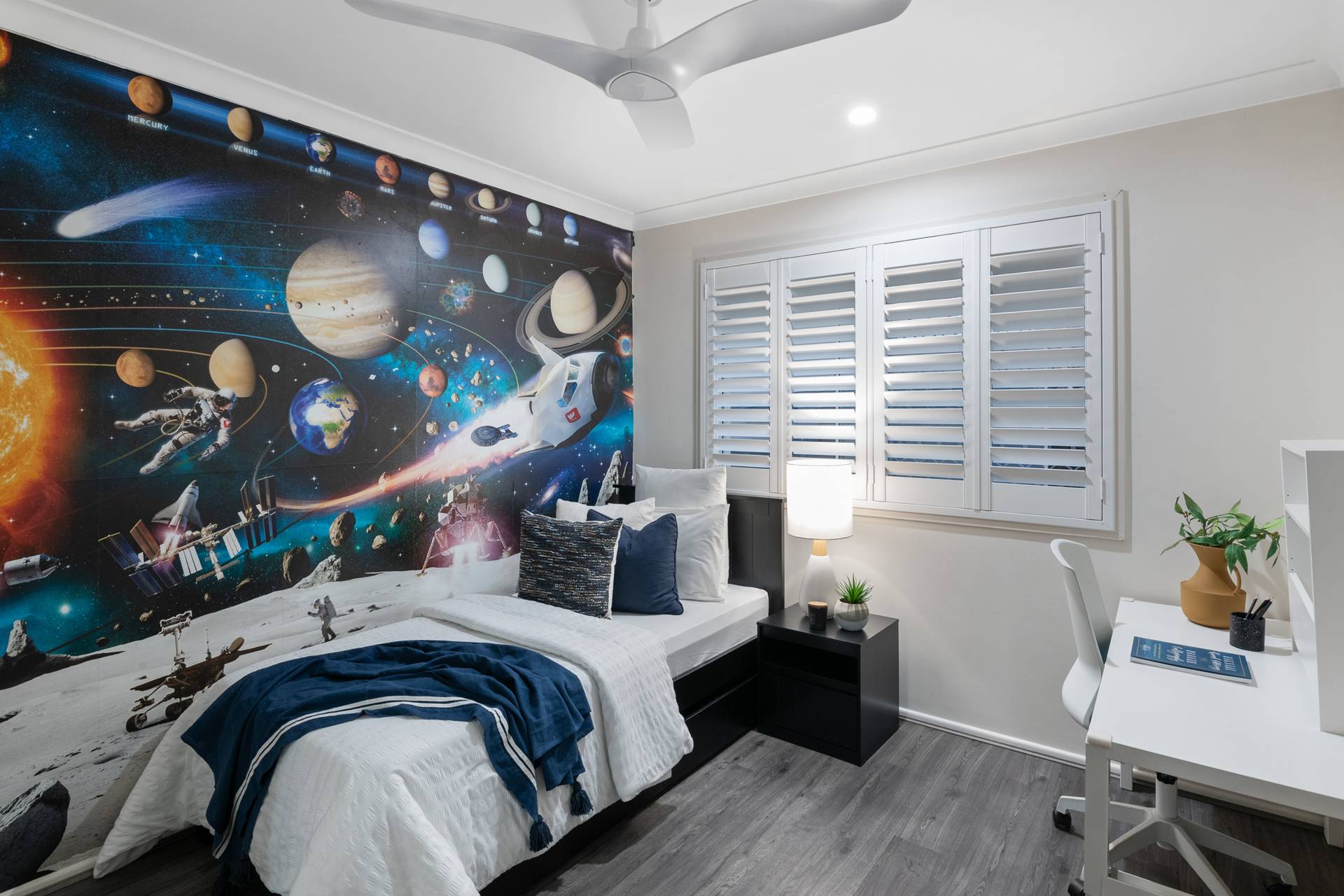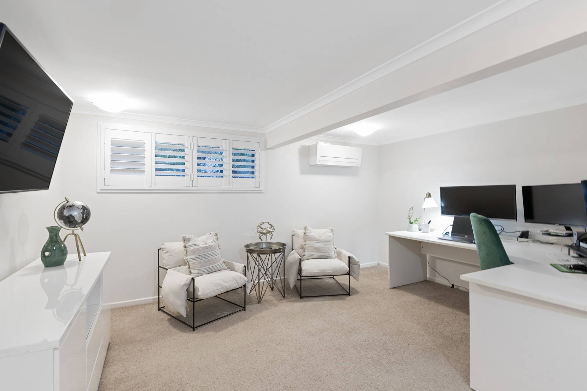 Four bedrooms with built-in robes and a family bathroom complete the upper floor. Downstairs, an additional multipurpose room and second bathroom accommodate dual living alongside a living room, rumpus room, and fully equipped kitchen.