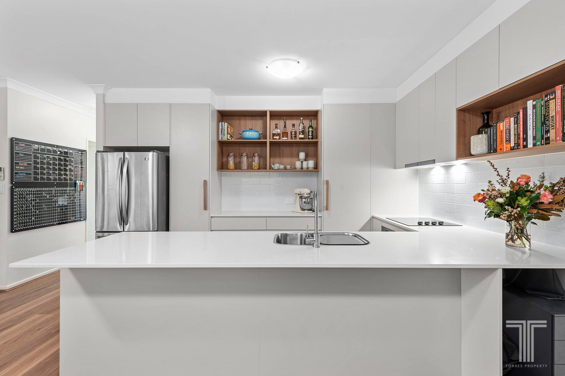 The stylish new kitchen has been transformed with high-rise cupboards and a custom-made bench to accommodate a Vintec wine fridge.