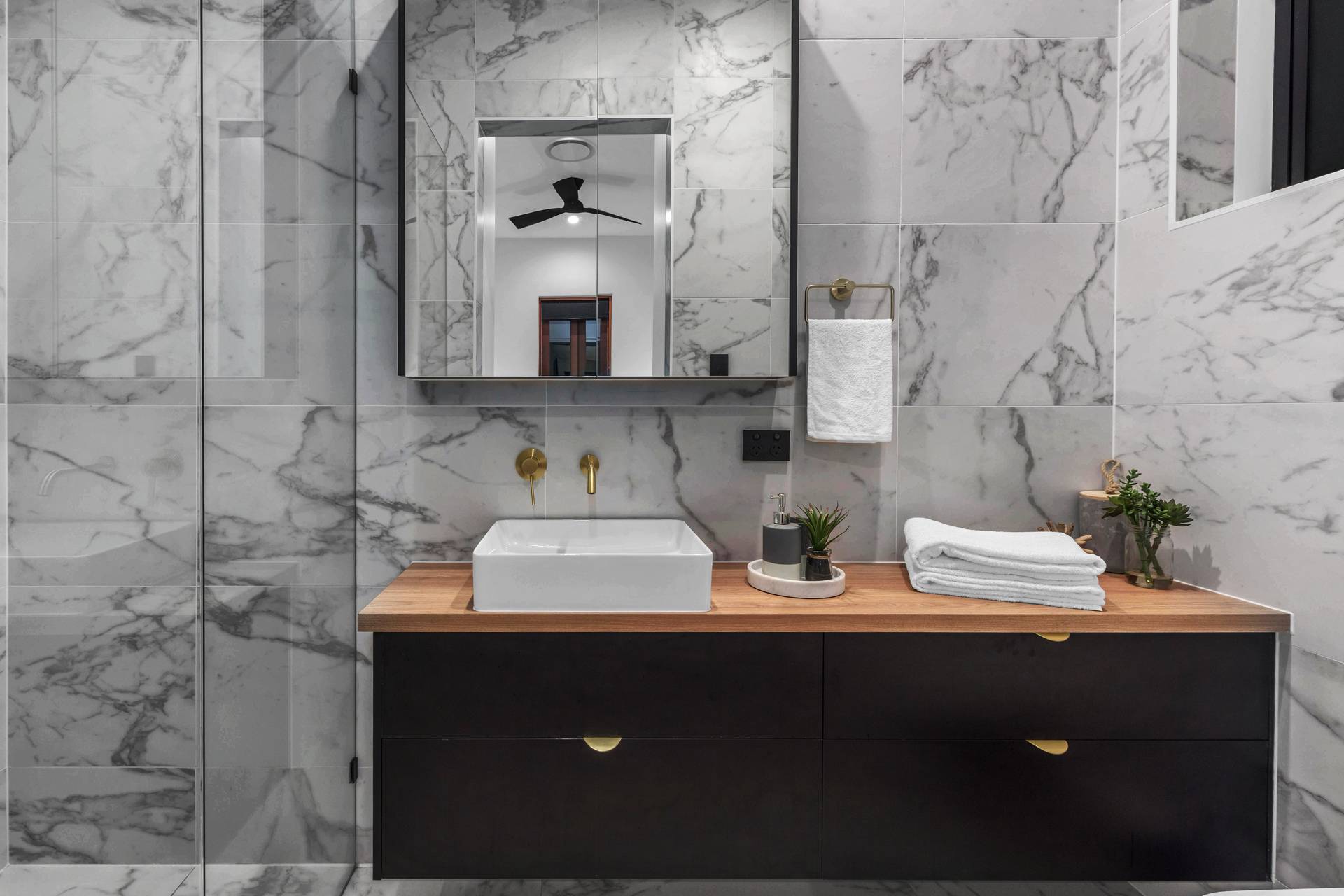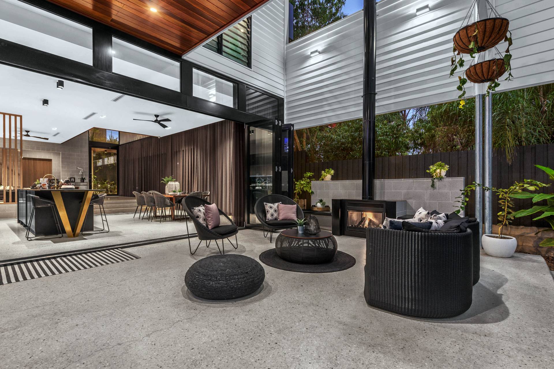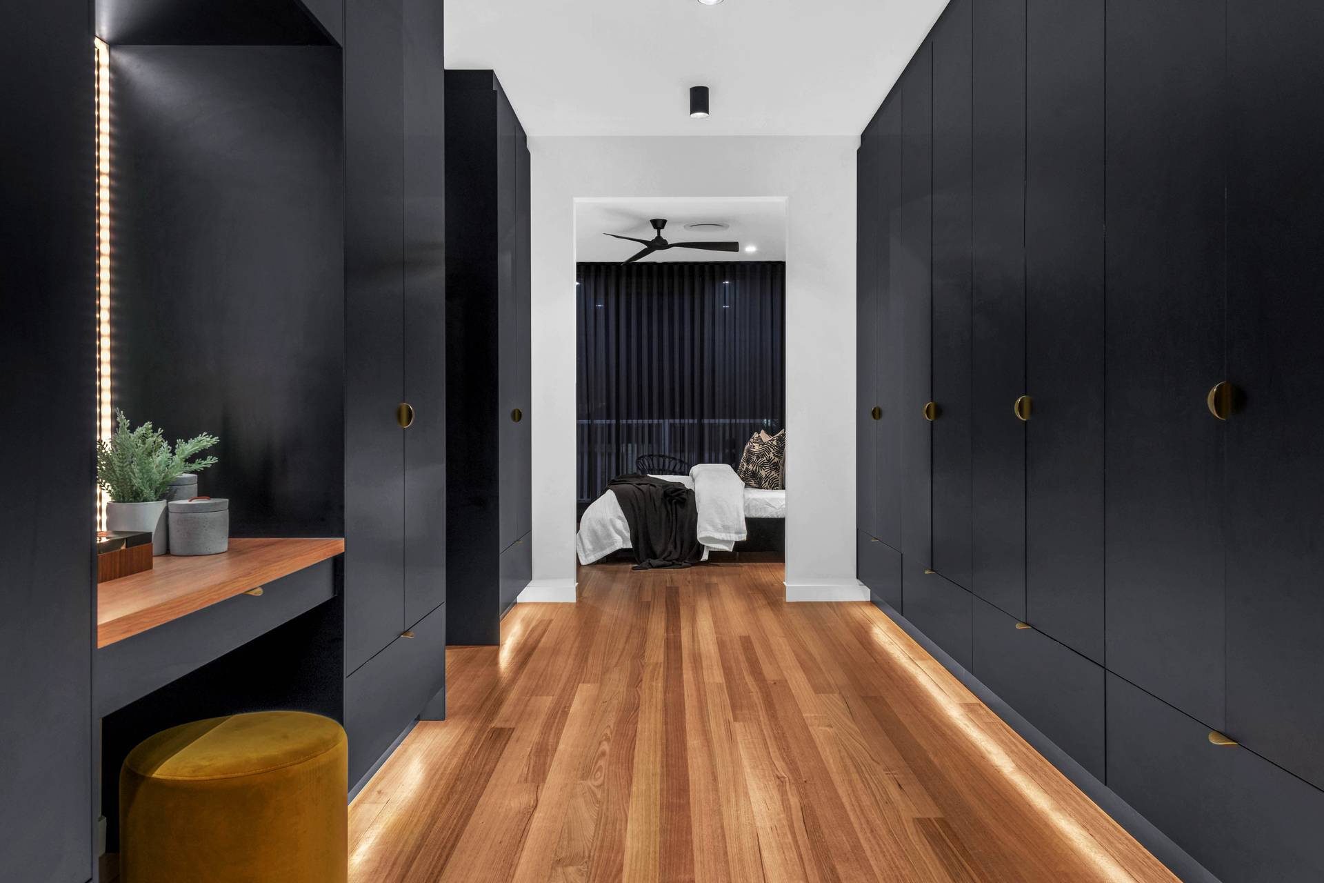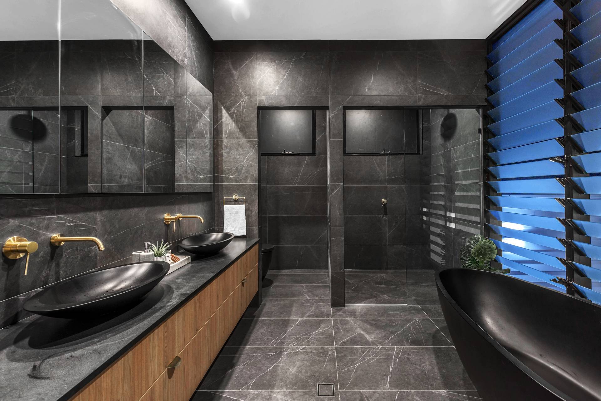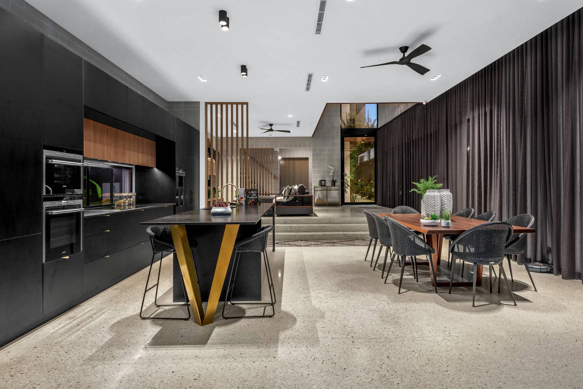 More reserved areas are on the upper level, this includes a decadent master retreat with sliding glass doors to the private Juliet balcony, large walk-in robe with ample quality timber cabinetry and dressing room, a sumptuous, award winning ensuite with a black stone bathtub. To complete the picture, there is a large void to the pool creating a sense of drama, allowing light and breezes to penetrate into the master suite from the balcony.