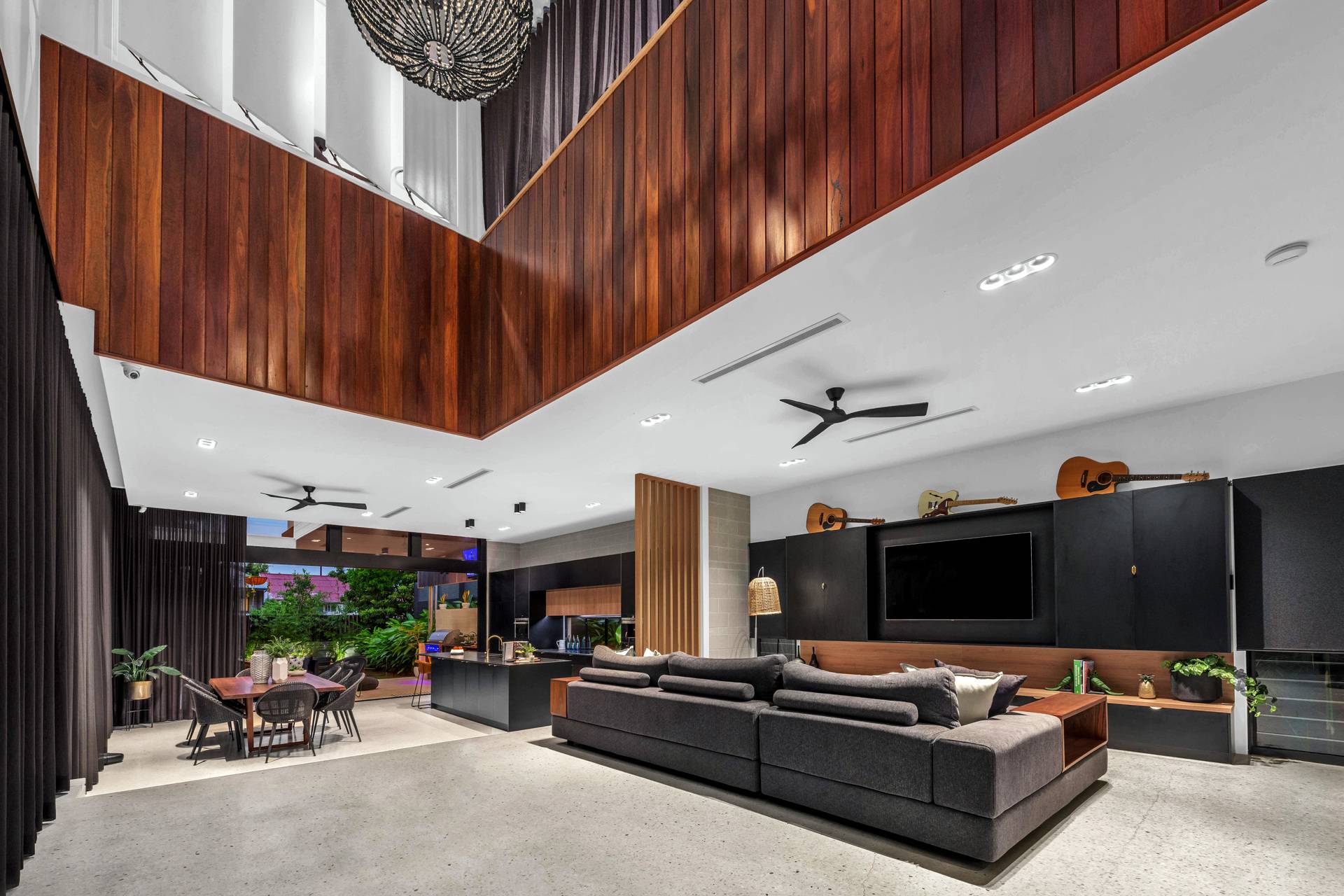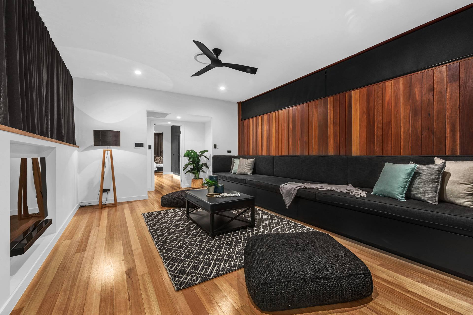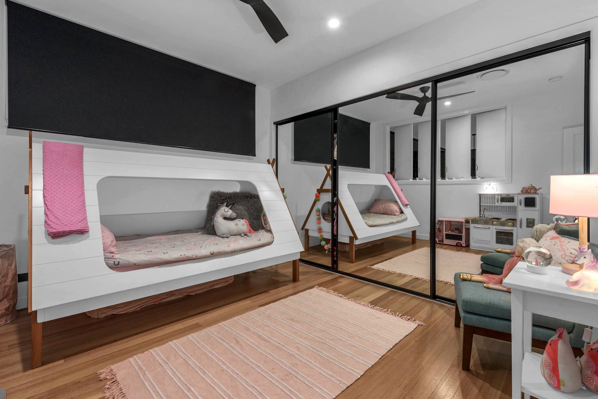Also on this upper level, we have a second living area with a full-length custom-built sofa, allows respite from the kids and ensures family harmony. Accommodation comprises of a further four bedrooms, all with built-in robes and ceiling fans, including a fully fitted out office which creates an ideal balance of modern-day living and family.