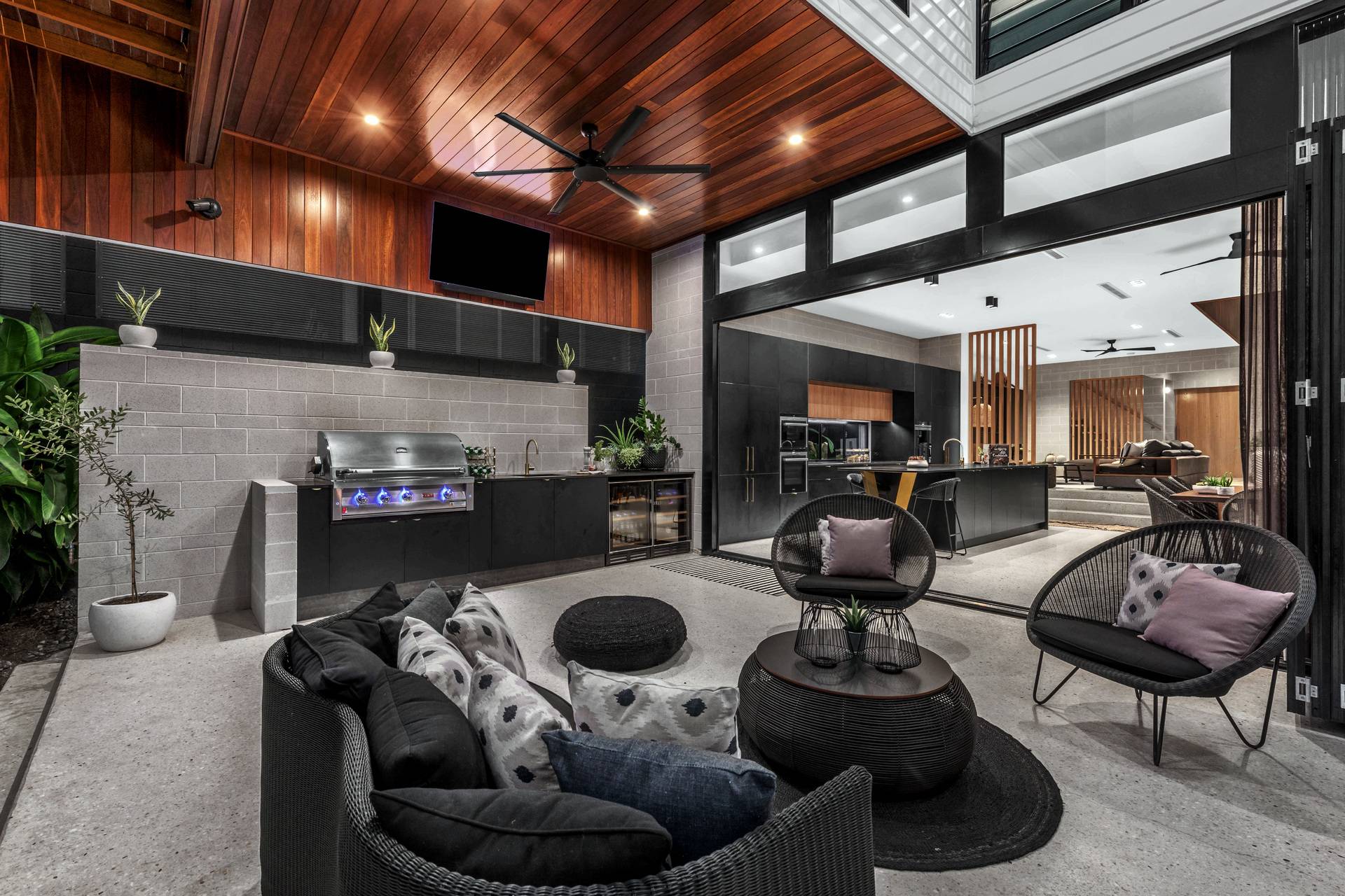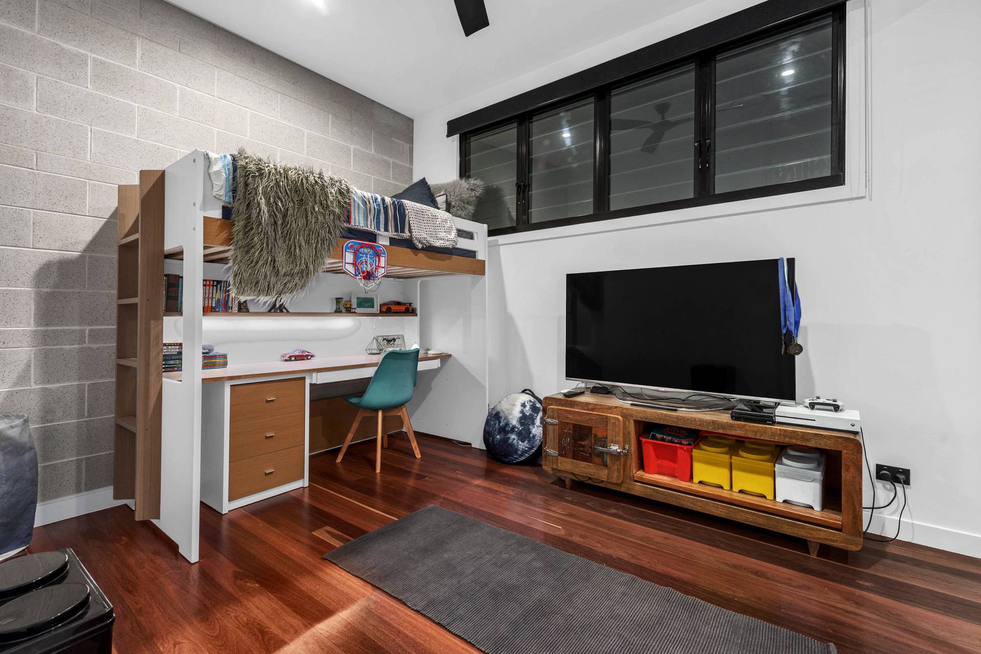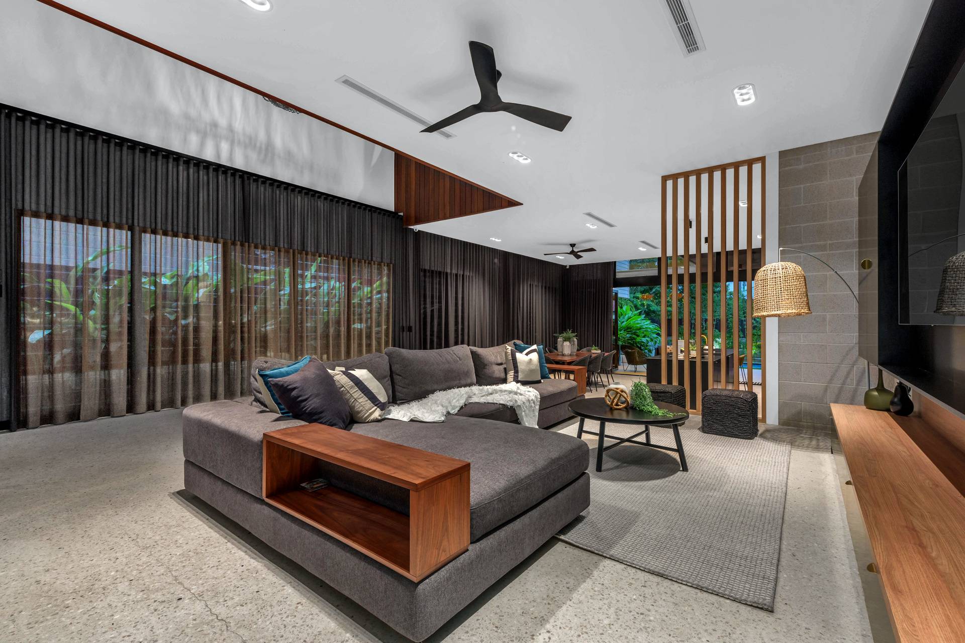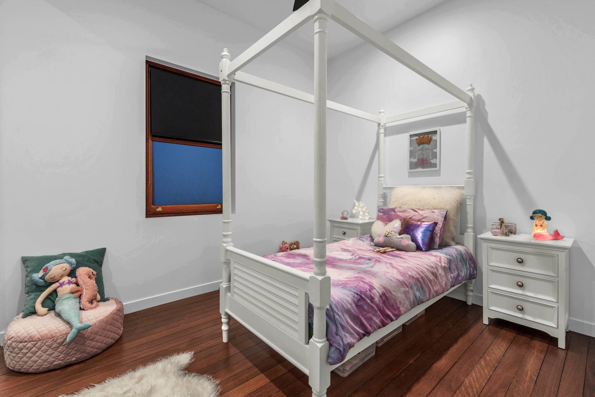 Also on this upper level, we have a second living area with a full-length custom-built sofa, allows respite from the kids and ensures family harmony. Accommodation comprises of a further four bedrooms, all with built-in robes and ceiling fans, including a fully fitted out office which creates an ideal balance of modern-day living and family.