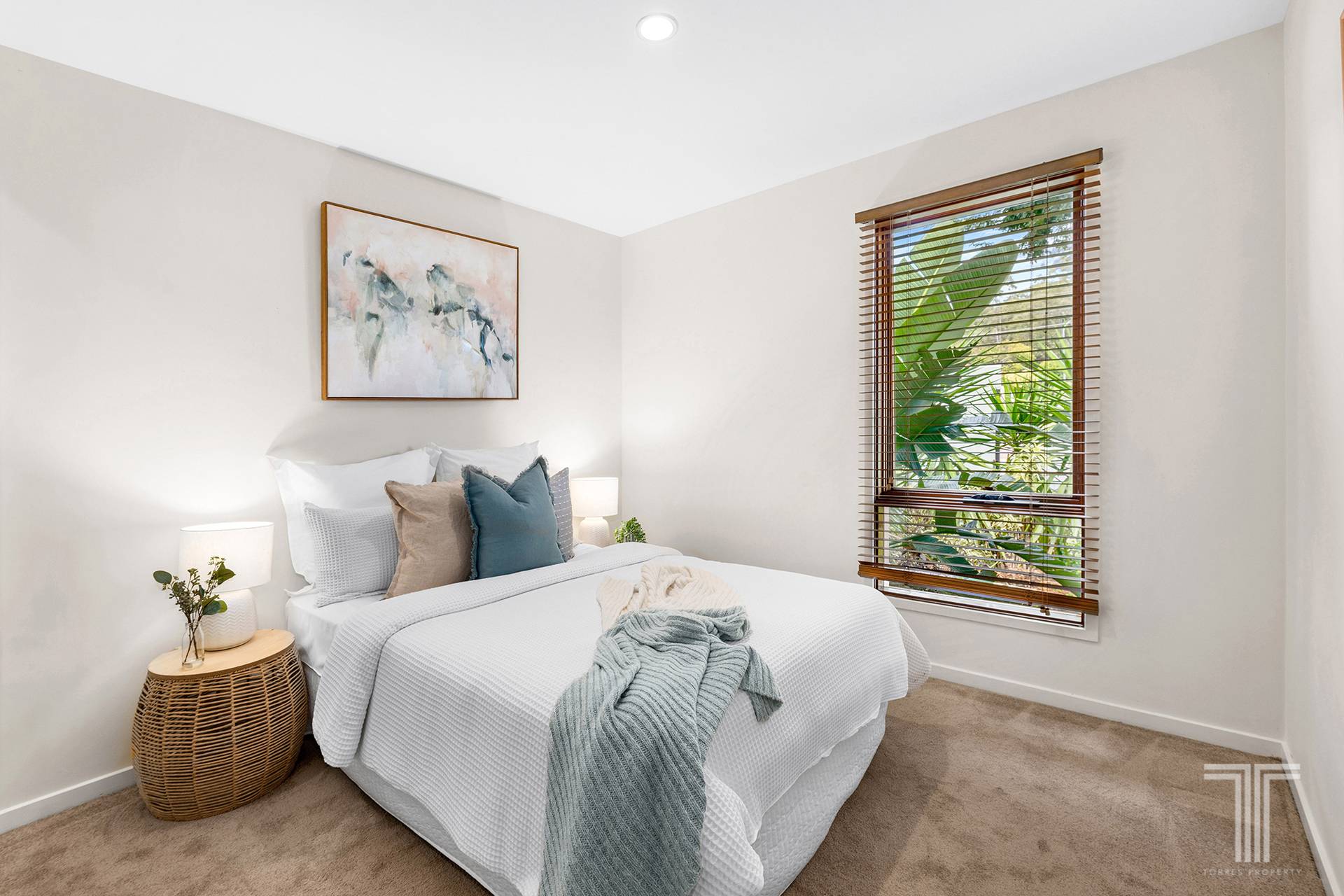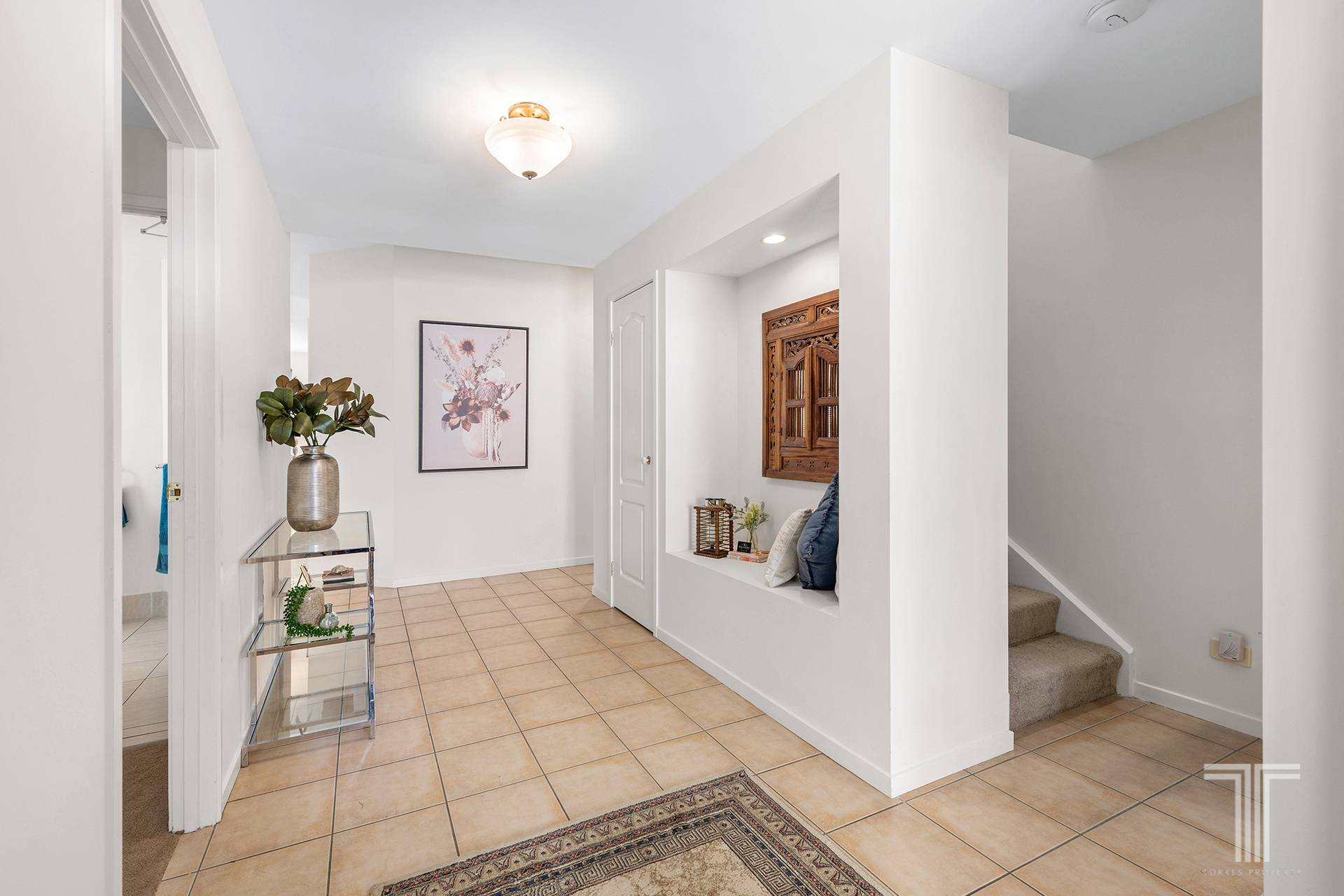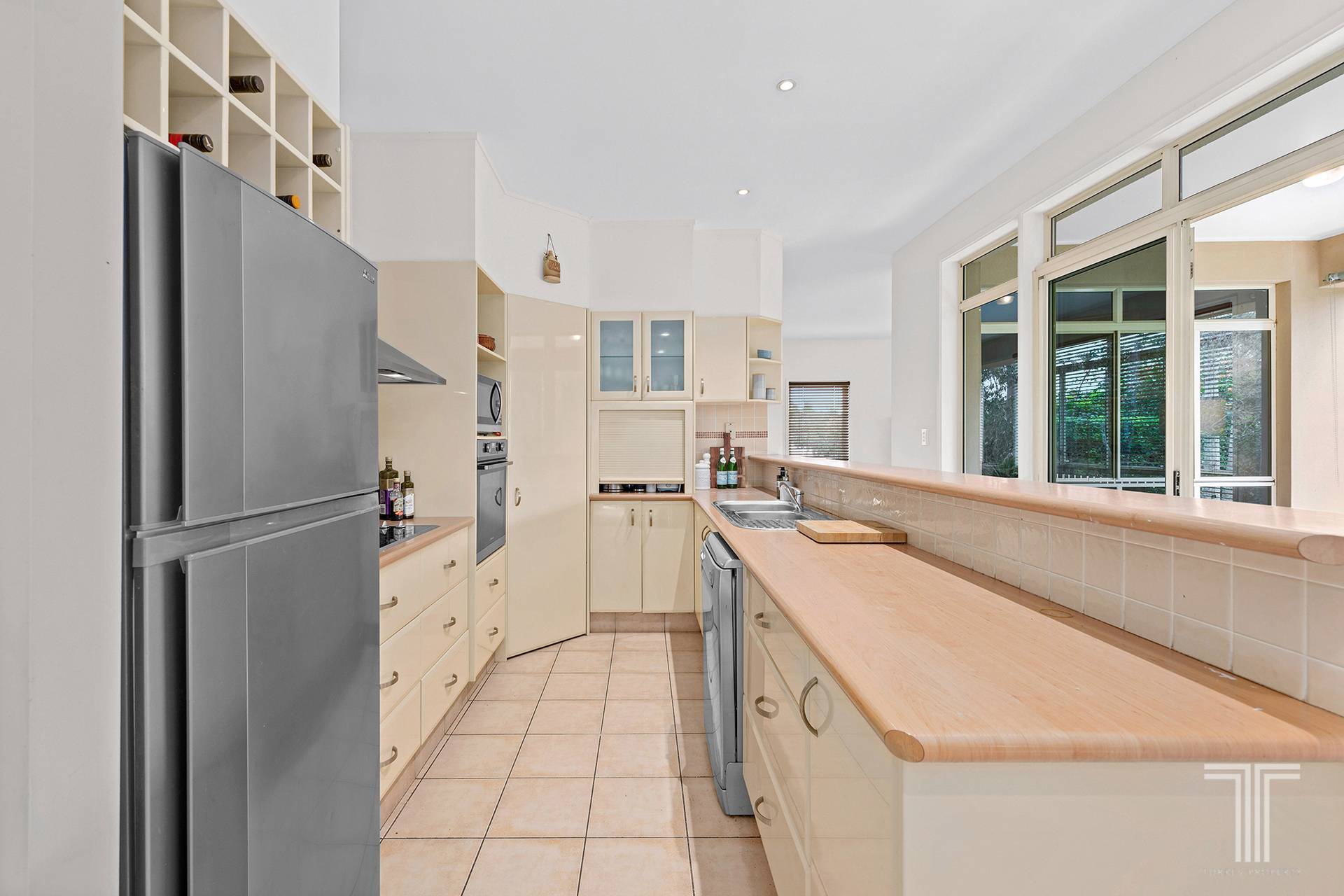 The entry foyer with integrated seating flows effortlessly to the rear. Framed by banks of glass sliders and windows, these family zones delight in leafy green vistas, abundant natural light and exceptional airflow. The well-appointed kitchen boasts stainless steel appliances and provides a connection between the living spaces.
