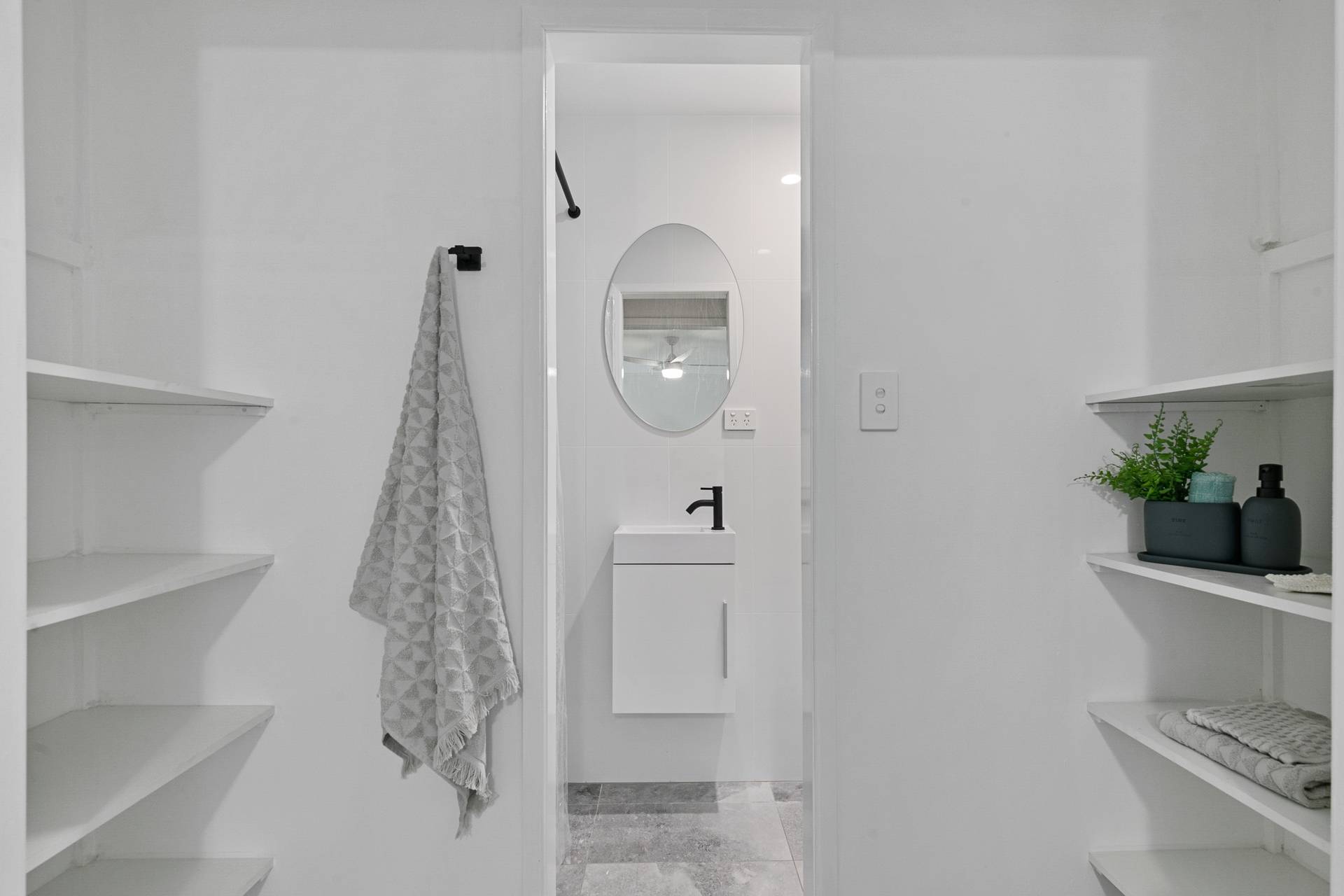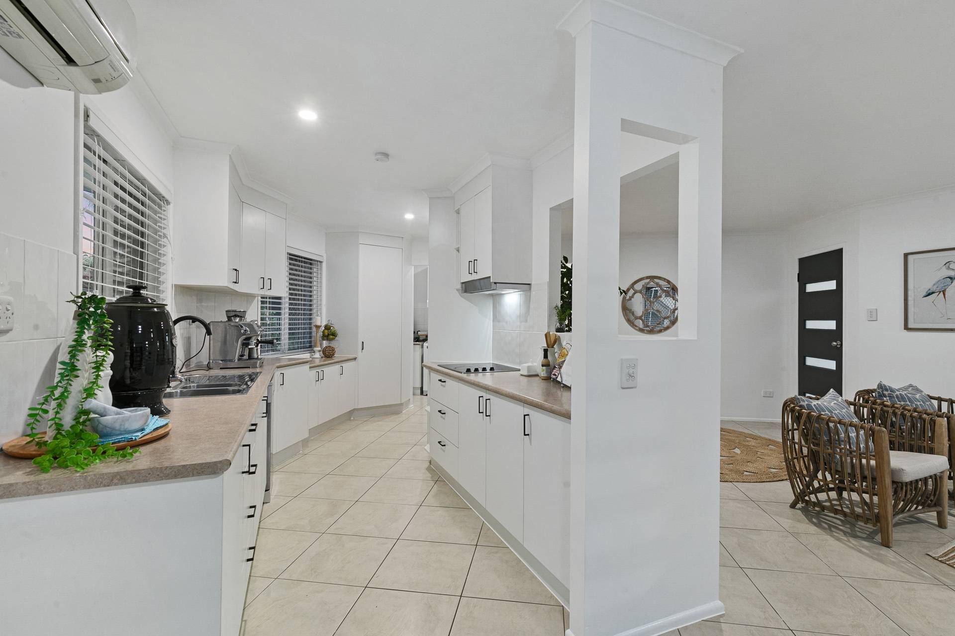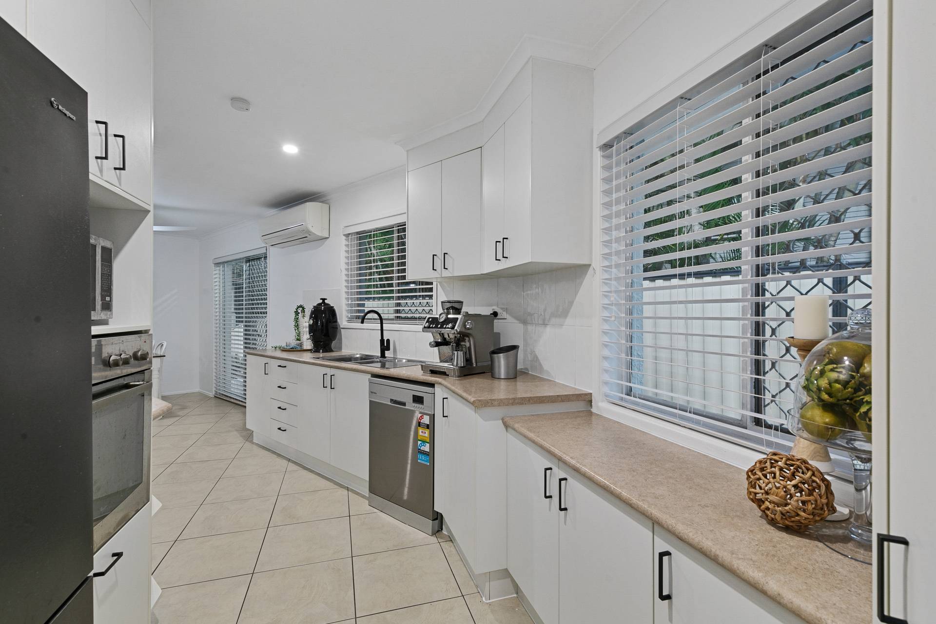 Fresh fixtures and appliances including dishwasher, compliment the galley style practical kitchen, that has a lot of bench space for meal preparations.