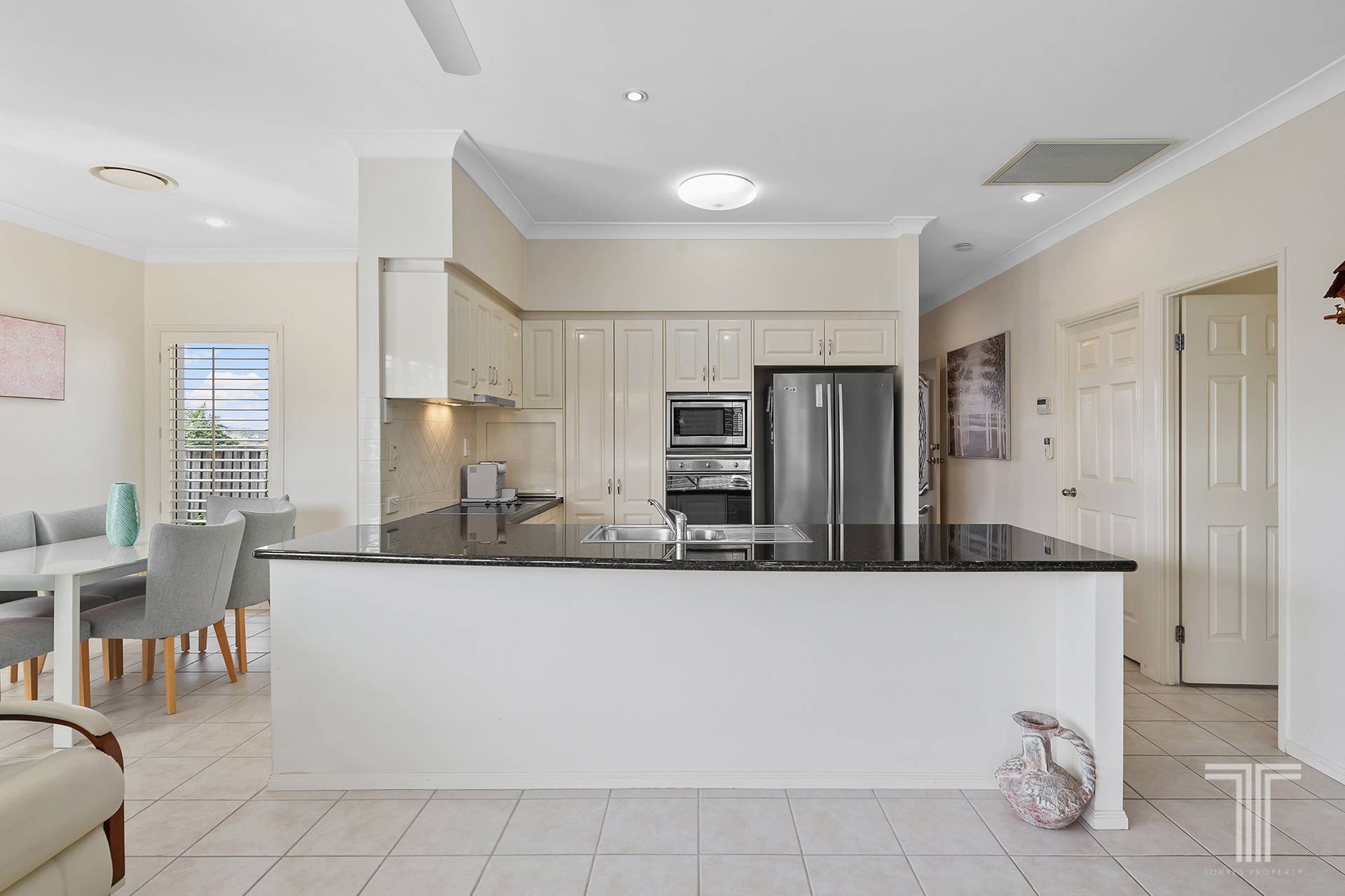 Beautifully designed, the house is elevated to capture views over the hills and draw in an abundance of natural light. Tiled flooring and zoned ducted air-conditioning keep the home cool, while plantation shutters filter the sunshine from the northern rear aspect.