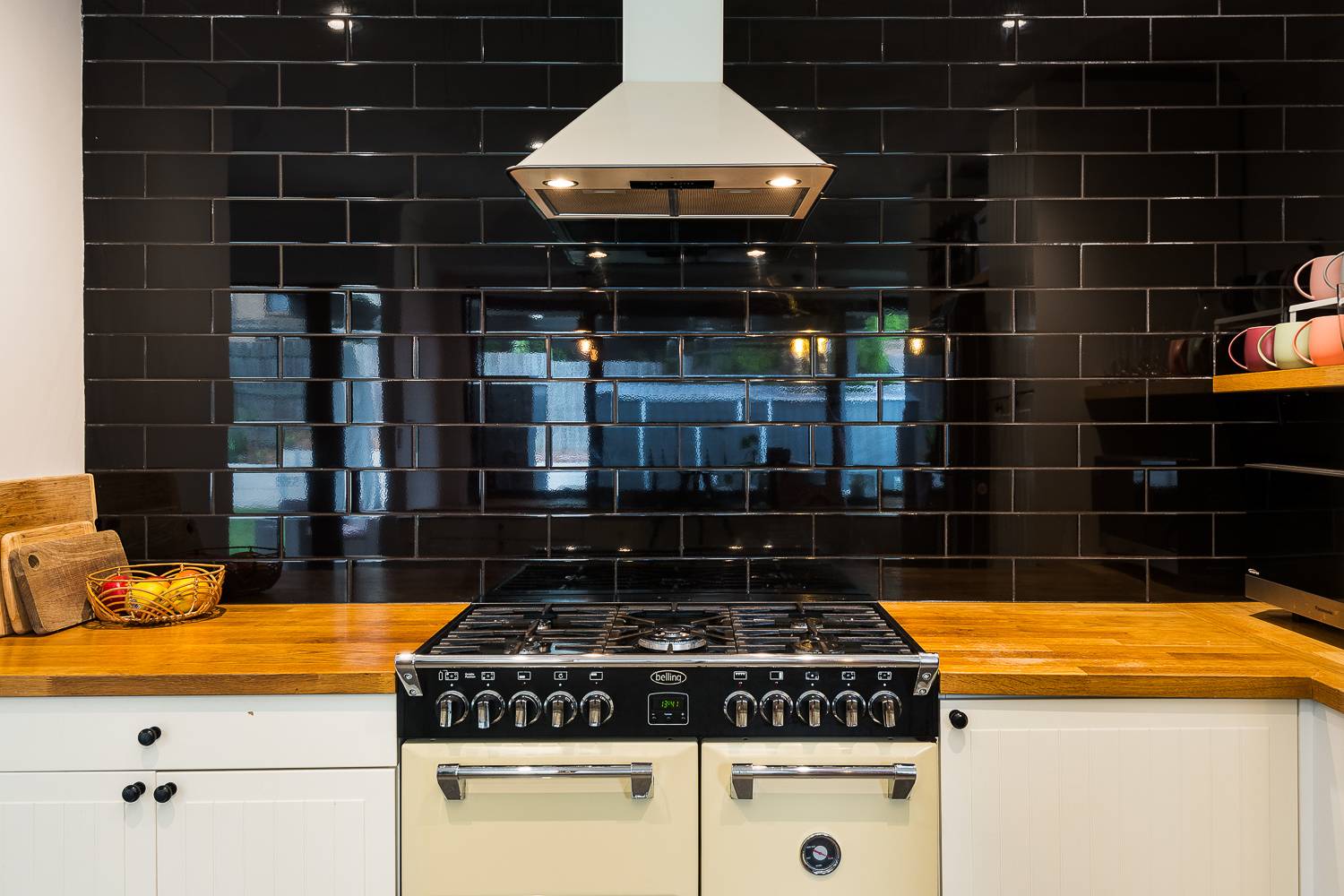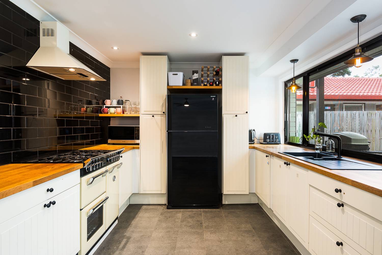 The wide front porch welcomes you inside, where an open plan and air-conditioned living and dining area awaits. Families can relax here and prepare meals in the designer kitchen adorned with a freestanding oven, gas cooktop, black splashback and timber benchtops.