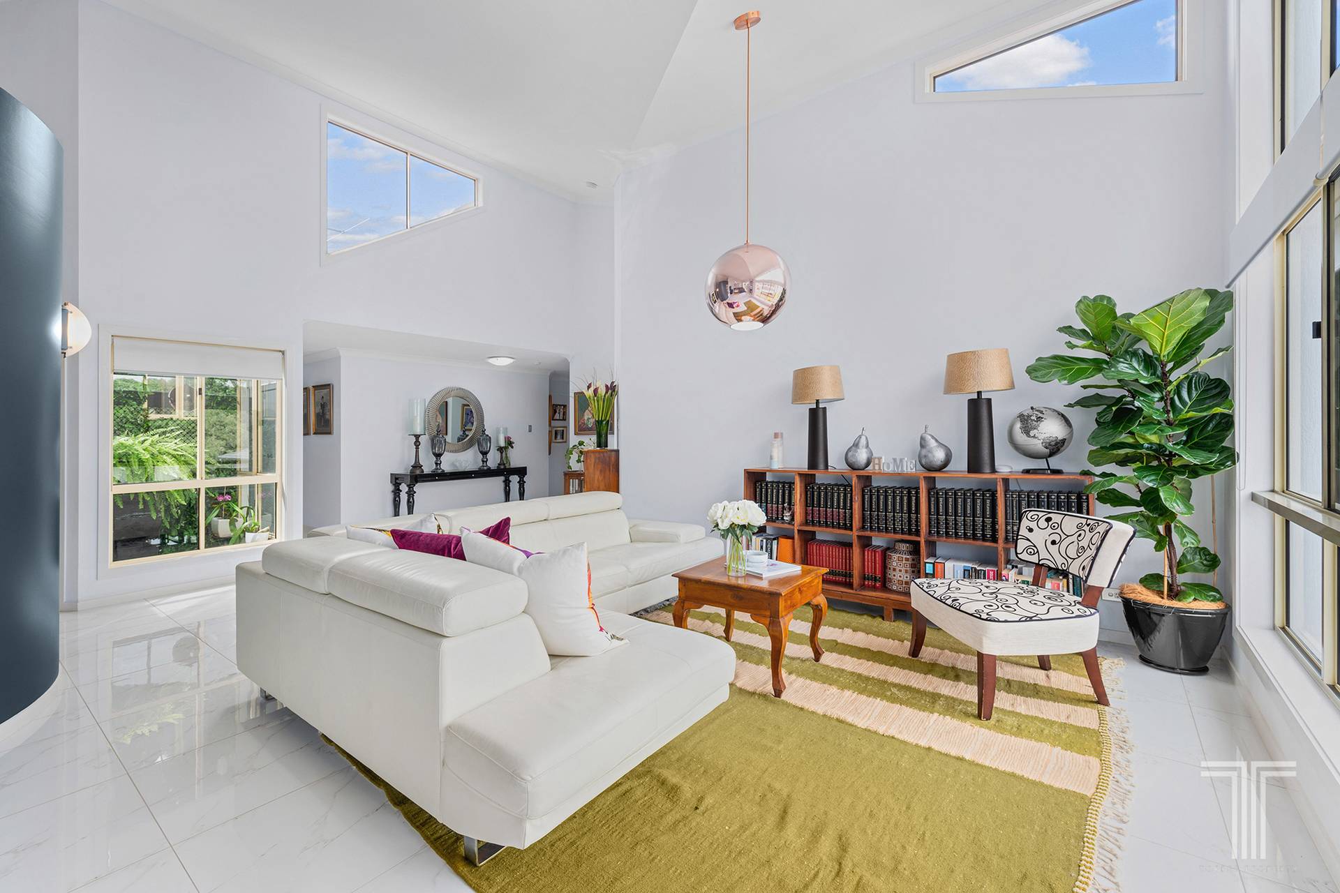 The moment you walk inside, you will be taken in by an incredible sense of space. The lounge room with pendant lights transitions seamlessly into the living and dining area. Through large windows and high ceilings, you will experience a relaxing ambience that makes you feel right at home.