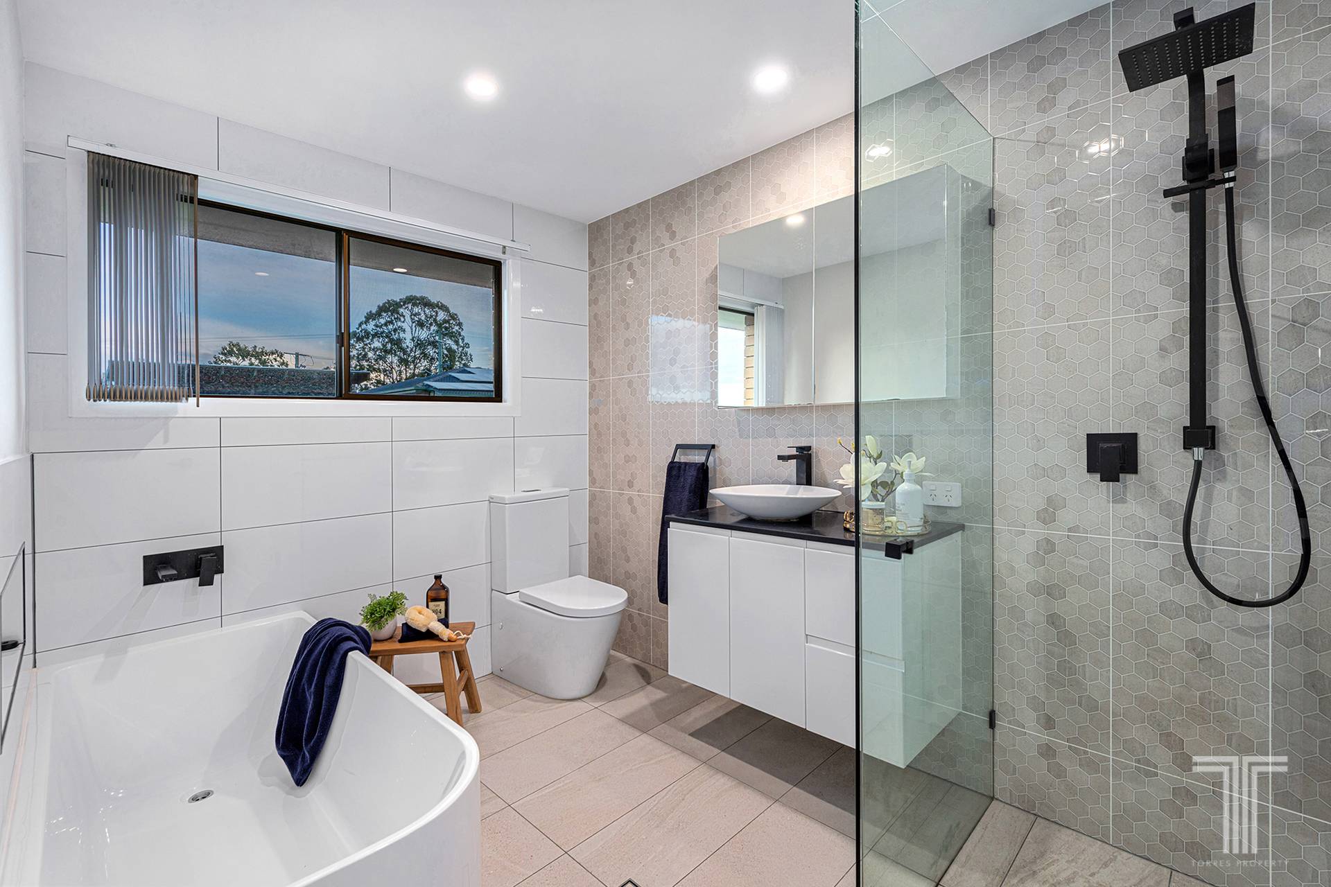 Three bedrooms are positioned upstairs, serviced by a modern bathroom with a luxurious bath, rainfall shower and floating vanity.