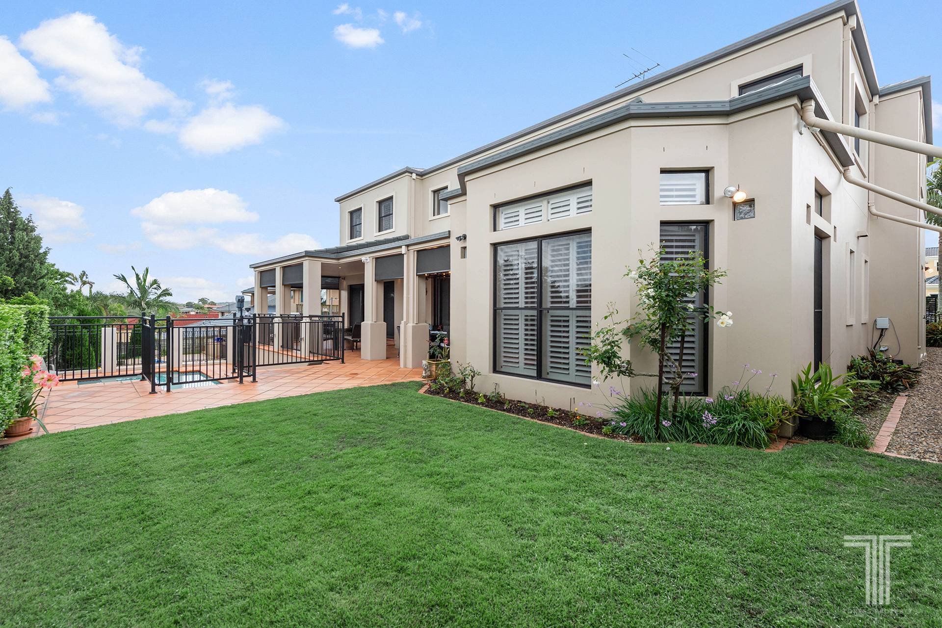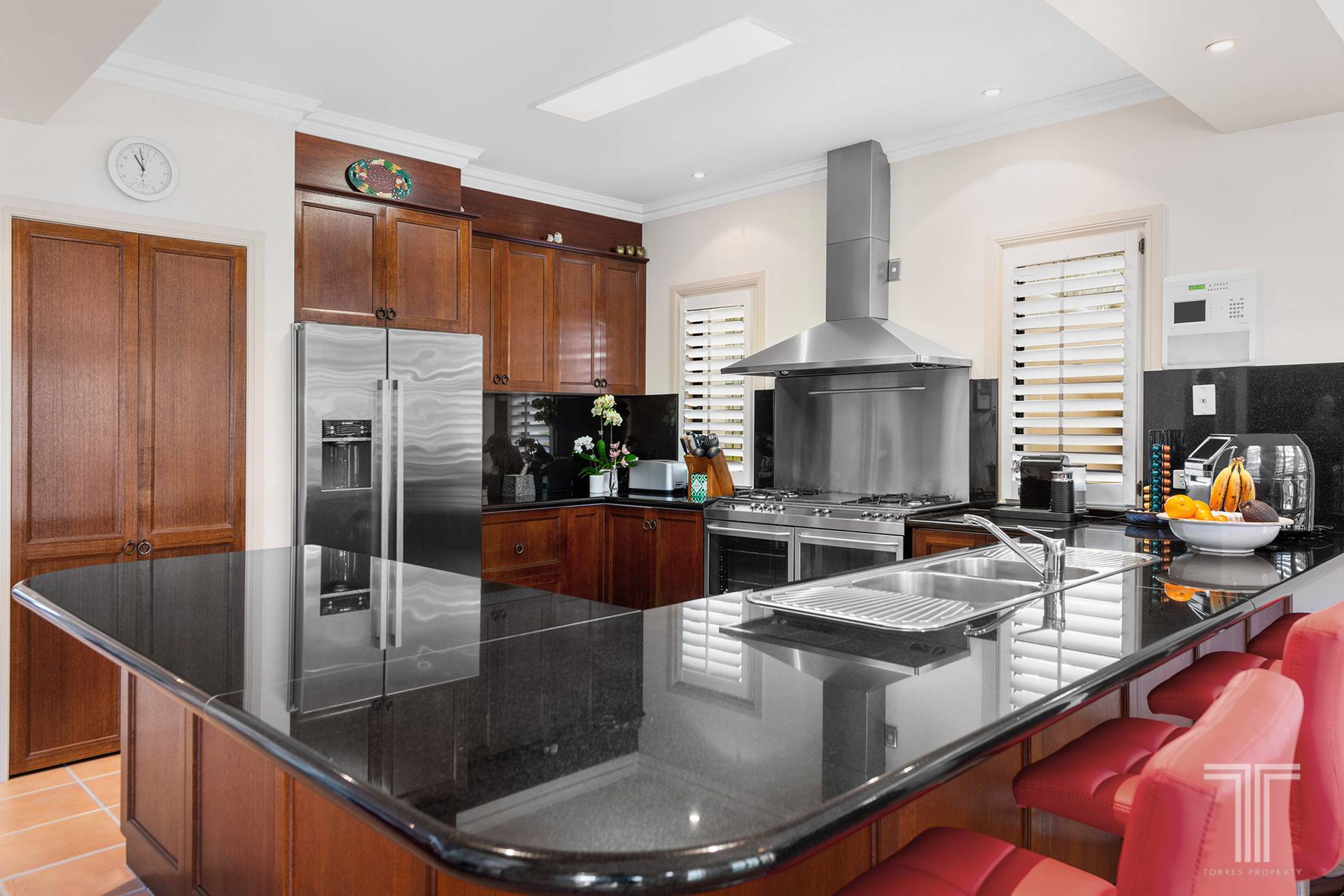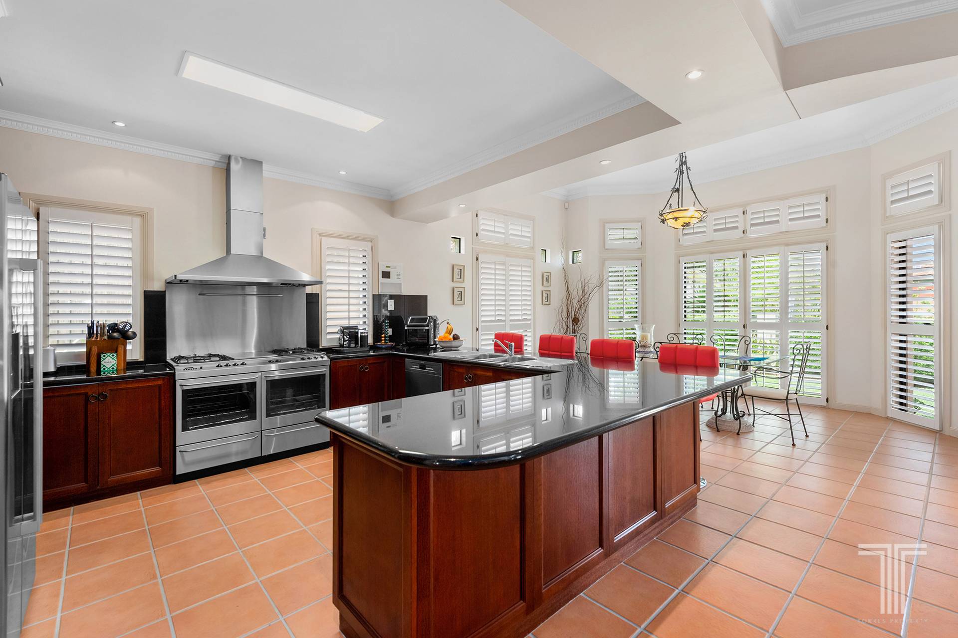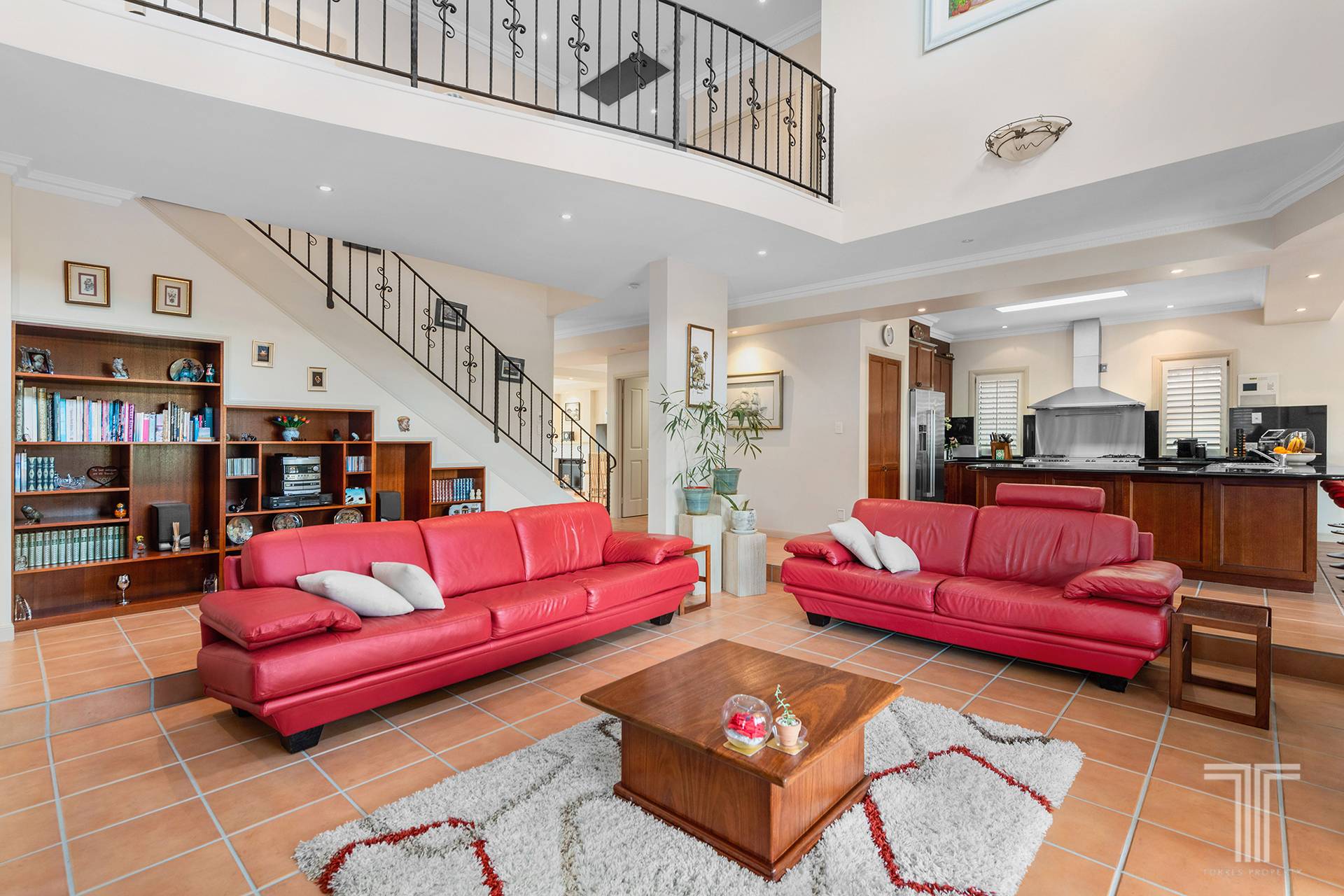 The formal living room greets you with an immediate feeling of comfort and extends to the relaxing sun porch framed by tropical palm trees. At the rear, an open-plan family area with a soaring void connects seamlessly with the rumpus, dining space and functional kitchen. Designed for the entertainer, the kitchen includes a large gas stove, dual ovens, a walk-in pantry, and a breakfast bar for casual dining.