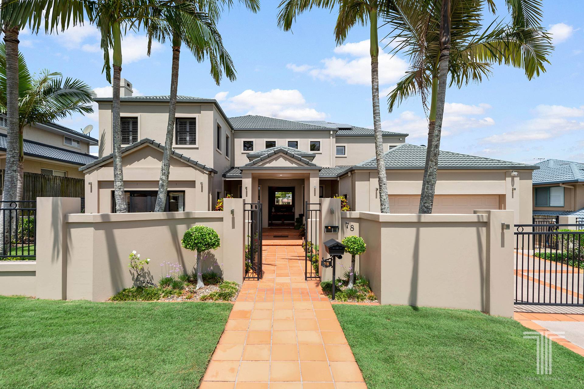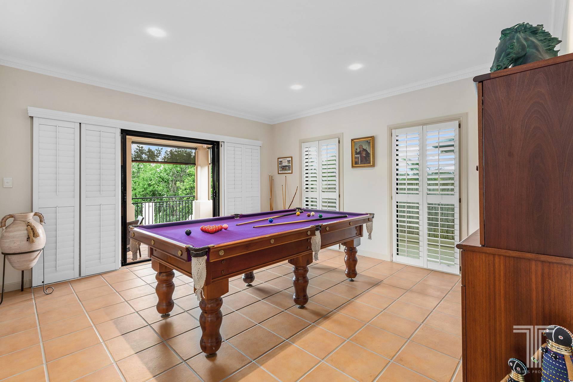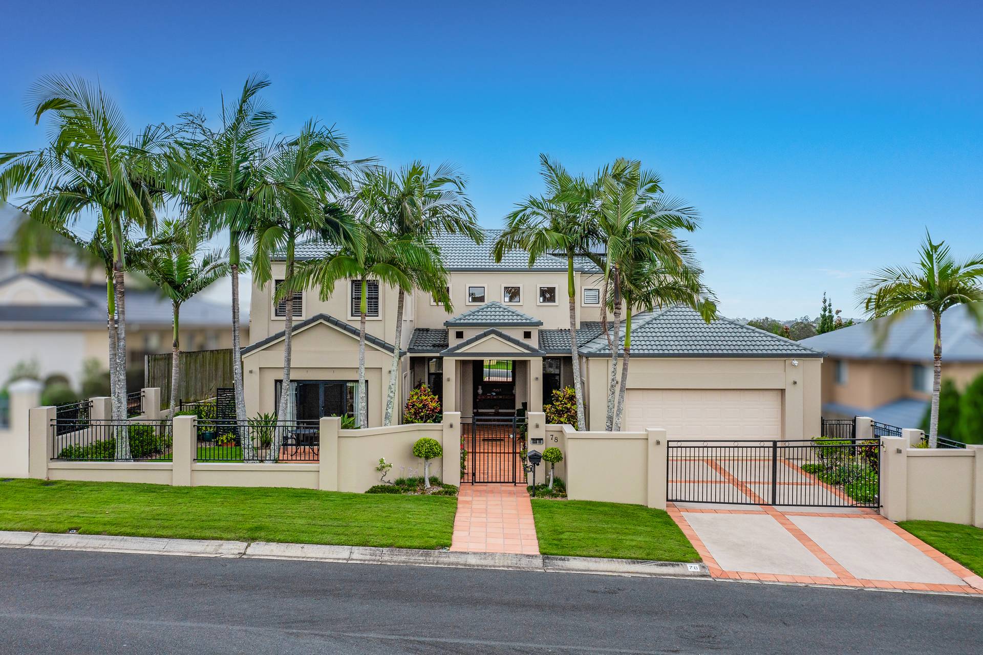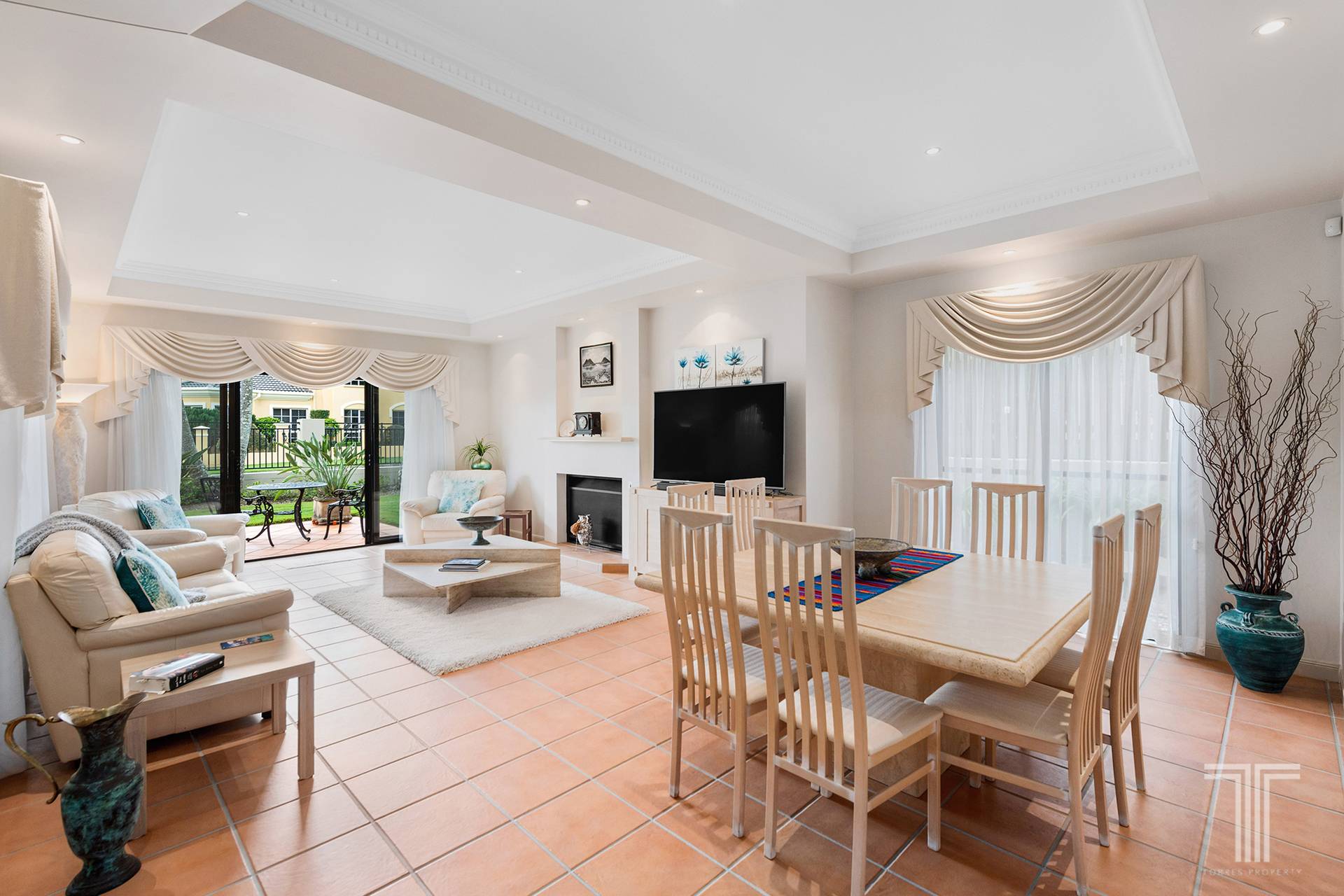 The formal living room greets you with an immediate feeling of comfort and extends to the relaxing sun porch framed by tropical palm trees. At the rear, an open-plan family area with a soaring void connects seamlessly with the rumpus, dining space and functional kitchen. Designed for the entertainer, the kitchen includes a large gas stove, dual ovens, a walk-in pantry, and a breakfast bar for casual dining.