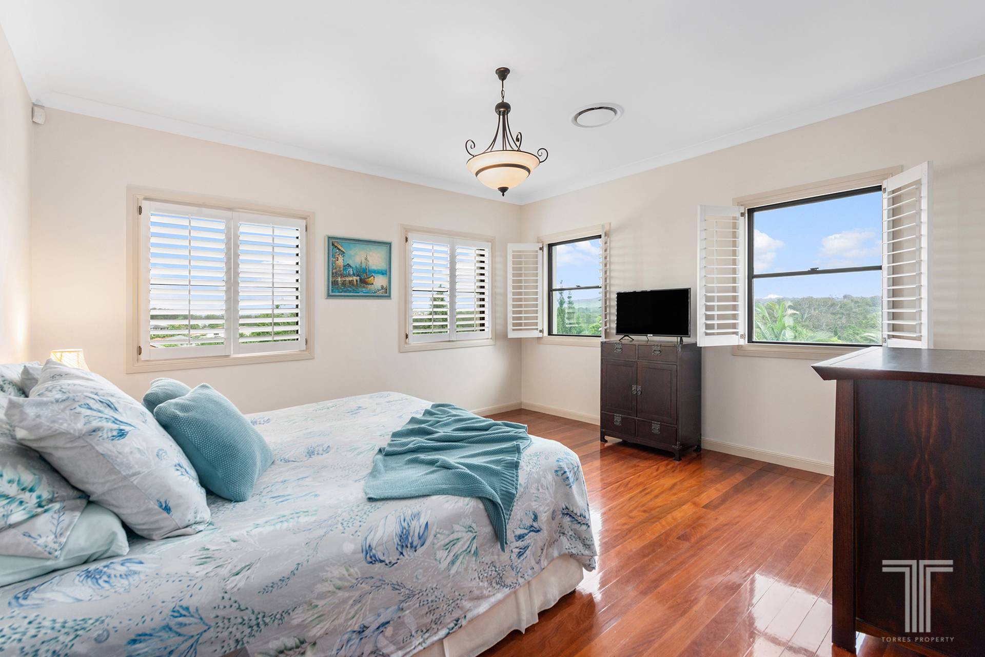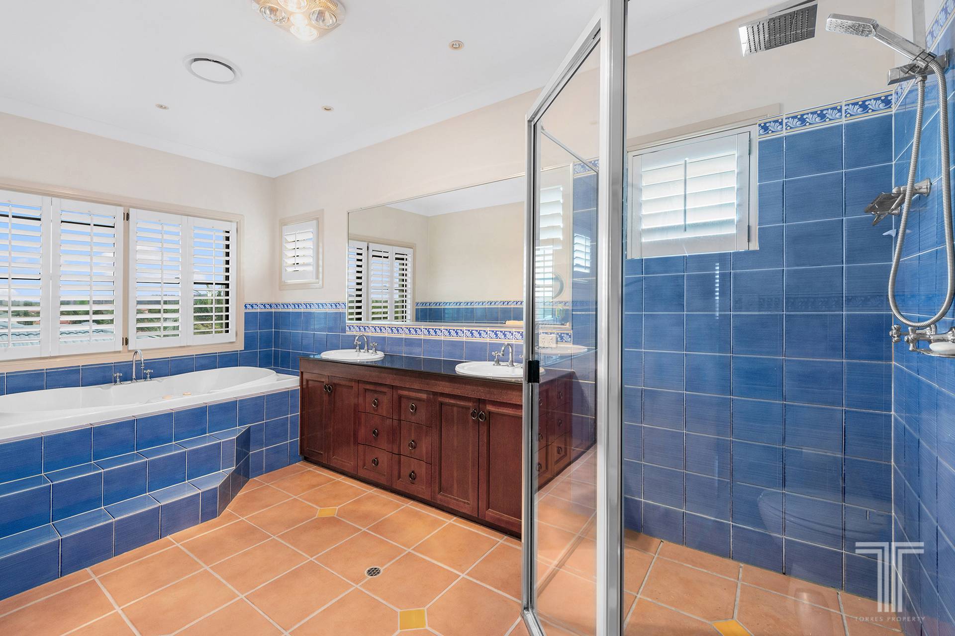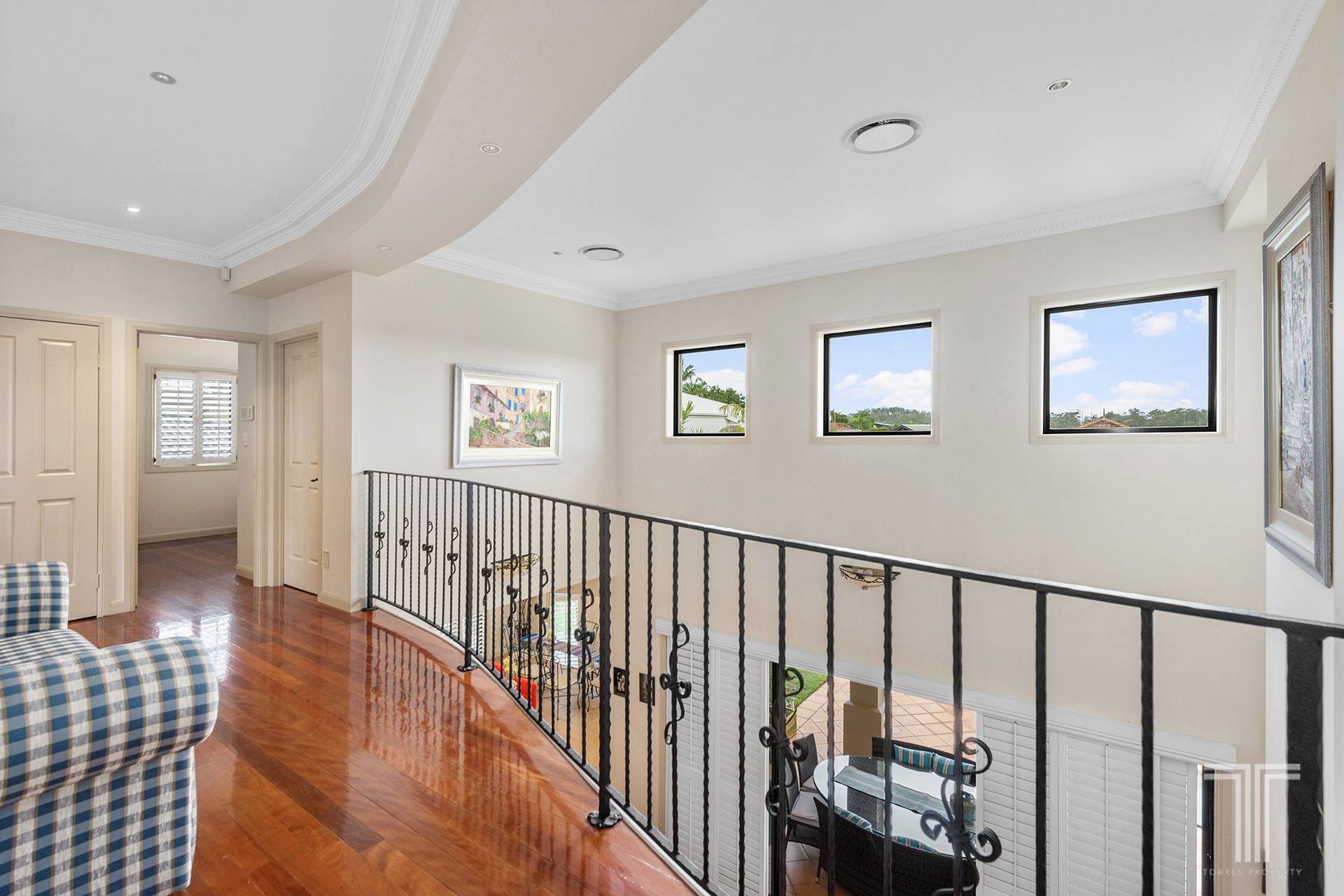 The upper level features a gallery walkway connecting four bedrooms and two bathrooms. The master suite occupies a private wing and reveals a walk-in robe and dual vanity ensuite with a relaxing bath to soak in the elevated views. A study is thoughtfully positioned on the ground floor with easy access to the third bathroom.