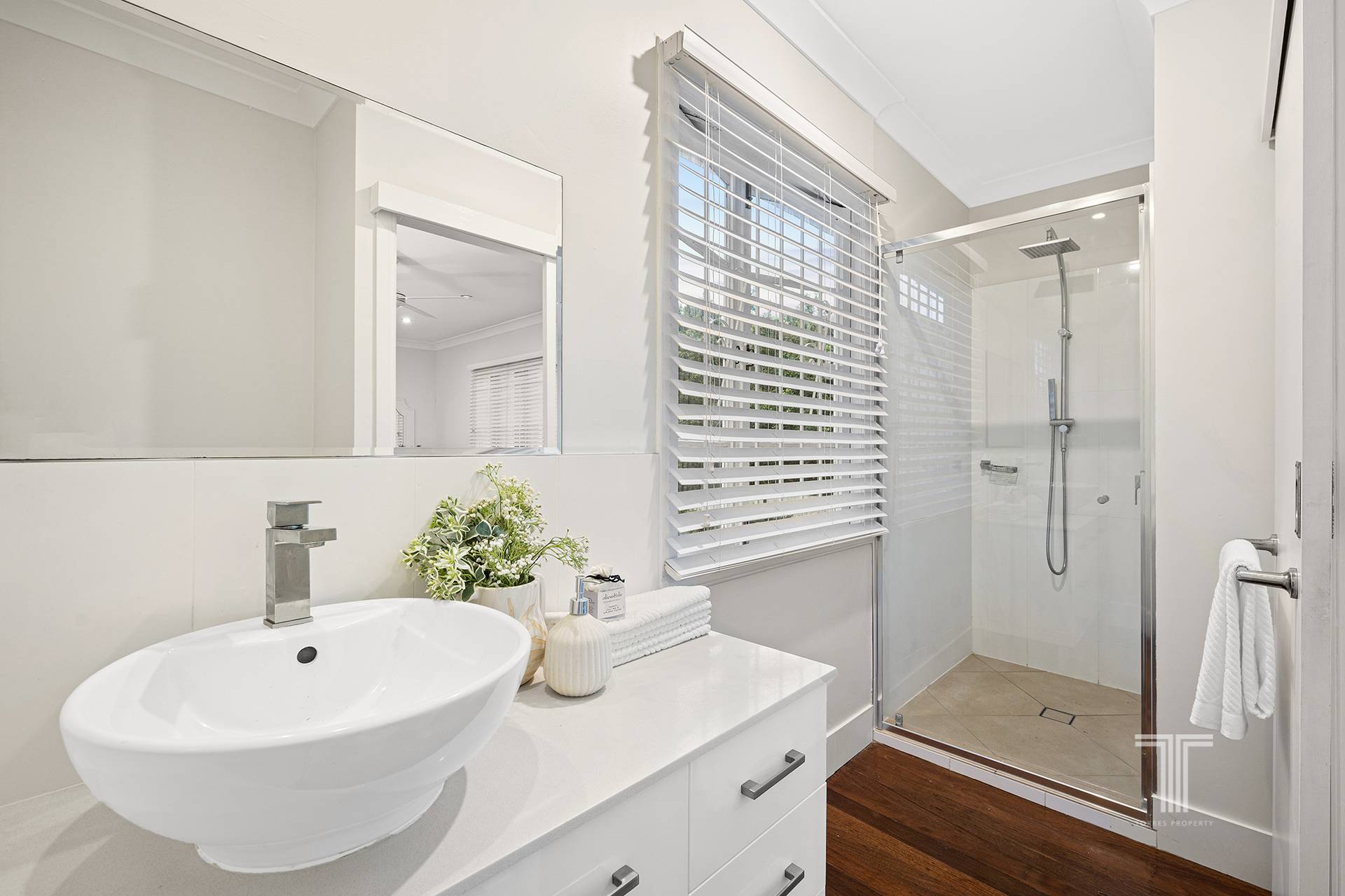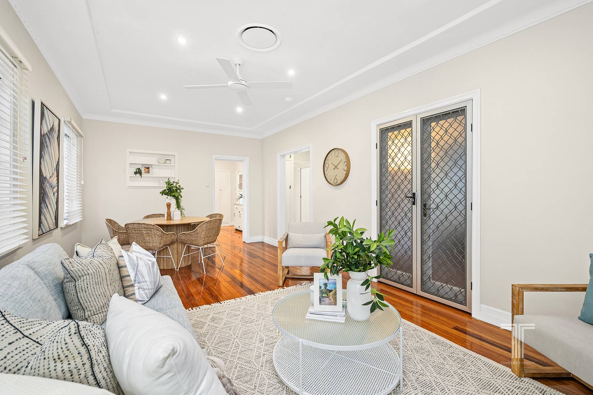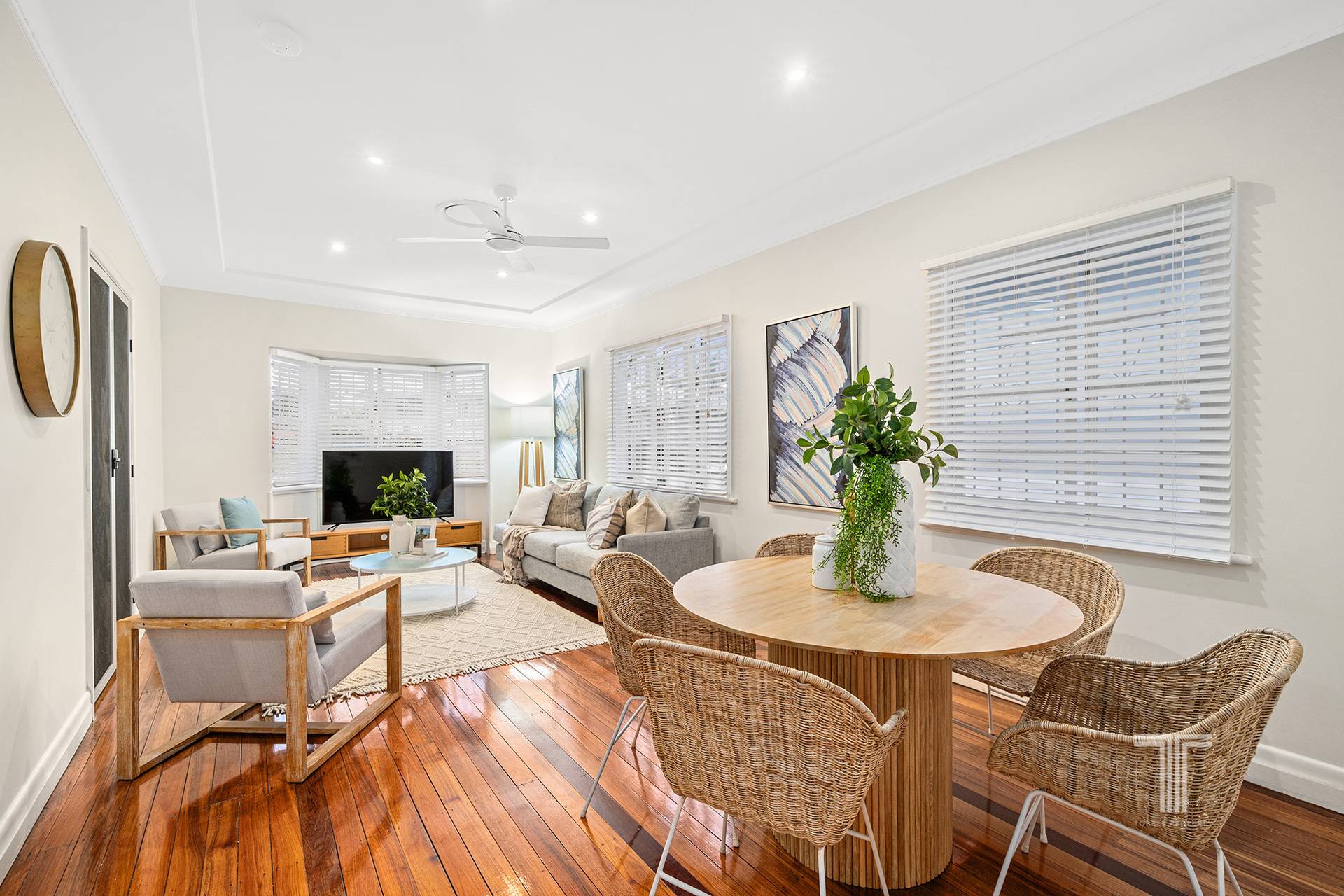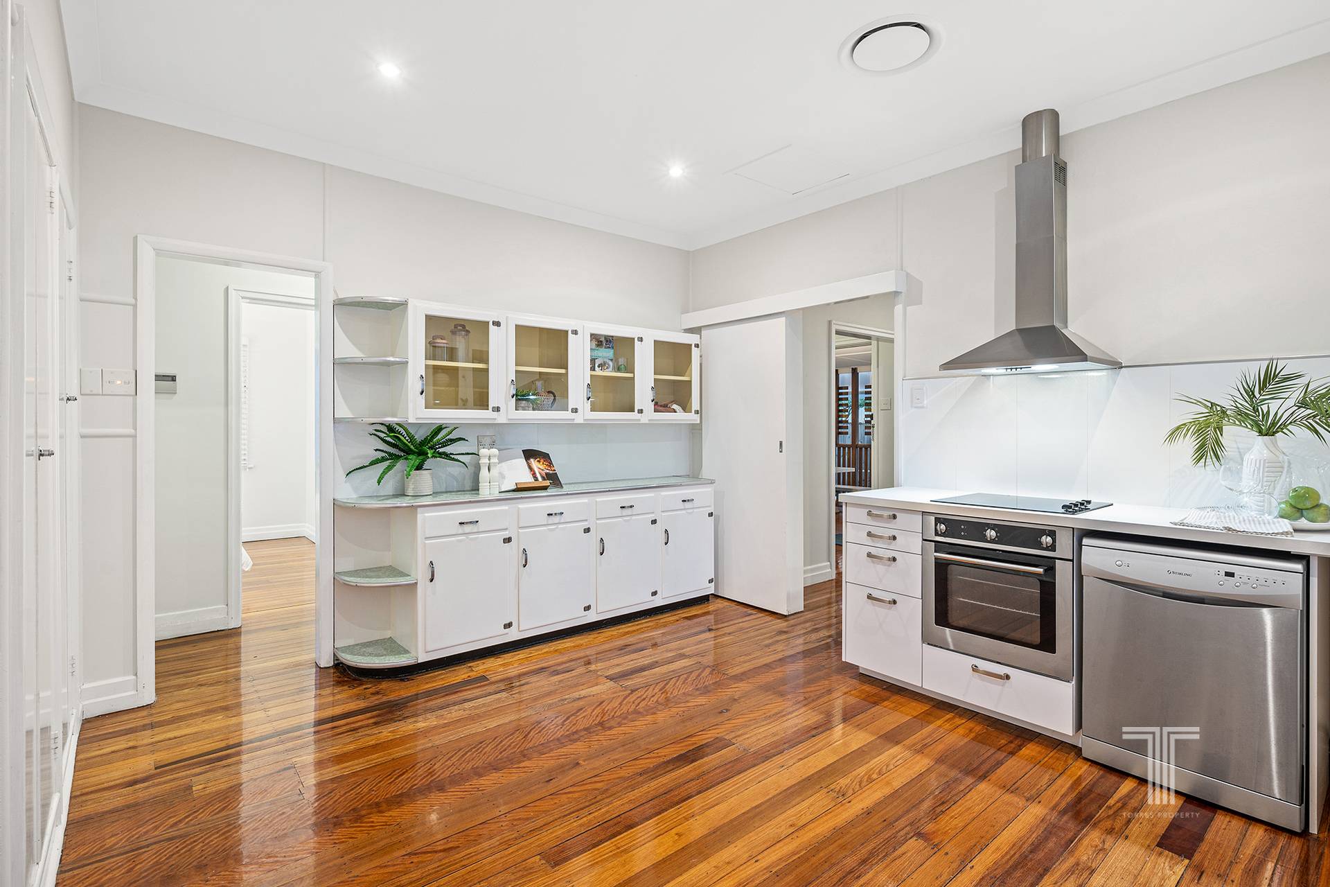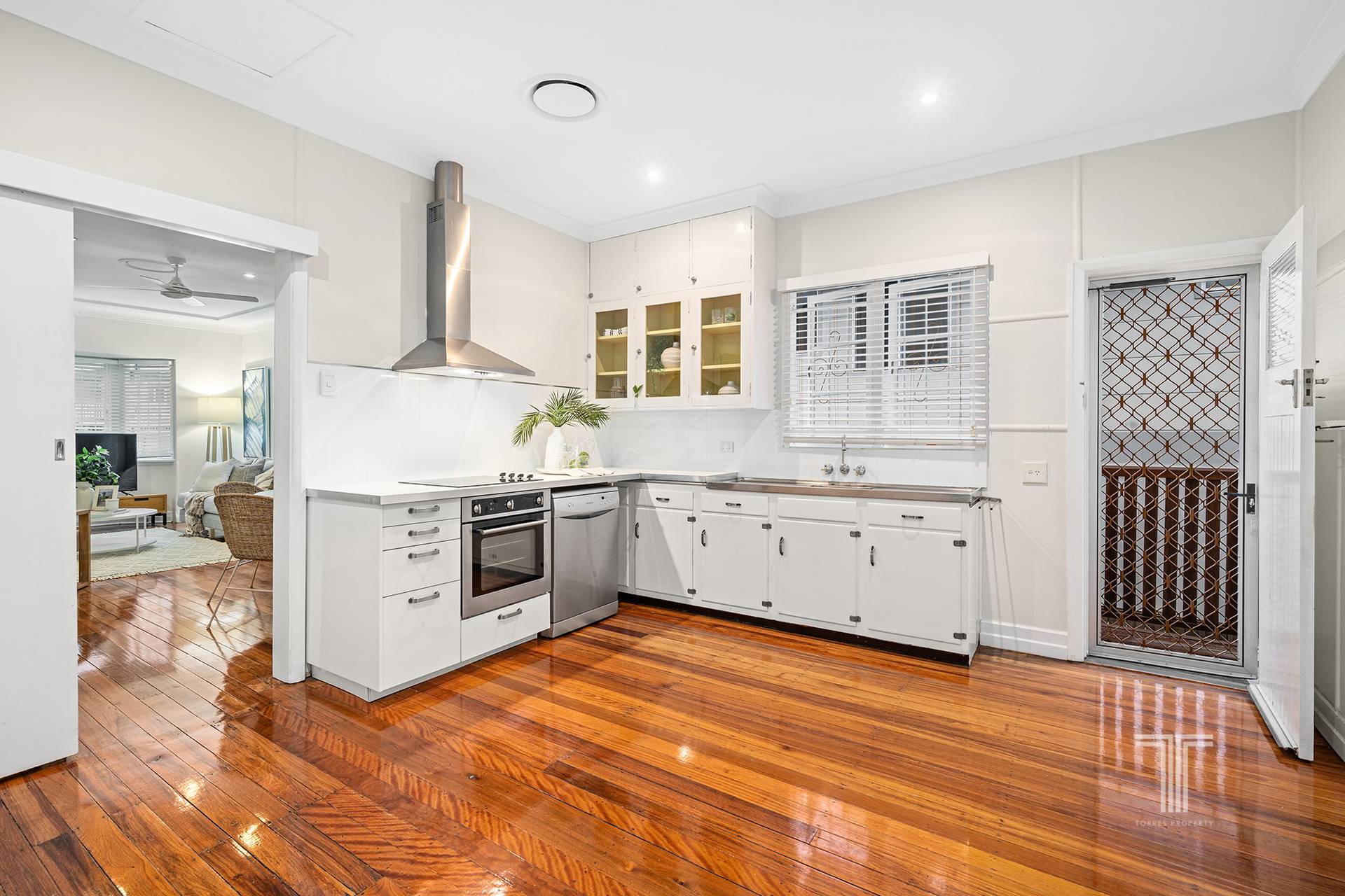 The interiors offer functional living with an inviting lounge and dining area featuring polished wooden floorboards and French blinds. The renovated kitchen unveils an open design with stainless steel appliances, including a dishwasher and an electric cooktop with rangehood.