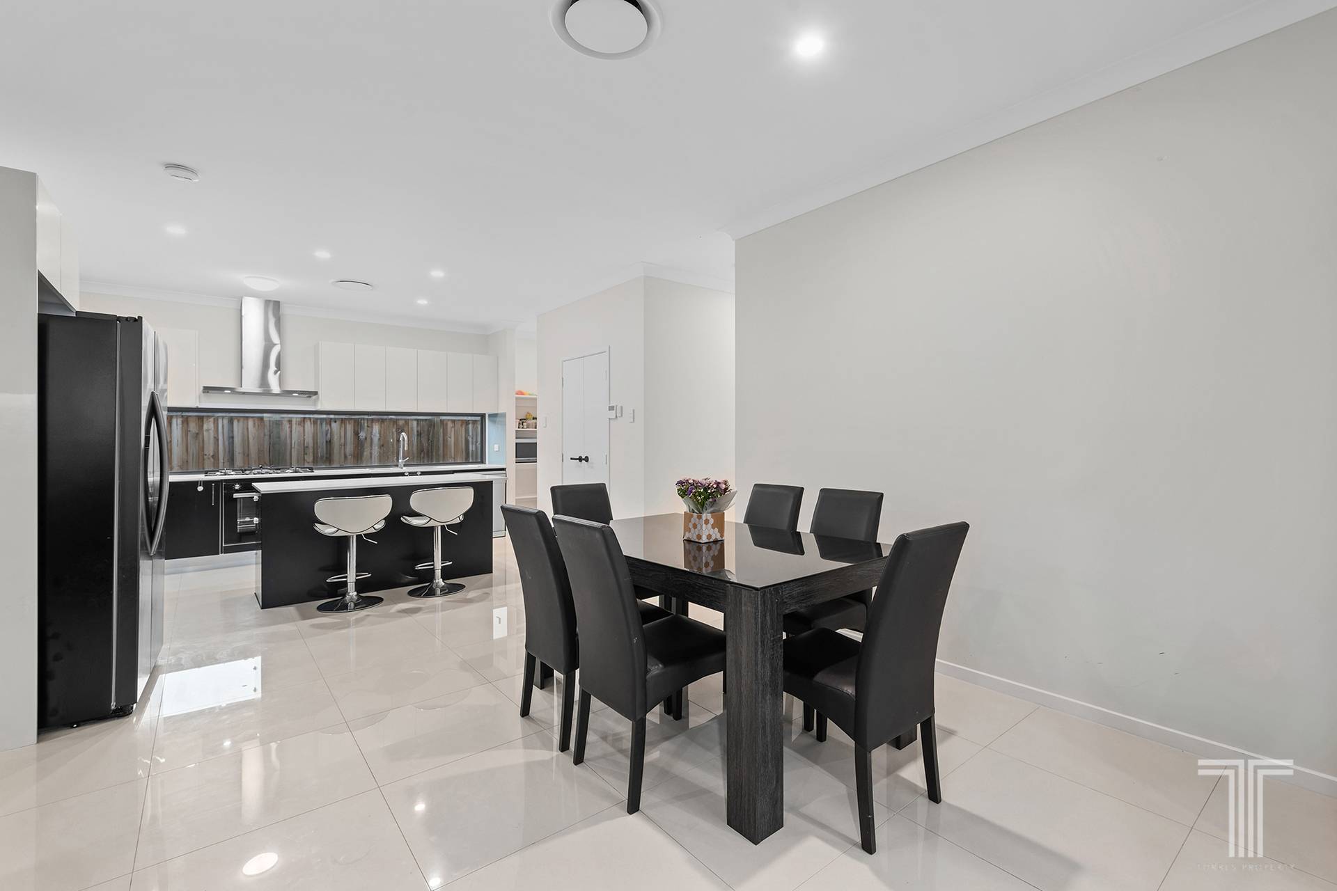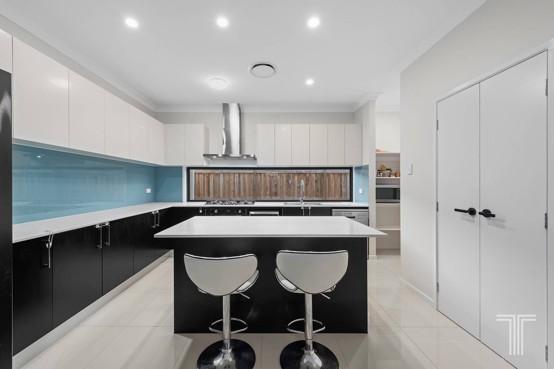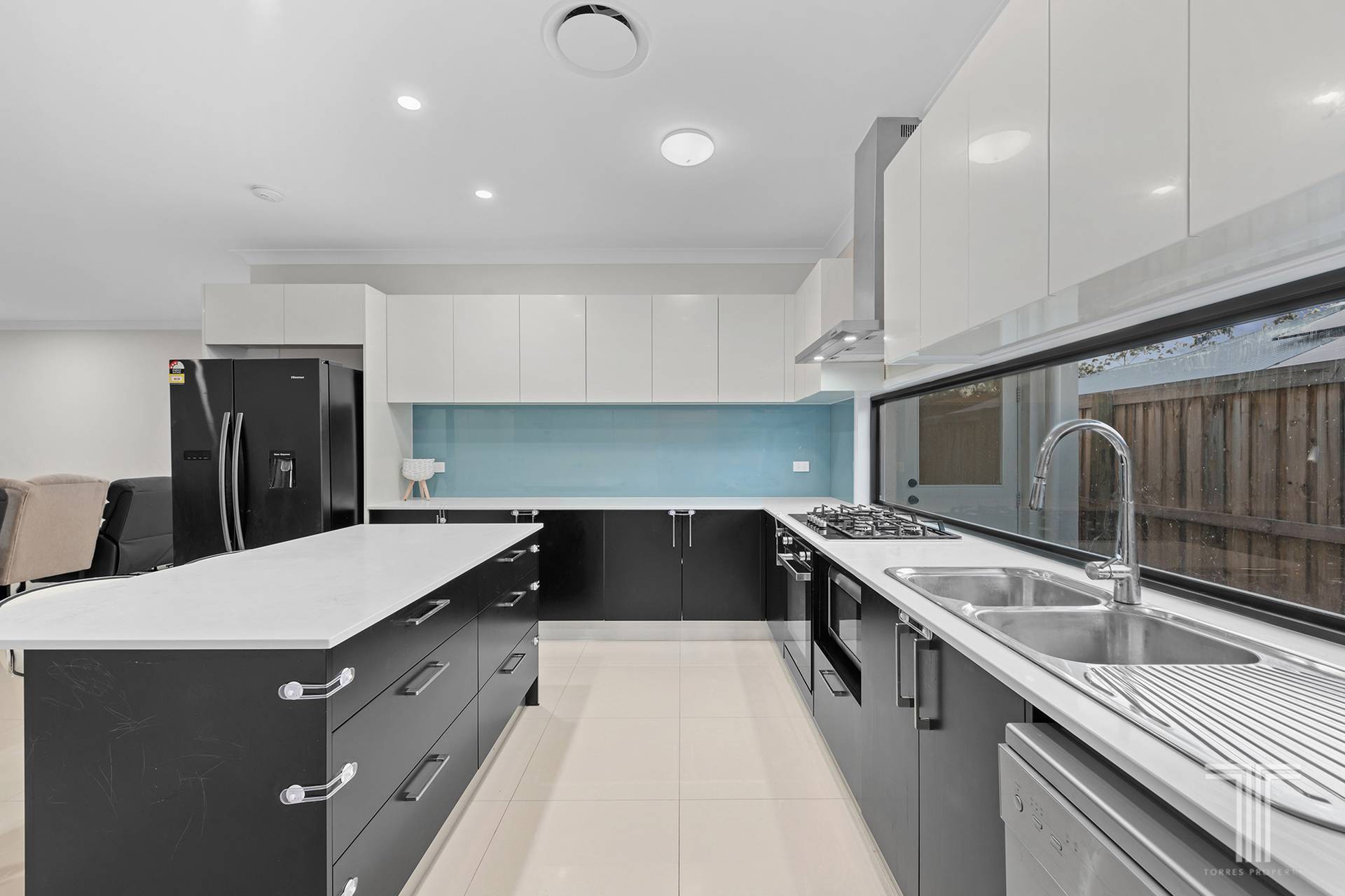 2.7-metre ceilings adorn the stylish interiors, and the open design creates plenty of space to relax and come together. The modern kitchen overlooks the spacious lounge and dining area and is well-appointed with an oversized island bench, glass splashback, stainless steel appliances and a walk-in pantry.