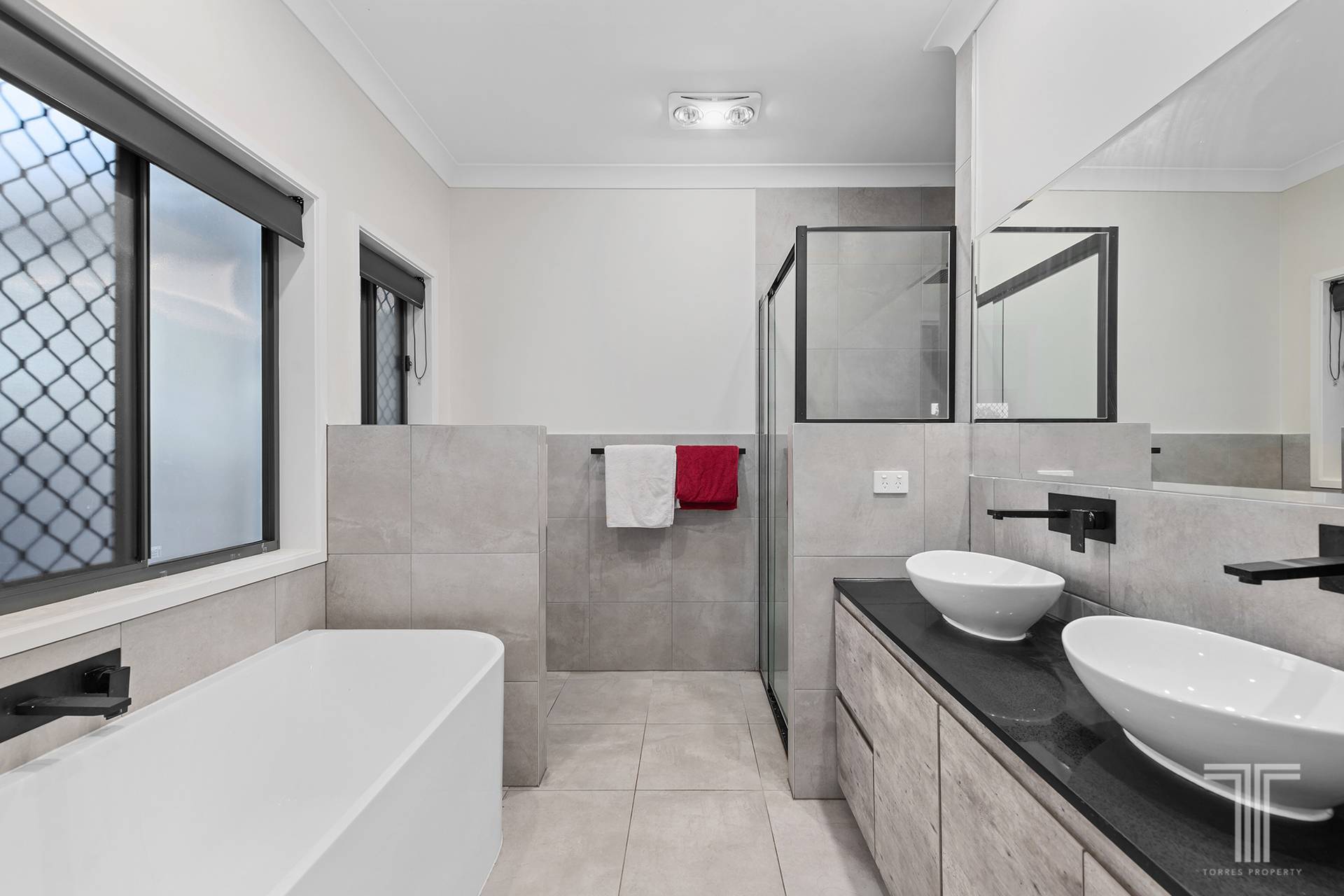 The functional layout hosts five carpeted bedrooms (or three carpeted bedrooms, a family media room and a hybrid vinyl flooring master bedroom). Two modern bathrooms, a guest powder room and a laundry. The master presents a lovely retreat with sliding door access to the patio, a large two-way walk-in robe and a stunning ensuite featuring dual vanities and a luxe bath.