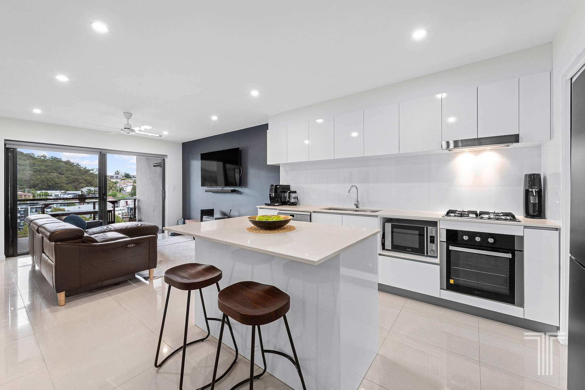 The bright and open layout greets you with a lounge and dining area featuring air-conditioning and glass sliders that frame the tranquil views across Mt Gravatt Mountain. The modern kitchen hosts plenty of storage, an island bench and a gas cooktop to make meal preparation a breeze.