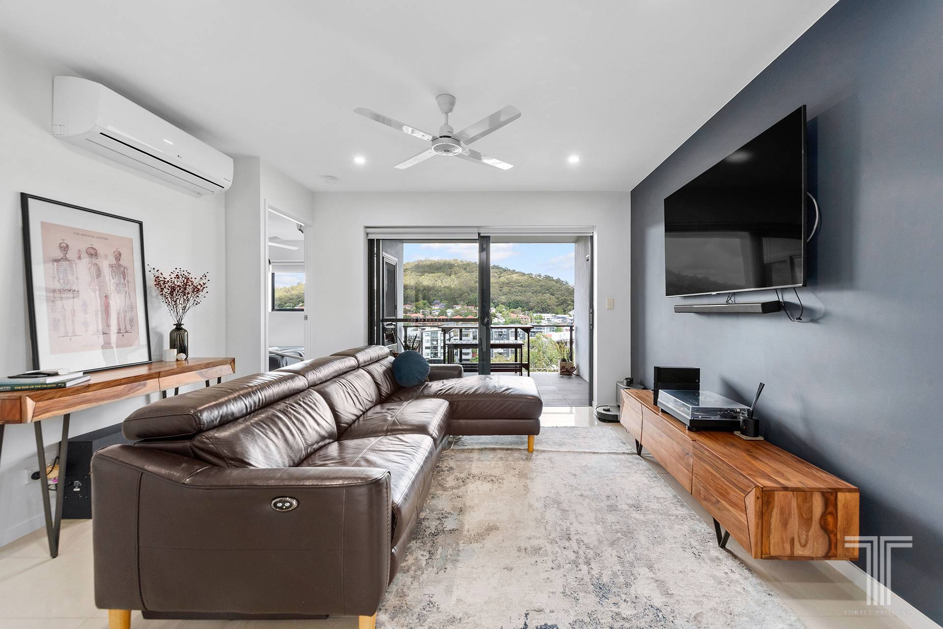 Two bedrooms feature built-in robes and ceiling fans. The master boasts a spacious ensuite, air-conditioning, mountain vistas and access to the balcony. The second bathroom includes the laundry, and the secure car park features a storage cage.