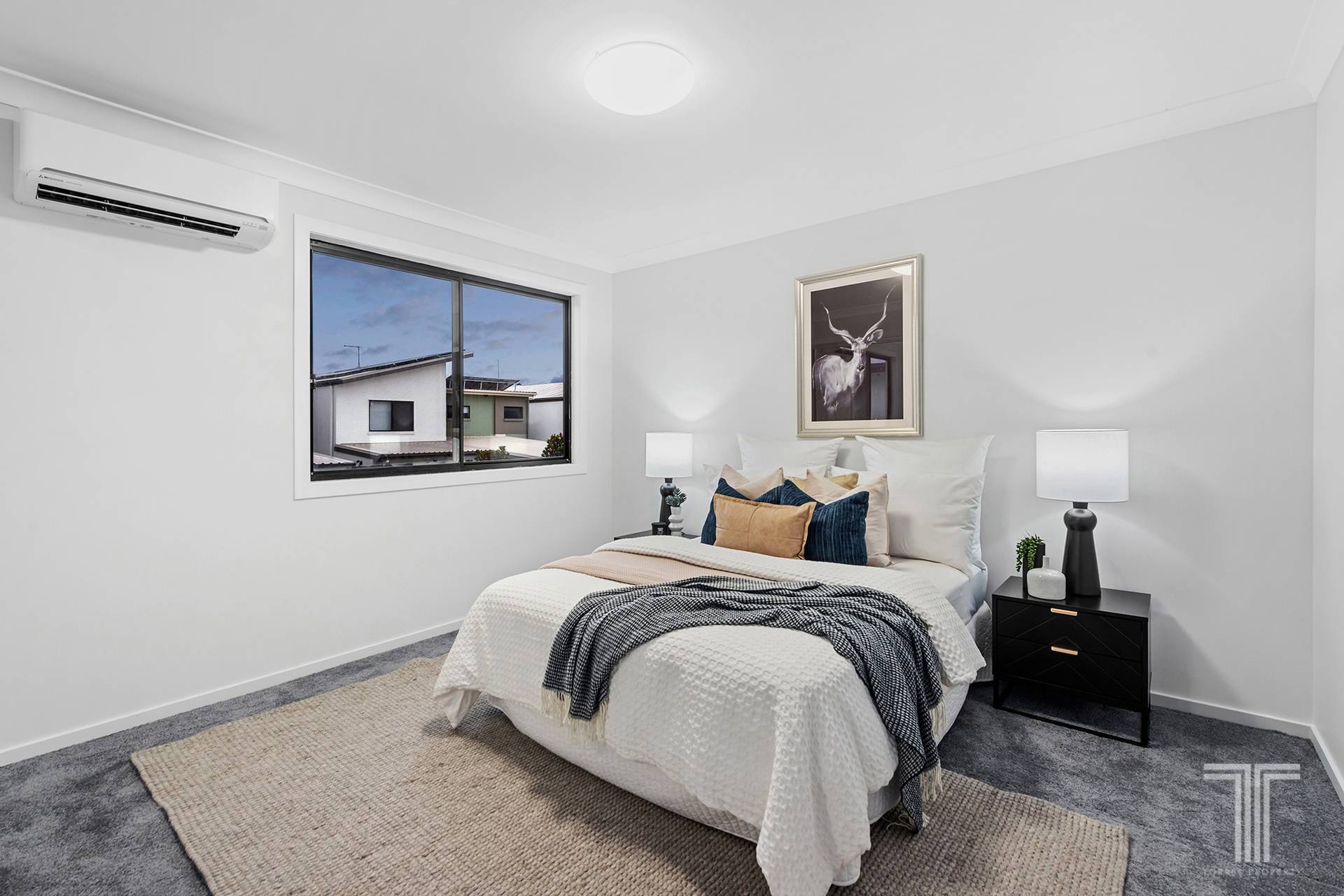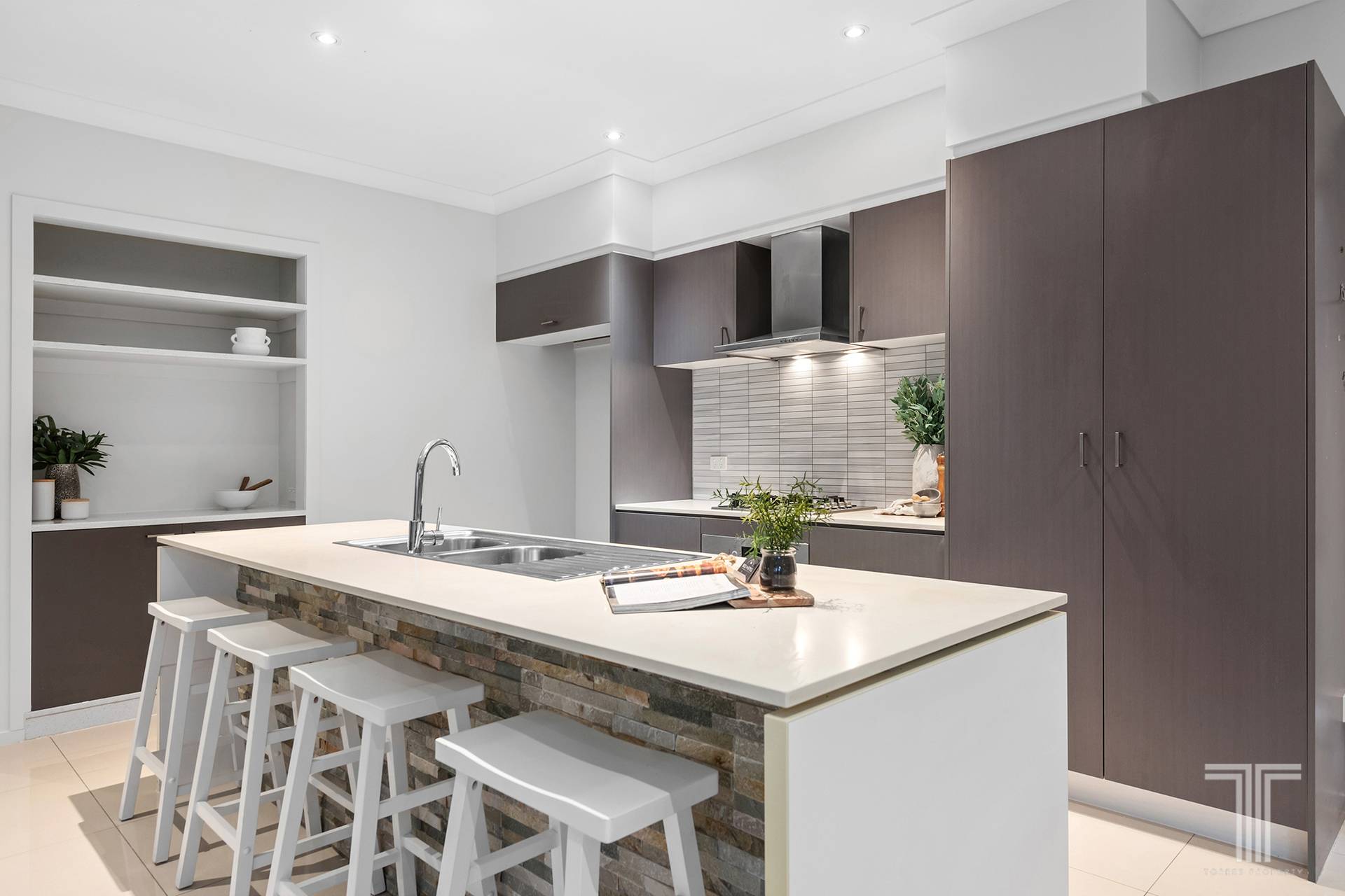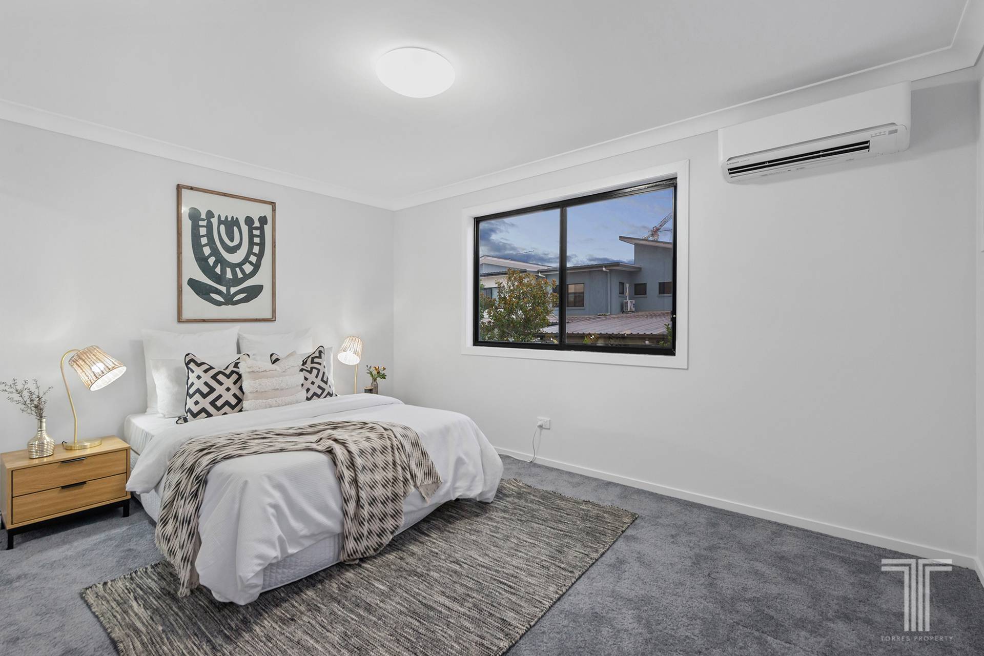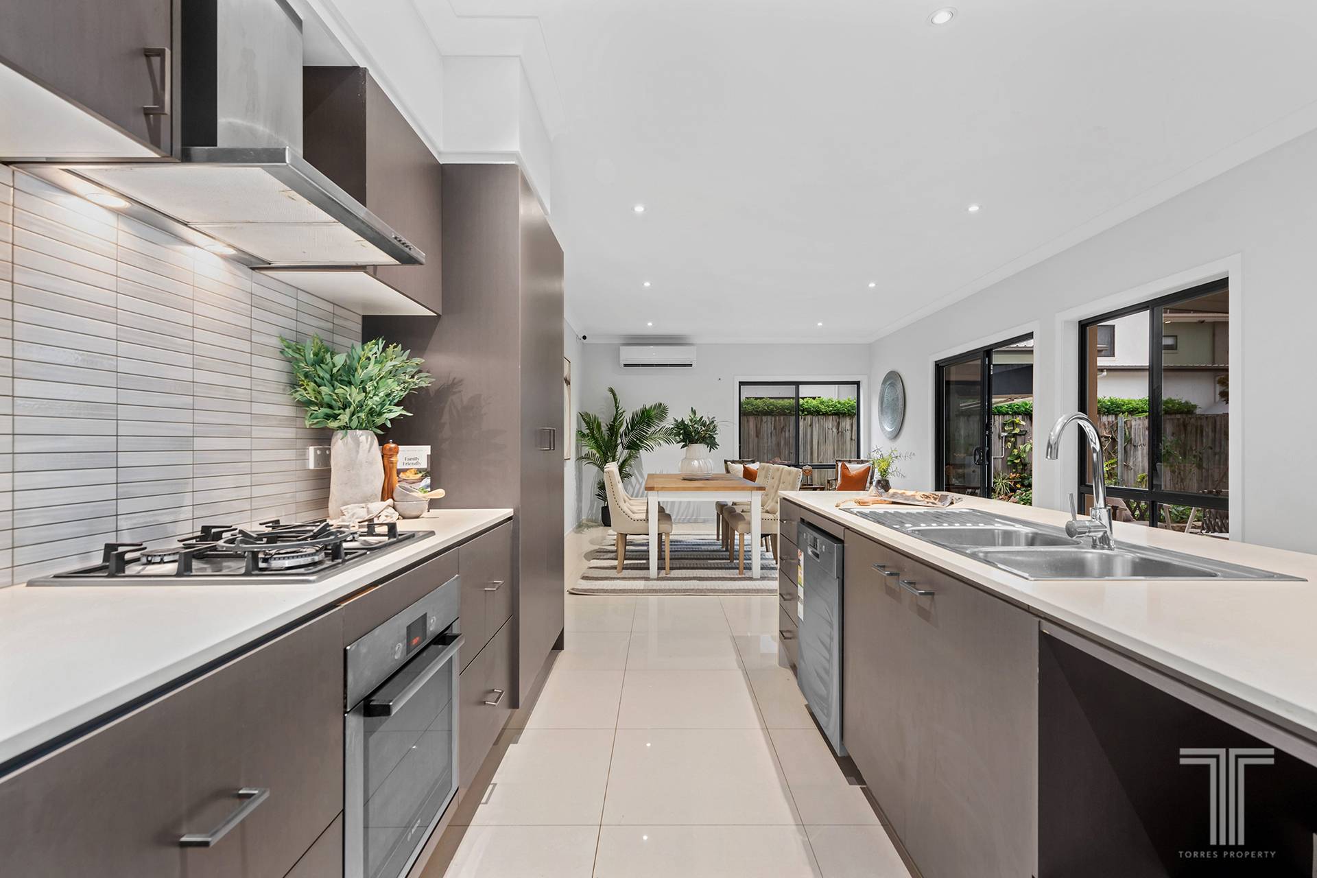 The contemporary design unveils sleek tiles, plush carpet, downlights and air-conditioning. Centring around the open plan kitchen, this culinary retreat includes an island bench, tiled splashback, stainless steel appliances and a gas cooktop.