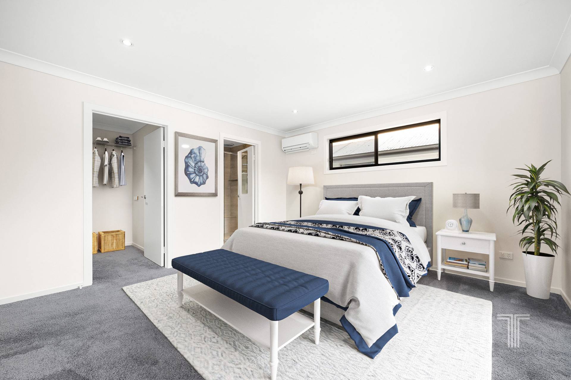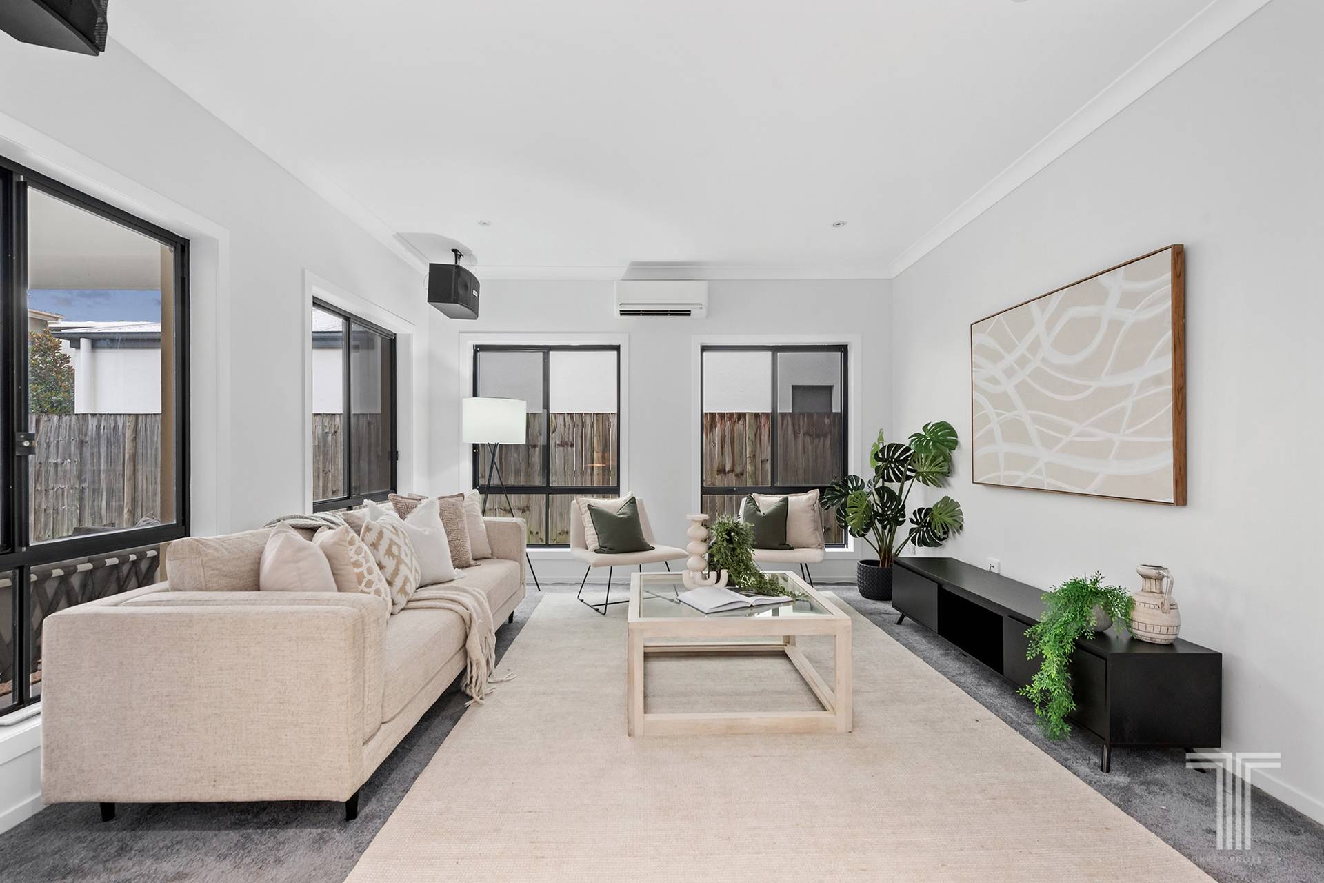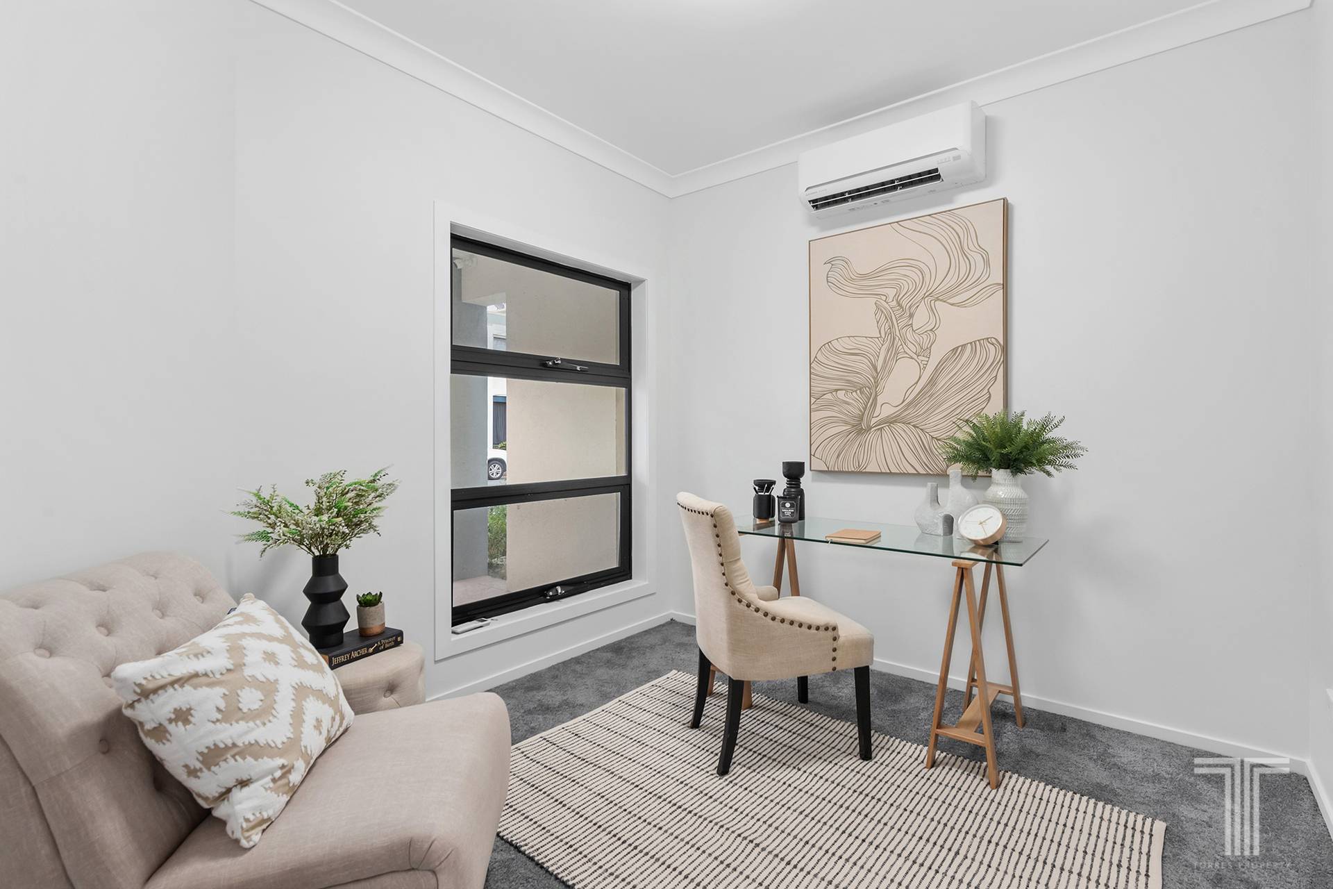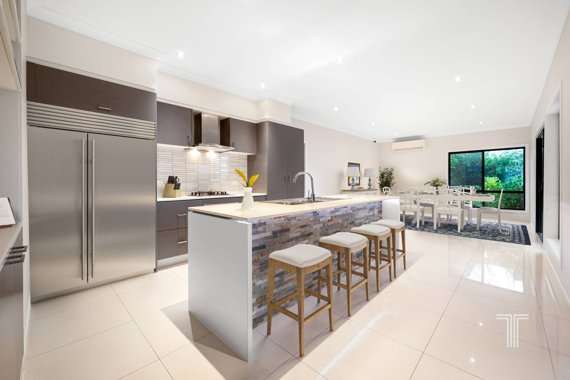 The contemporary design unveils sleek tiles, plush carpet, downlights and air-conditioning. Centring around the open plan kitchen, this culinary retreat includes an island bench, tiled splashback, stainless steel appliances and a gas cooktop.