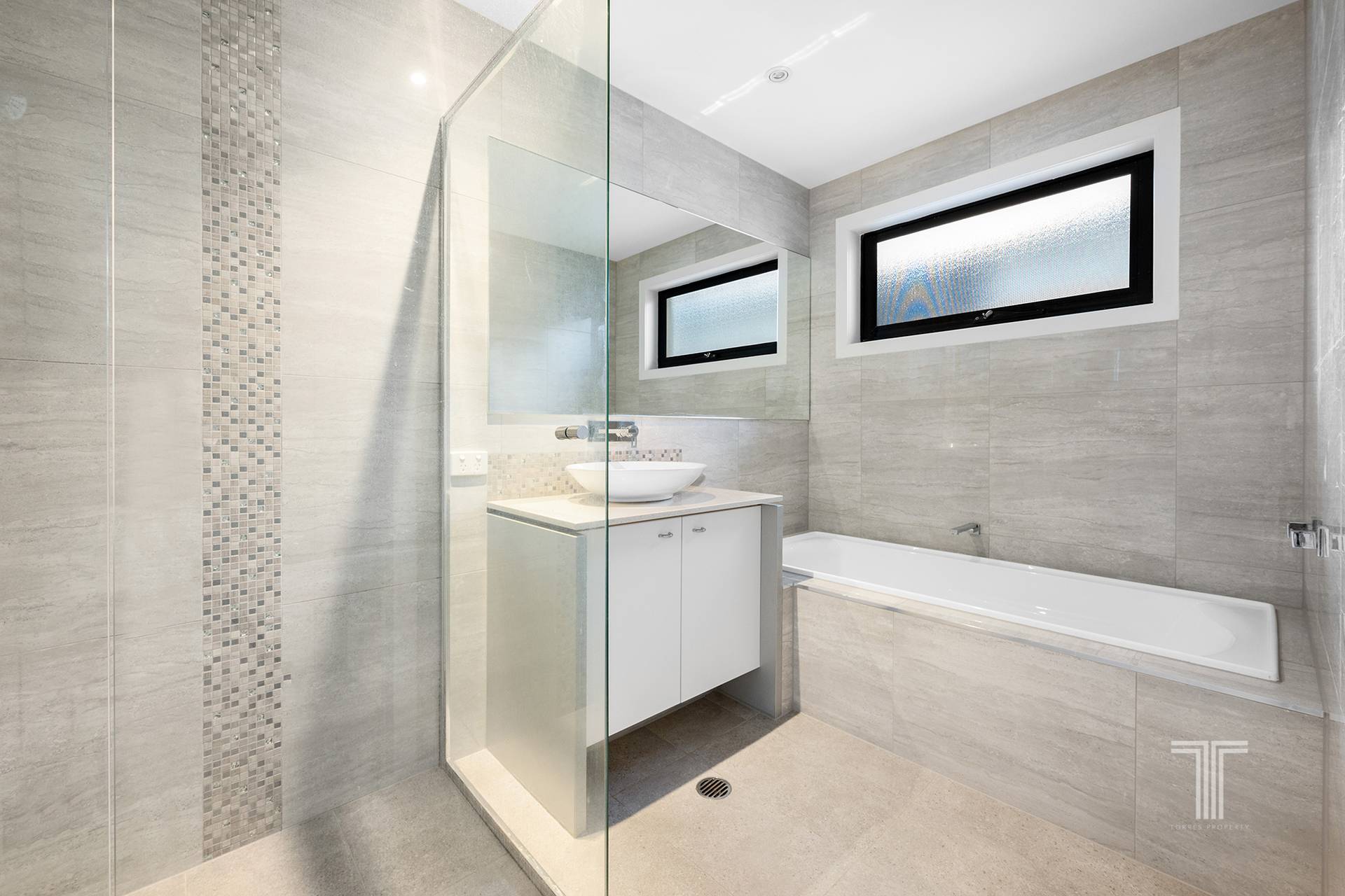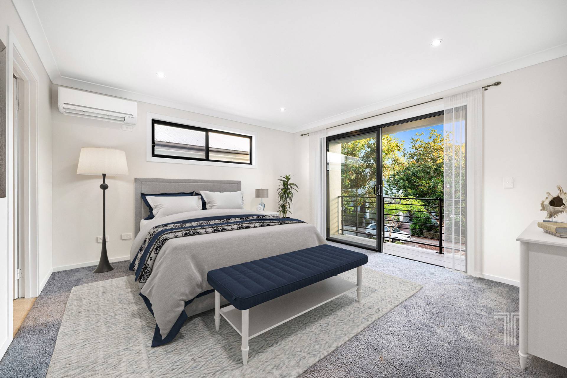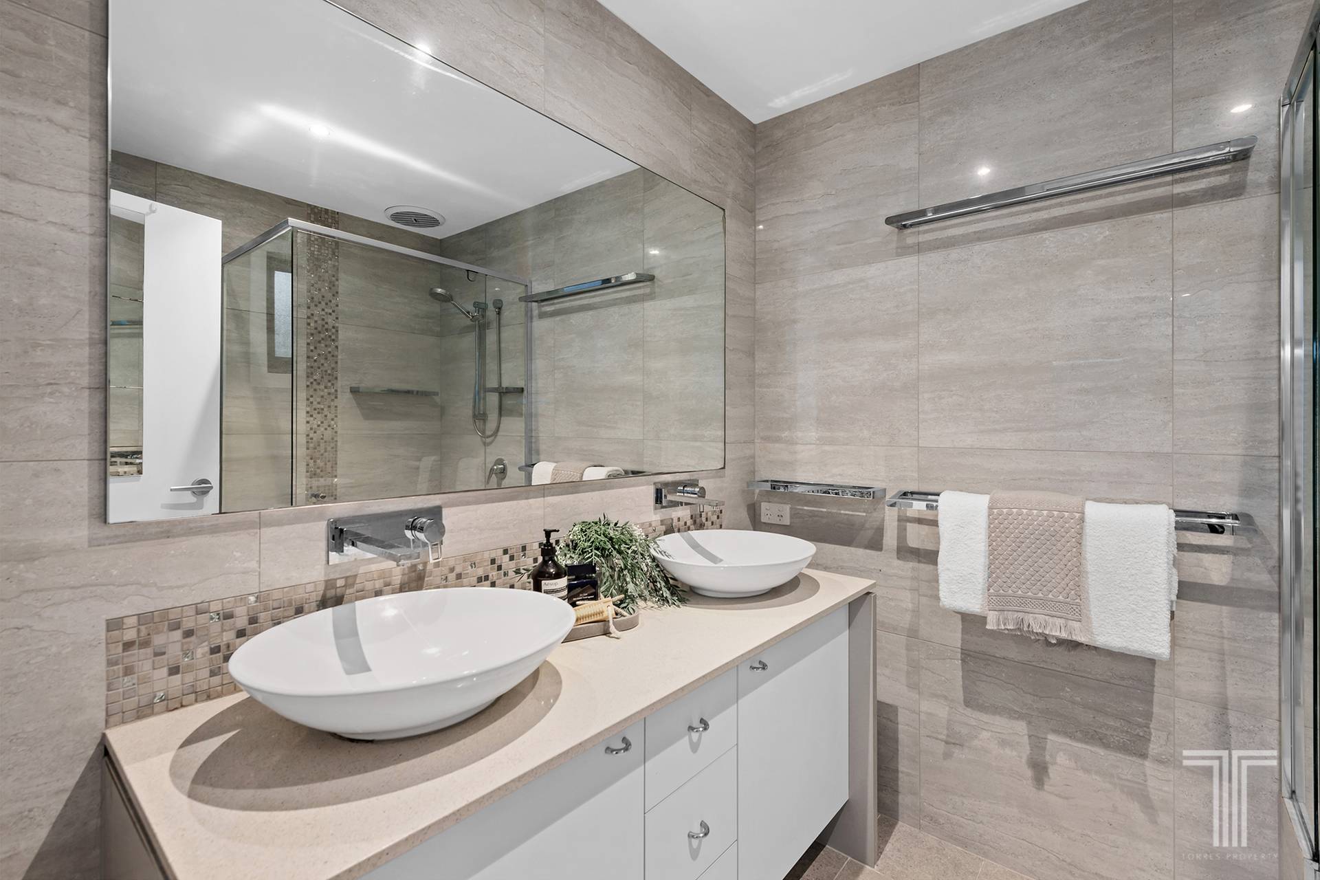 A study and powder room are on the entry-level, while four good-sized bedrooms and two bathrooms with bidets reside upstairs. Two bedrooms boast private balconies, including the master suite, revealing a walk-in robe and ensuite with dual vanities and a shower with built-in seating. The other bedrooms feature built-in robes and access to the family bathroom with a bathtub and separate toilet. Finalising this stylish layout is a double garage with laundry.