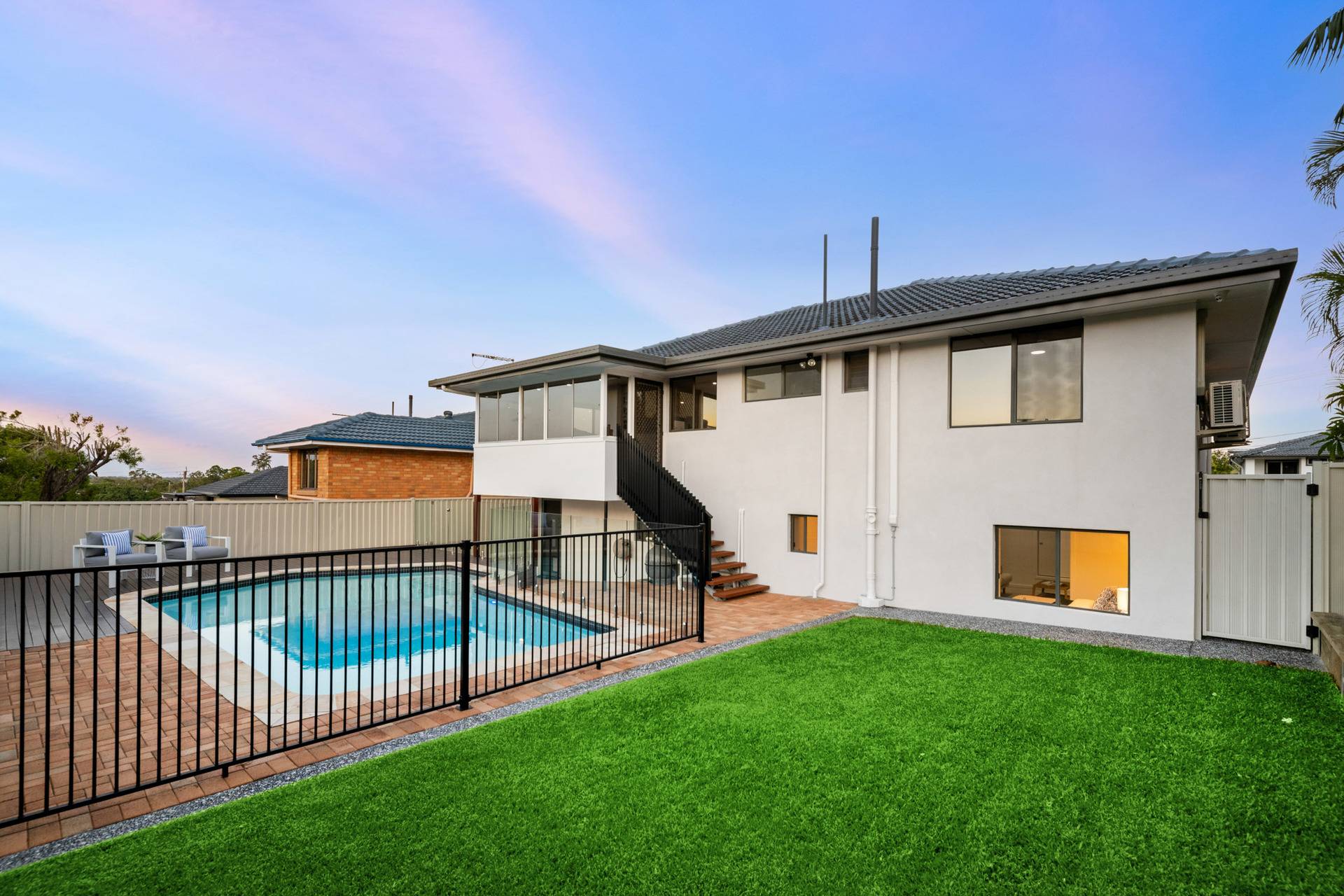 A bathroom and three bedrooms with ceiling fans and built-in robes are upstairs, plus a study/sunroom with inspiring outlooks and views over the pool and yard below. This outdoor setting offers a peaceful retreat to lounge, swim, play or enjoy poolside drinks with friends as the sun goes down.