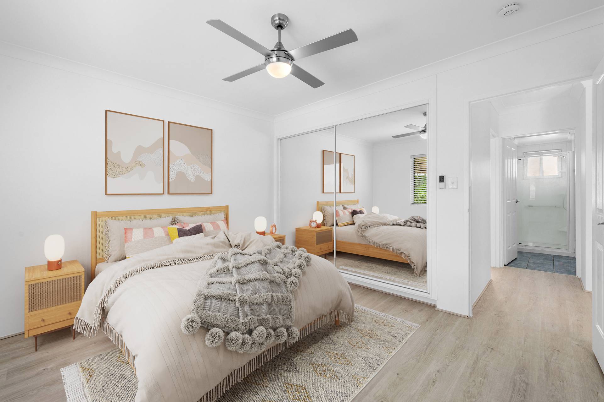 Two well-sized bedrooms feature mirrored built-in robes, ceiling fans and access to the large bathroom. The large lock-up garage below includes a laundry.