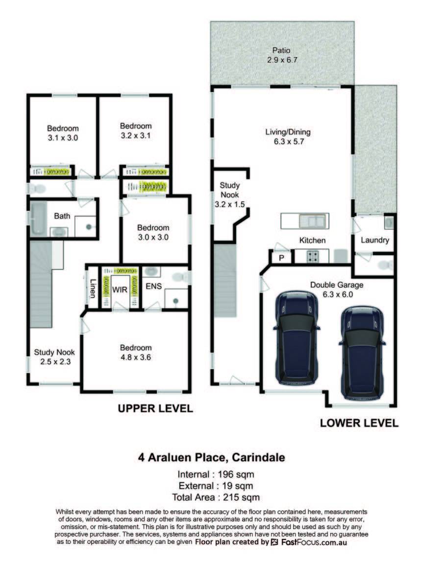 Study nooks are on both floors, and four bedrooms and two bathrooms reside upstairs. All the bedrooms feature built-in robes, and the large master includes a walk-in robe and ensuite. A third toilet is located off the downstairs laundry, and the house is complete with ceiling fans, security screens, and a double garage.