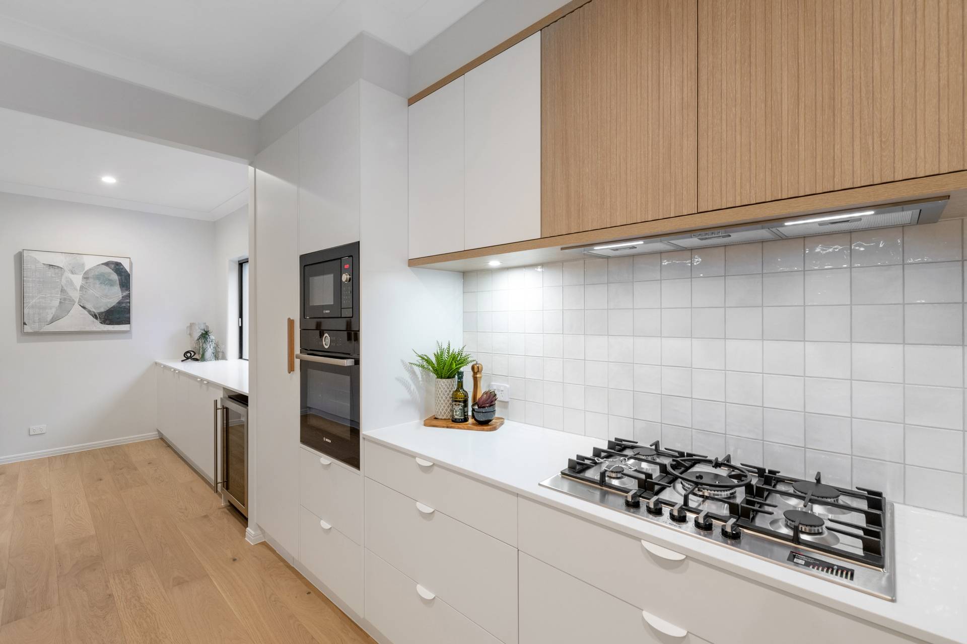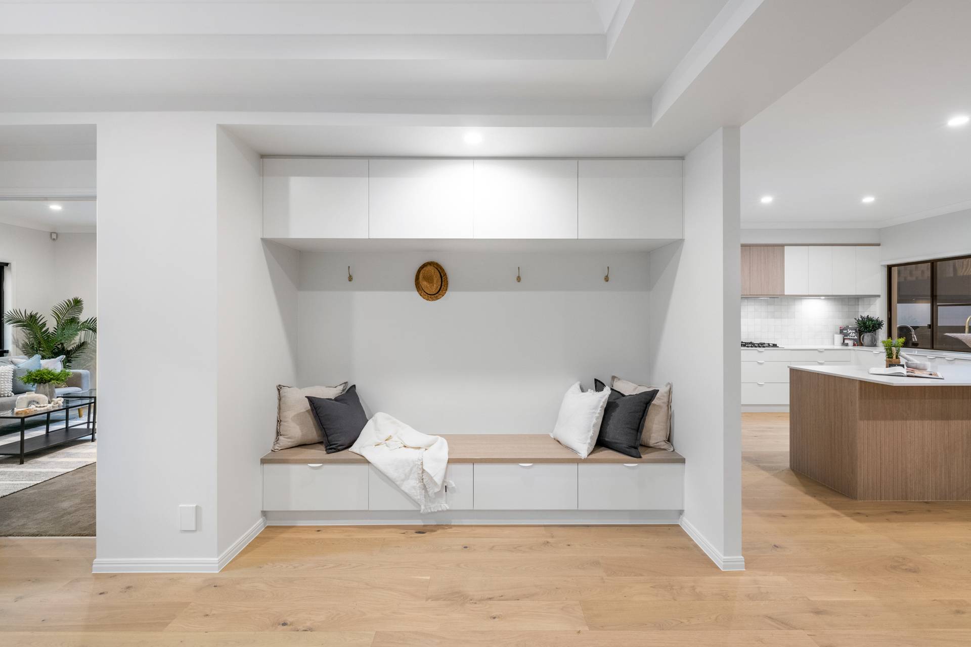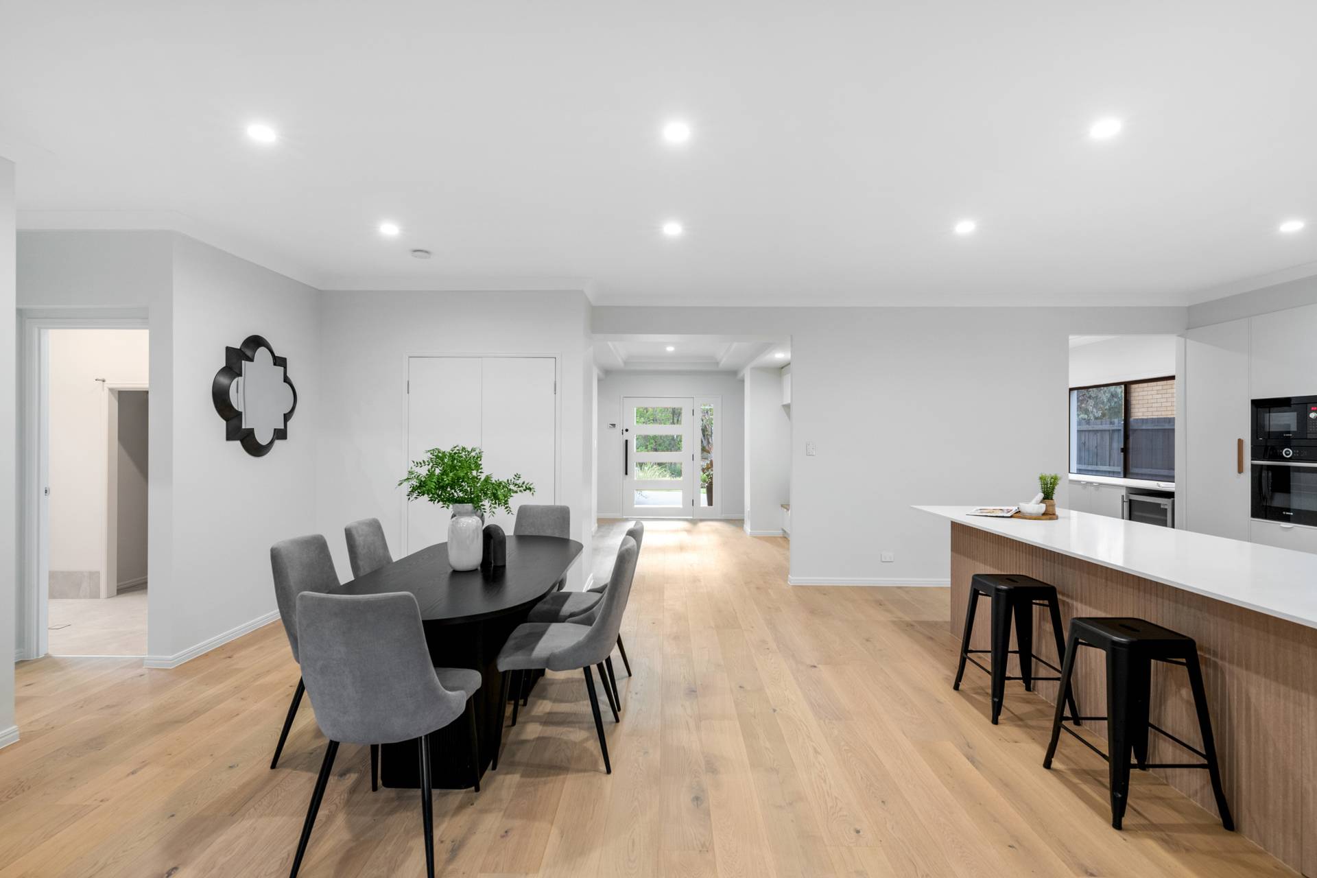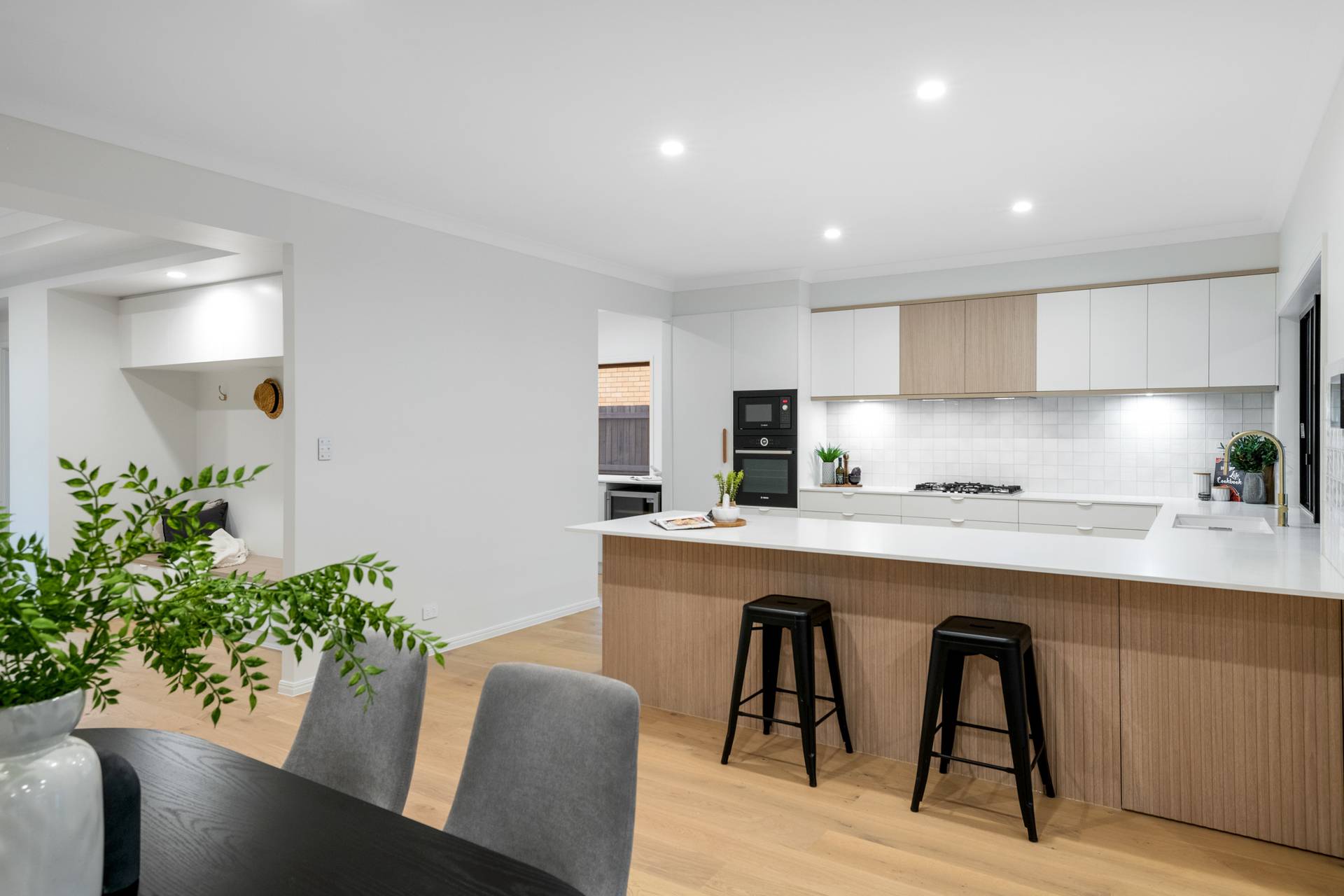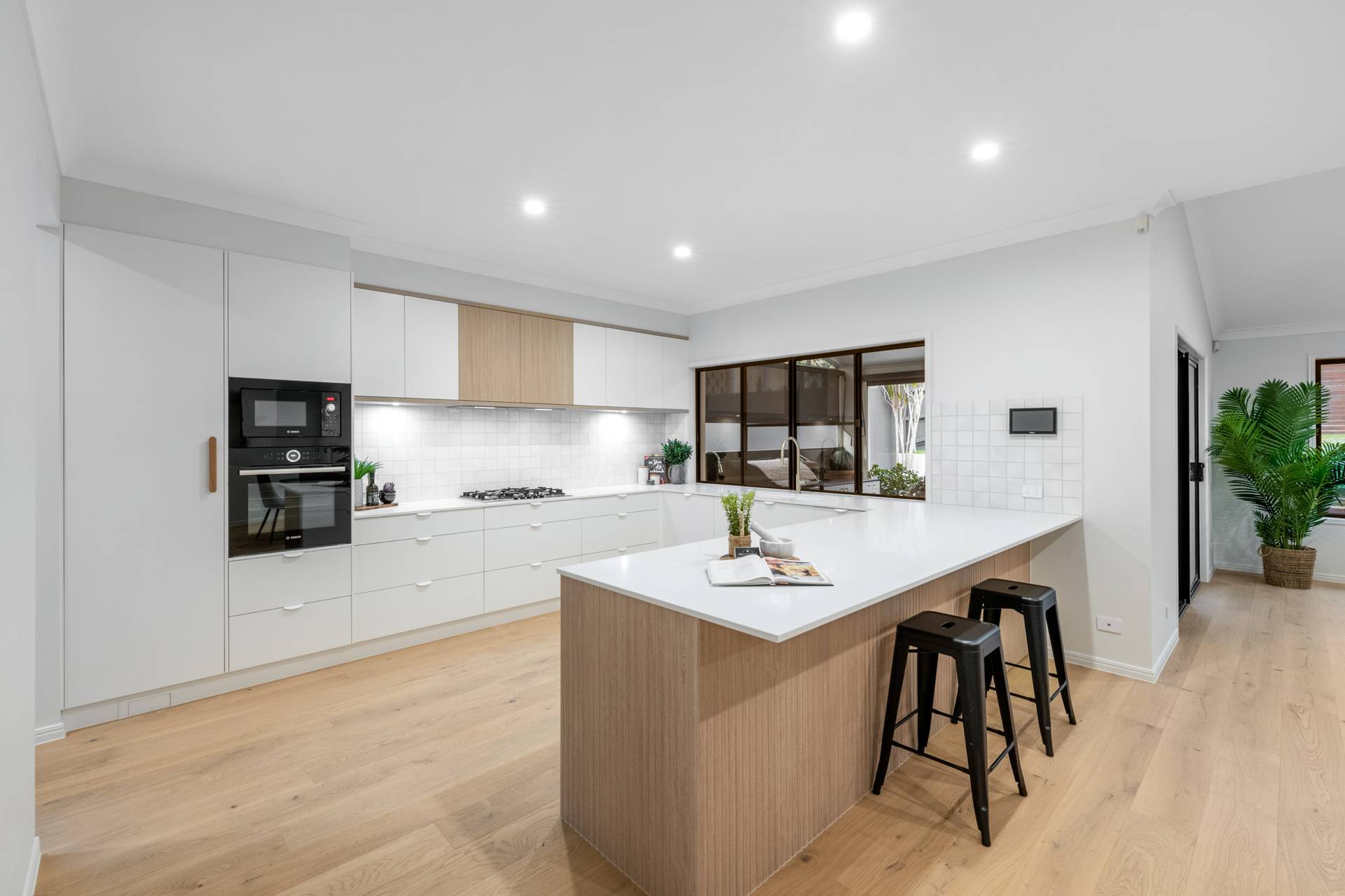 The foyer with a mudroom flows seamlessly to the media room and the separate family and dining area, offering sensational open-plan living. The oversized kitchen, with Coastal Oak Woodmatt timber cabinetry, is destined for the resident chef, and unveils a butler’s pantry, Bosch appliances, a breakfast bar and ample storage.