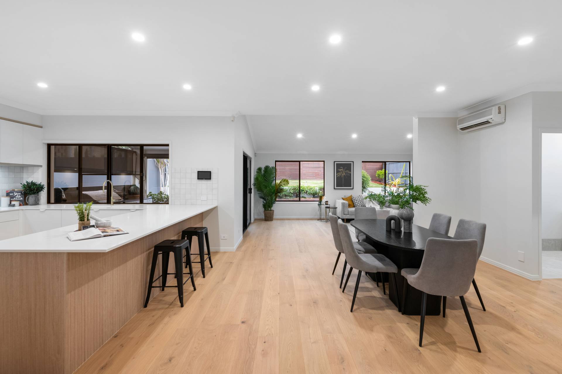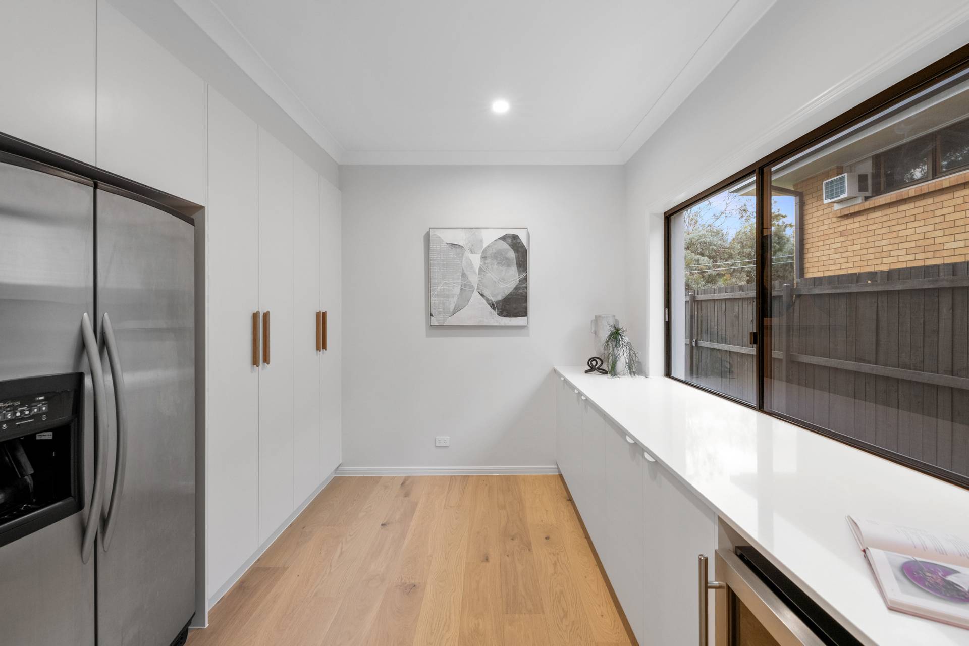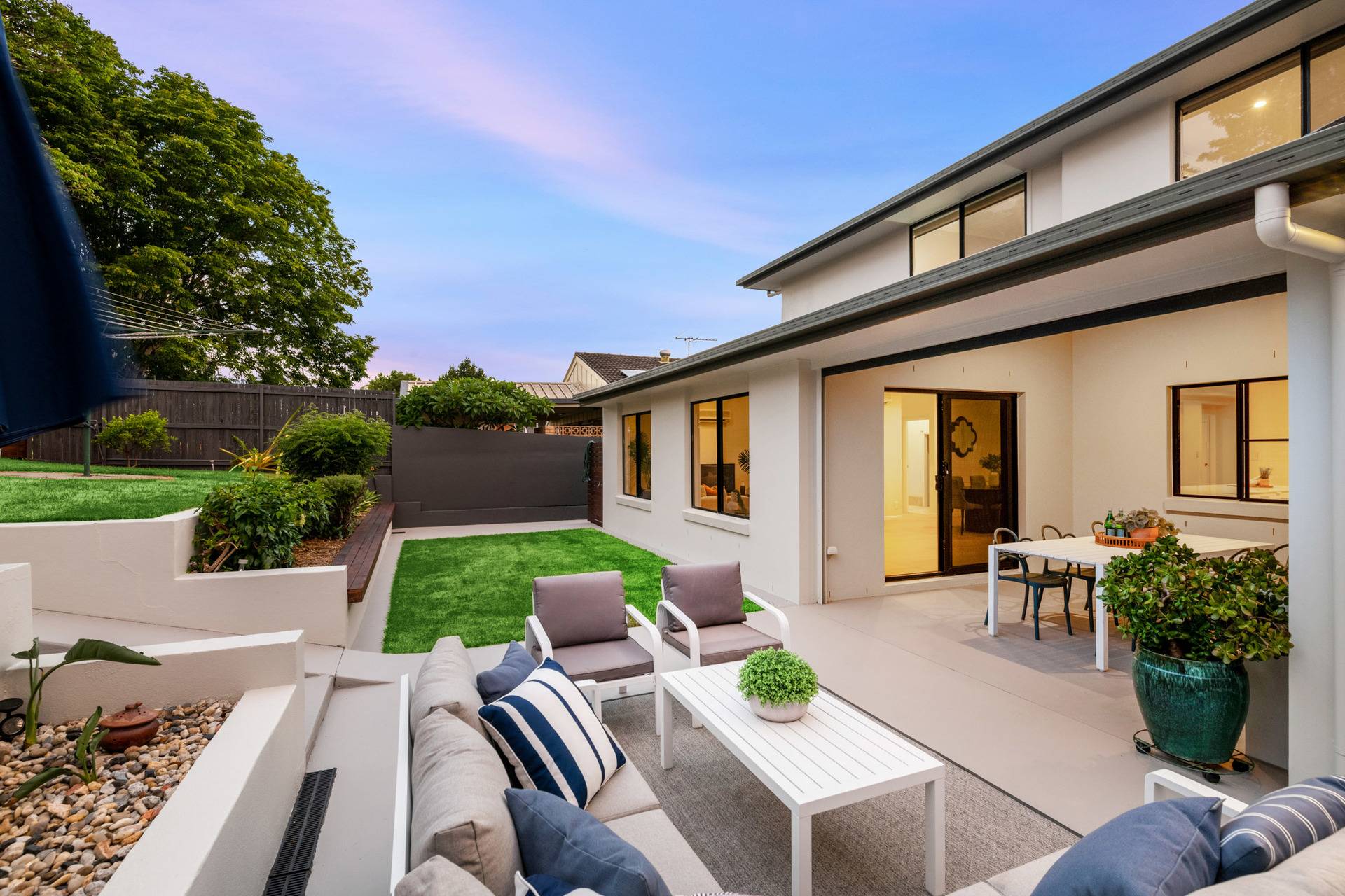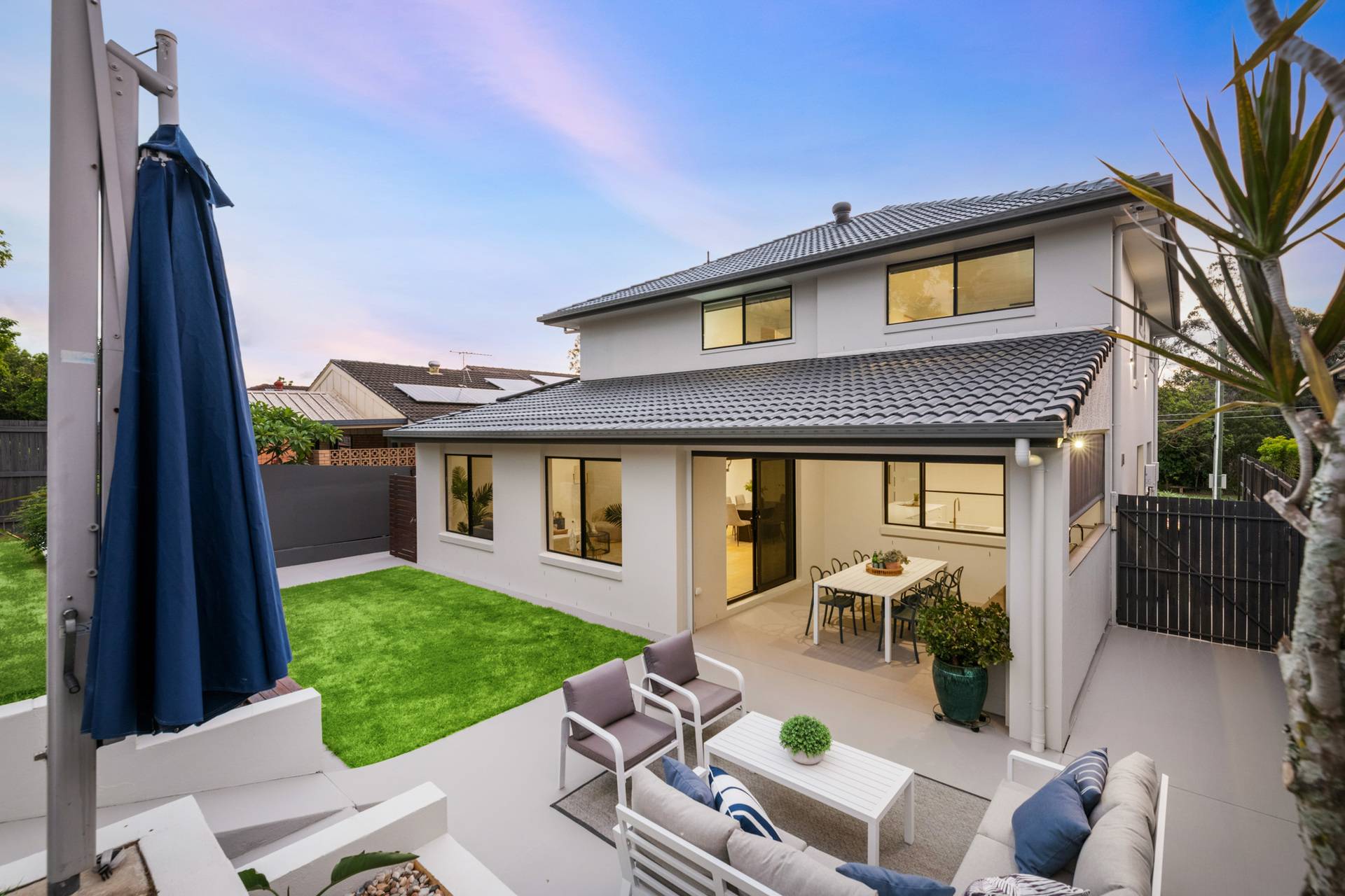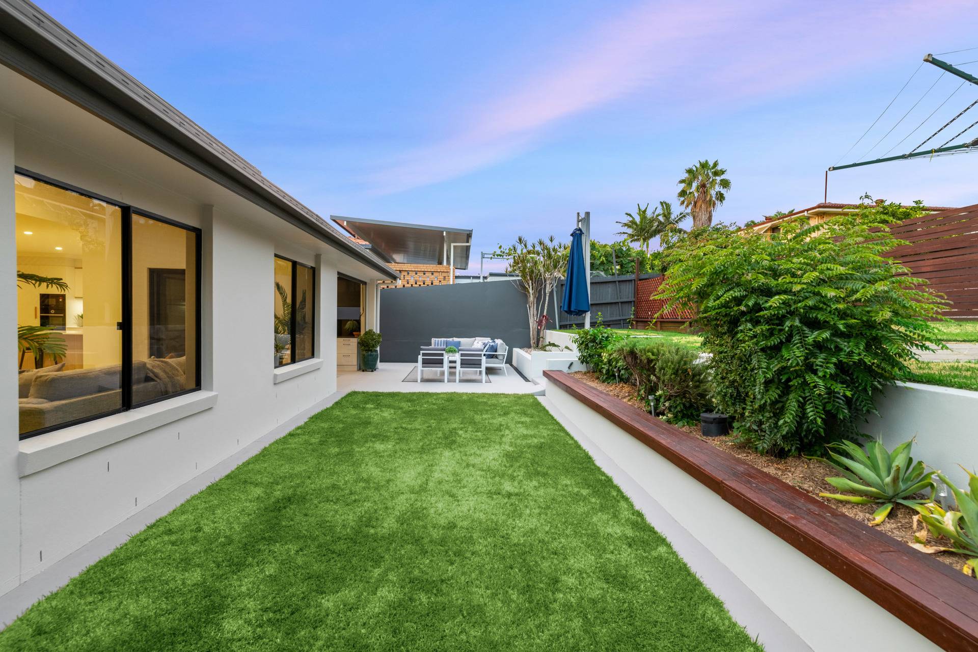 Having completed a high-end renovation, the house showcases premium inclusions and modern updates. European oak flooring and plush carpet adorn the floors, while stone benchtops, high ceilings and brass fittings evoke a sense of contemporary elegance.