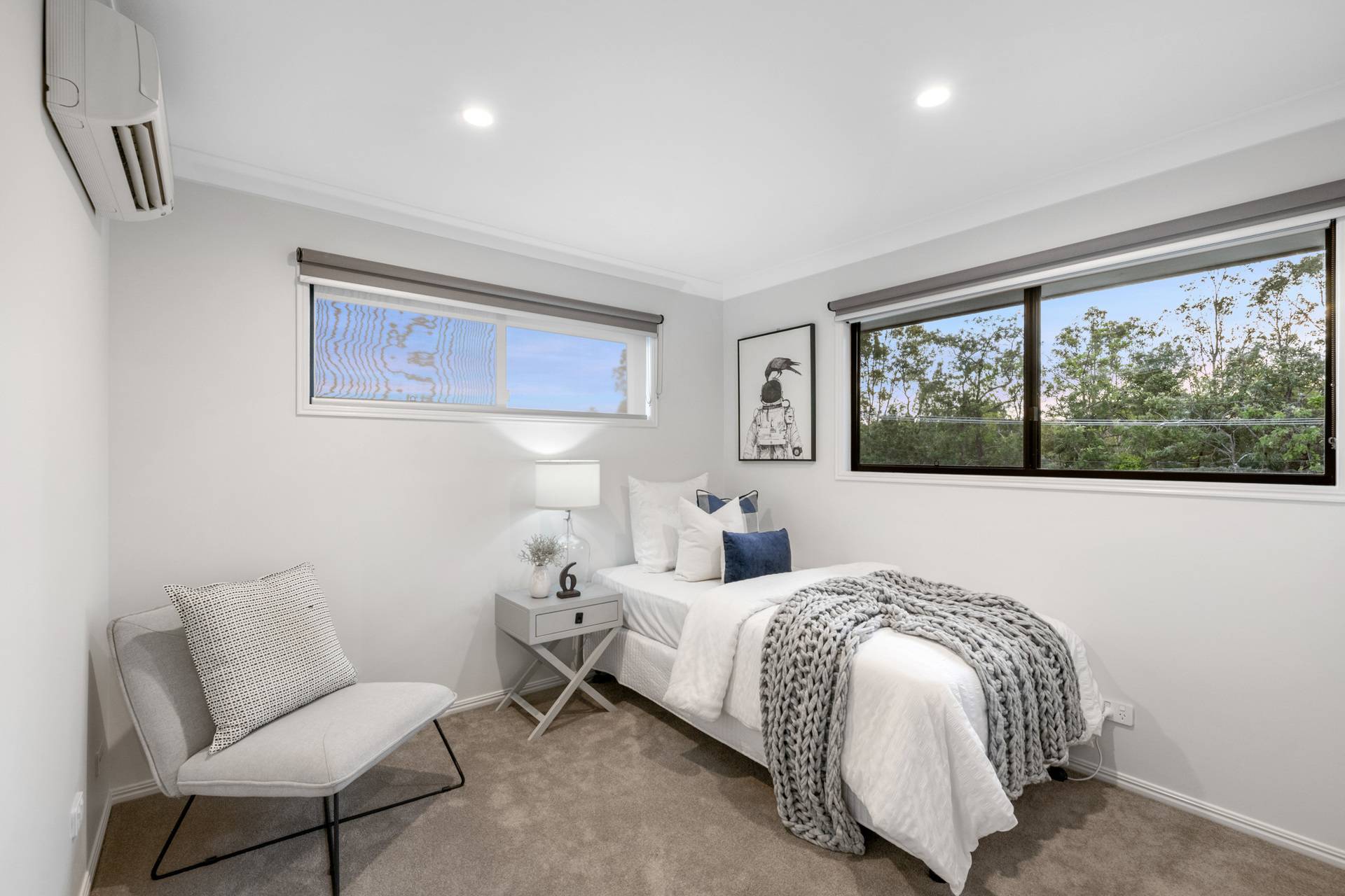 A sitting room, balcony and four bedrooms upstairs delight in tranquil tree-lined views. Parents will be captivated by the master suite, boasting a walk-in robe and ensuite featuring dual vanities and a walk-in shower. The other bedrooms include built-in robes and are serviced by the main bathroom with a luxurious freestanding bath. A fifth bedroom/study downstairs offers separation and easy access to the powder room and laundry.