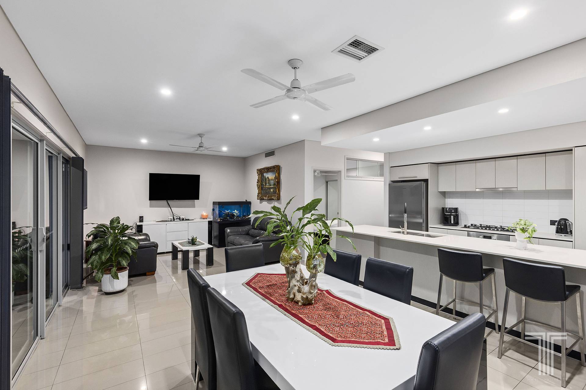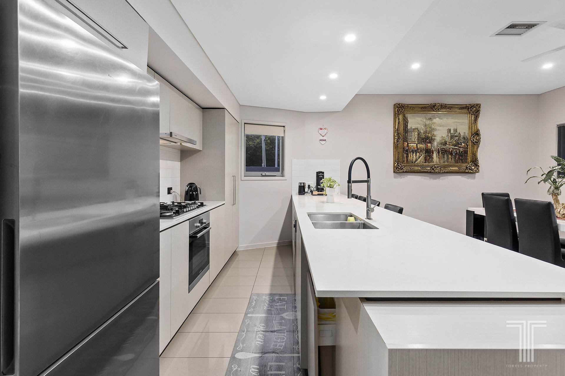 Enter inside the lower level revealing 2.7m ceilings and an open-plan lounge and dining area. Suited to everyday comfort and indoor entertaining, this living space accompanies a chef's kitchen featuring stone benchtops, soft-close cabinetry and drawers, feature tiled splashback and Bosch appliances.