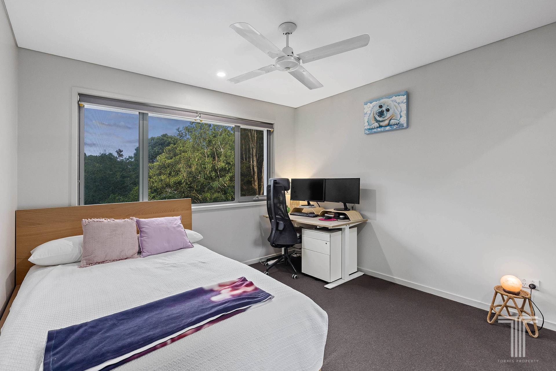 Four bedrooms span two floors and are serviced by three bathrooms, including one with a bathtub. The superb master boasts a private balcony featuring bi-fold shutters, allowing you to enjoy privacy or bask in the stunning bushland landscape. This parents' haven also reveals a walk-in robe, dual vanity ensuite and a wealth of natural light.