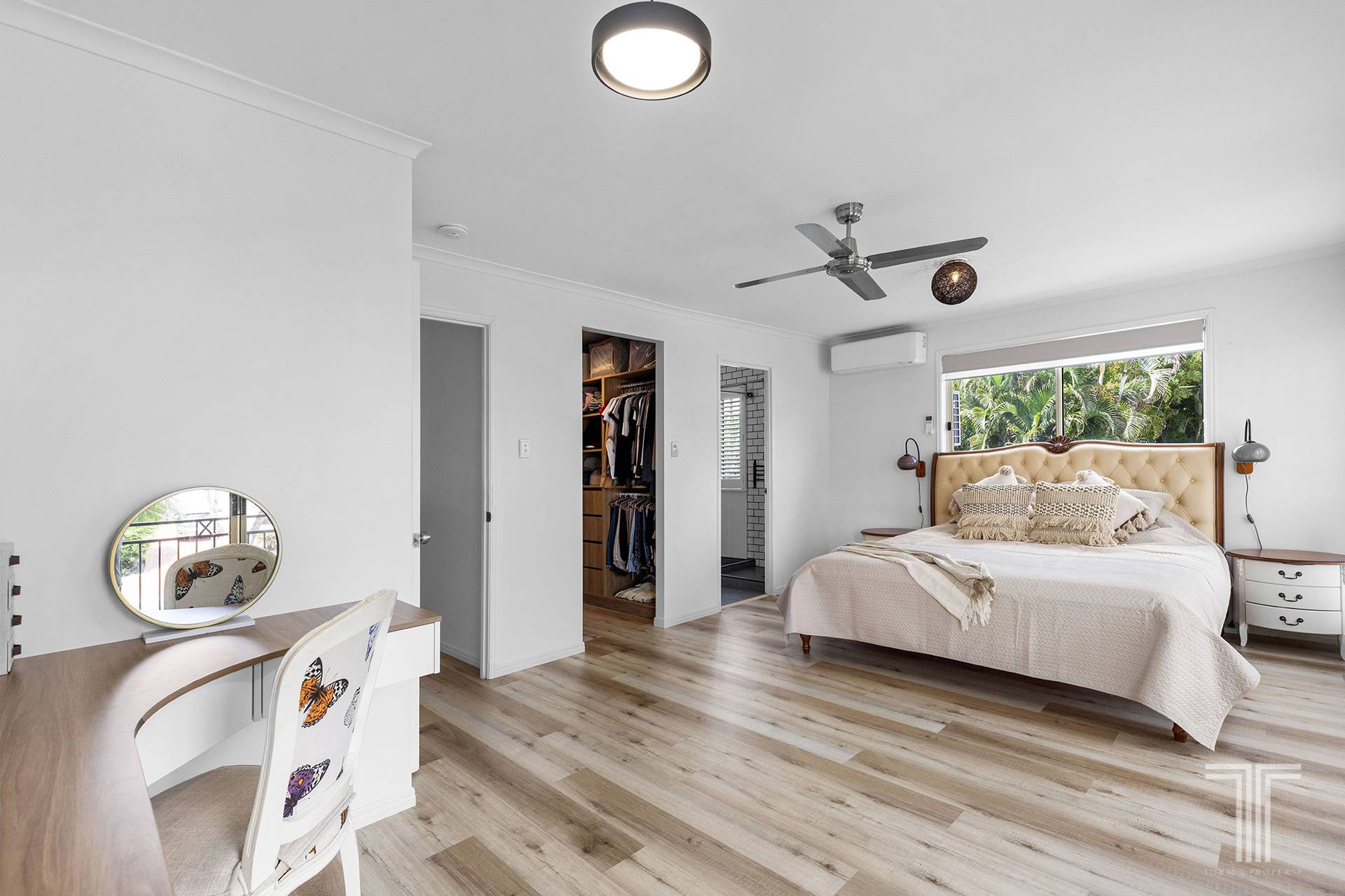 The upper level of the home features plantations shutters and boasts a second living retreat and four generous sized bedrooms. The well-proportioned Master bedroom features a large walk-in-robe, exclusive balcony and a renovated ensuite complete with feature VJ wall panelling, vogue subway tiles and black tapware.