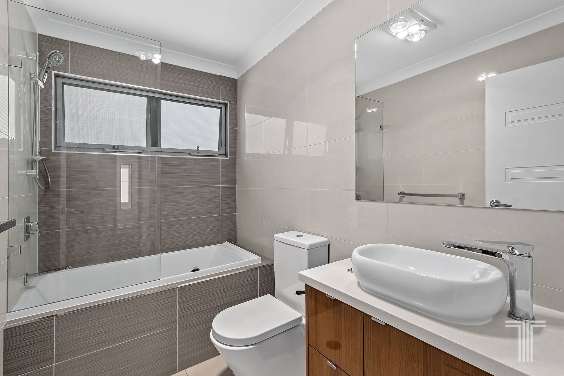 The timber staircase ascends to the upstairs bedrooms with built-in robes and two stylish stonetop bathrooms, including a master ensuite. An additional powder room is downstairs, adjacent to the remote-control single-car garage and laundry.