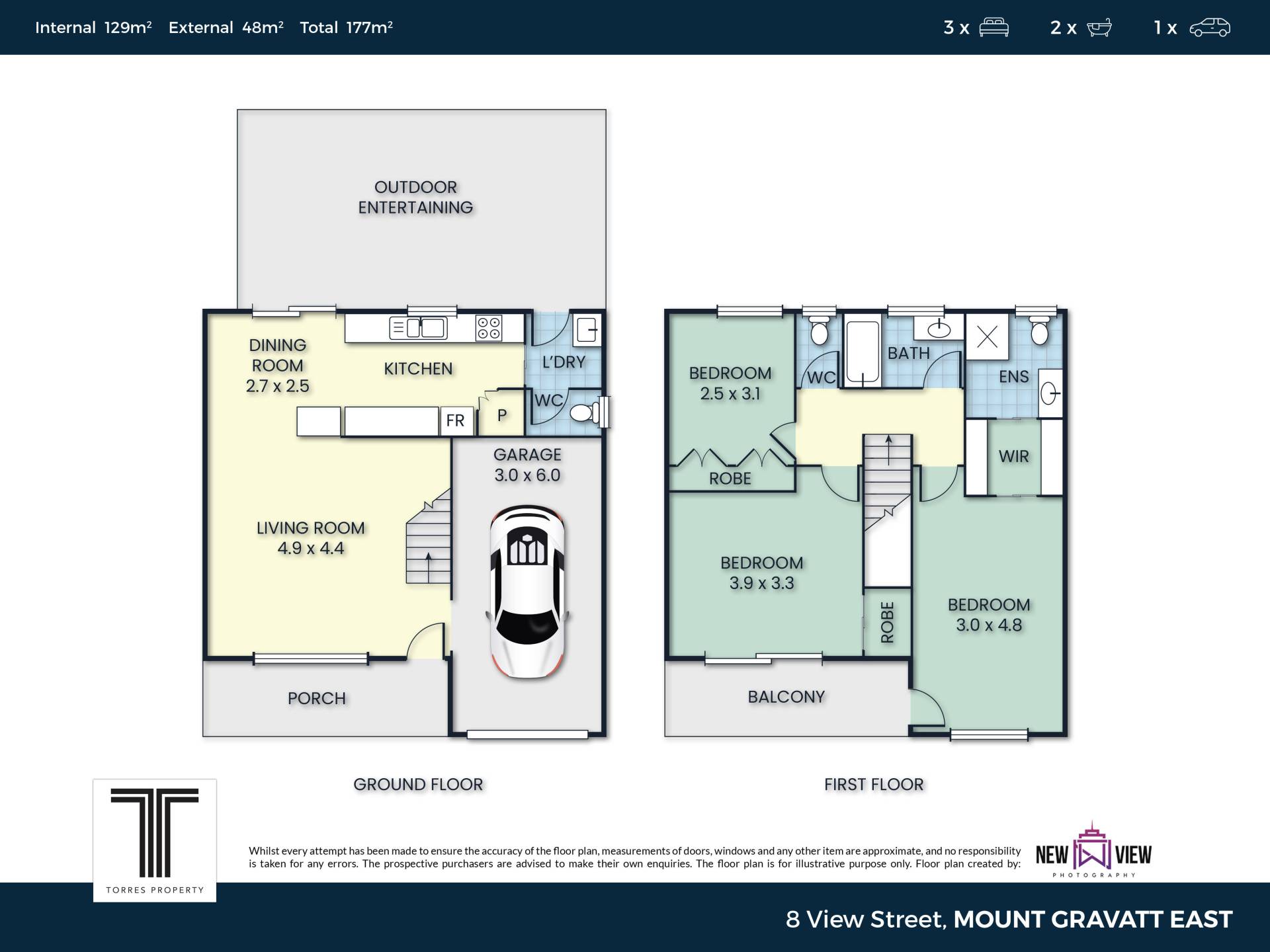 Three bedrooms and two bathrooms are upstairs. Two bedrooms open to a shared balcony, including the master with a walk-in robe and ensuite. The other bedrooms feature built-in robes and access to the main bathroom and separate toilet.