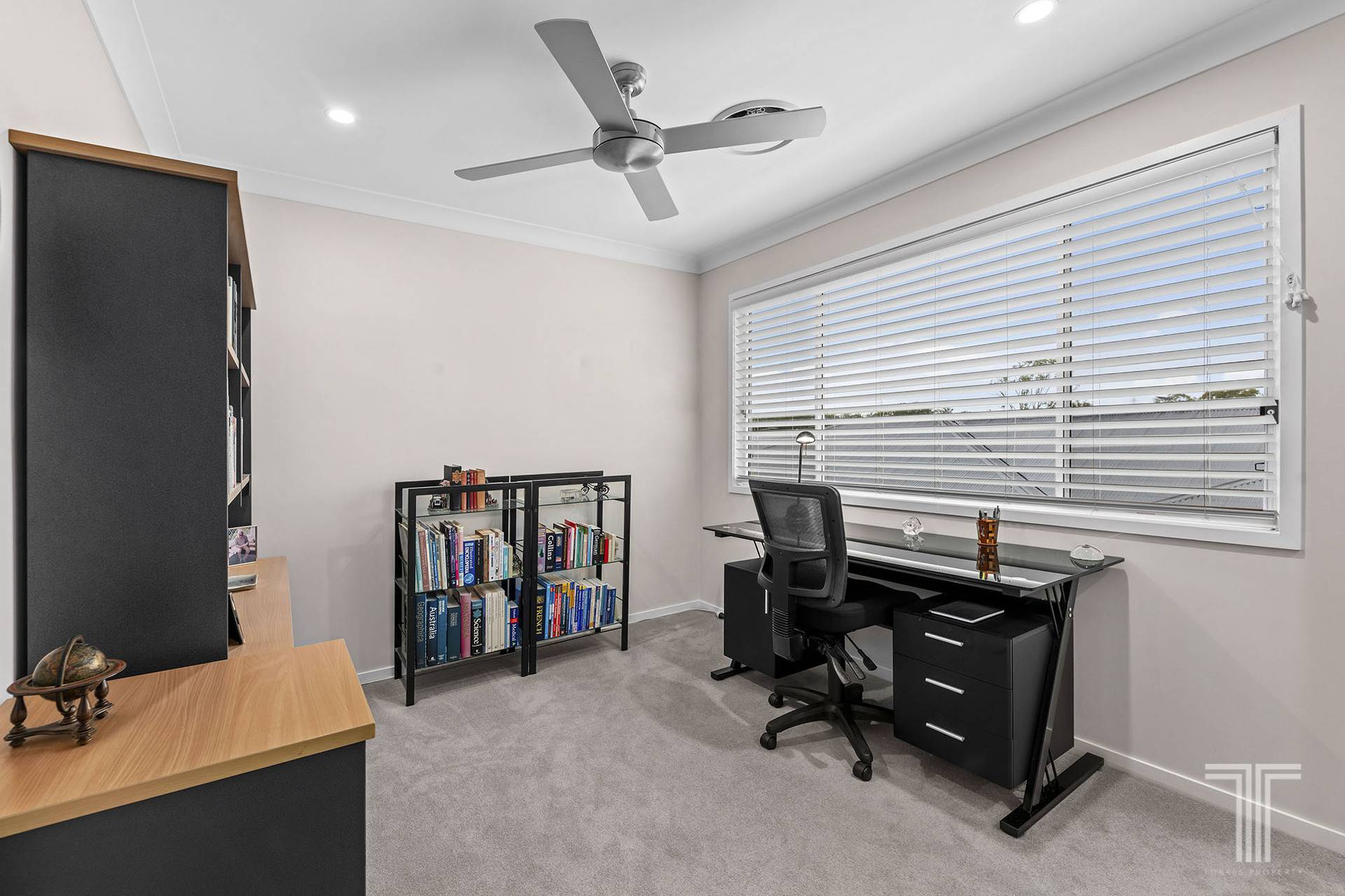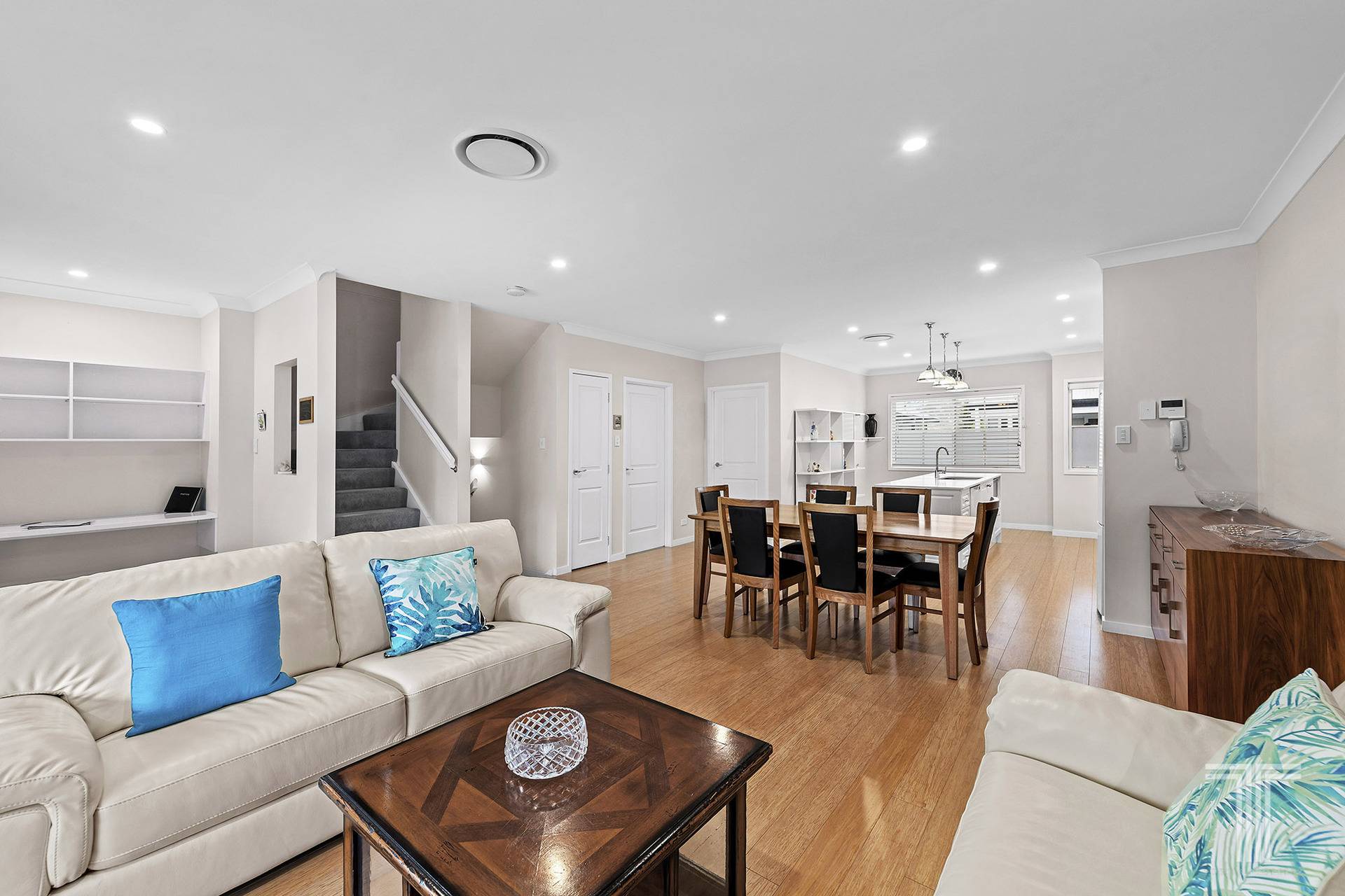 - Open-plan living and dining area featuring a built-in study nook